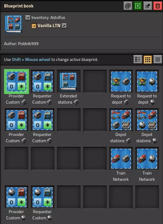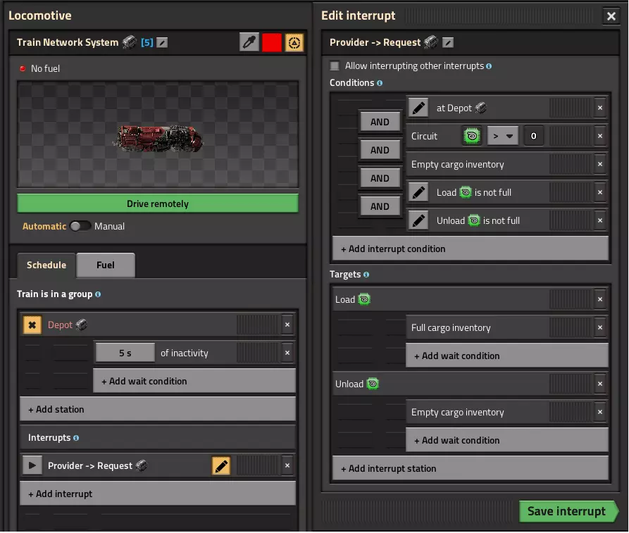 大家好。在本指南中,我将尝试解释基于中断和请求逻辑信号的火车物流系统。 更新18.11:修复了卸载站被多呼叫1列火车并在已满的车站长时间停留的错误 更新19.11:更新了液体请求站,增加了防呆保护,不会呼叫超出系统处理能力的火车 更新29.11:添加了实验性雷达站,可在多个仓库之间均匀分配请求 更新15.01:为装卸站的蓝图添加了更多参数同时对货运站和雷达站进行了修改,以尝试修复发送超出所需数量列车的漏洞。 简介 让我们从网络的组成部分开始: - 装载站 - 卸载站 - 固体货物货运站 - 液体货物货运站 - N列火车 本指南将概述如何创建一个类似LTN模组的原版火车网络。 基础 基本LTN逻辑: 我们的火车停靠在货运站中,等待轮到它们。收到请求后,所需数量的火车将按照动态生成的时刻表出发:装载→卸载→返回货运站。新基础中断系统 得益于全新的中断系统,开发者让我们能够通过配置特定的列车激活规则来动态创建列车时刻表。这使得列车更加灵活,我们不再需要为每列列车设定特定的资源类型。 所有车站和车库会通过雷达相互交换信号,以确保网络正常运行。如果你不想在整个工厂中铺设带有逻辑线路的电力线 列车 我们为列车设有两个物流网络: - 固体货物列车 - 液体货物列车 这是一款原版游戏,而非LTN,因此列车不知道自己运输的货物类型及其长度。此外,车库的设计也无法根据列车长度和货物类型进行区分。因此,我们至少需要两个用于不同类型货物的仓库,且列车长度需保持一致。 以下是列车的中断设置: