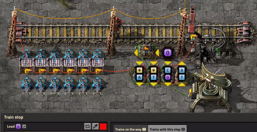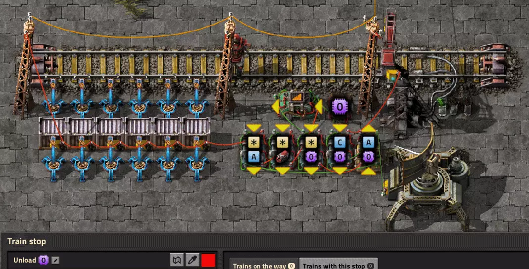 简单来说,当一列火车去执行请求时,它会一直持有请求信号,直到离开卸货站。结合车站的信号处理,这消除了多个(2个或更多)火车为了一个请求而到达装载站的问题。 其他 我想分享我的开发情况。我使用带有4节货运车厢的火车,有时会在装卸站遇到问题,这些车站无法总是均匀地装卸火车。结果,火车可能会在车站长时间停留而无所事事。你可以将逻辑连接到 inserter(机械臂)并控制均匀的装卸,但我不喜欢这样做,因为我不确定这种方法对性能的积极影响。(如果我说错了请纠正我)以下是我对假设问题的解决方案:装卸站