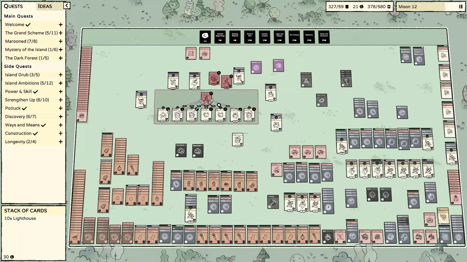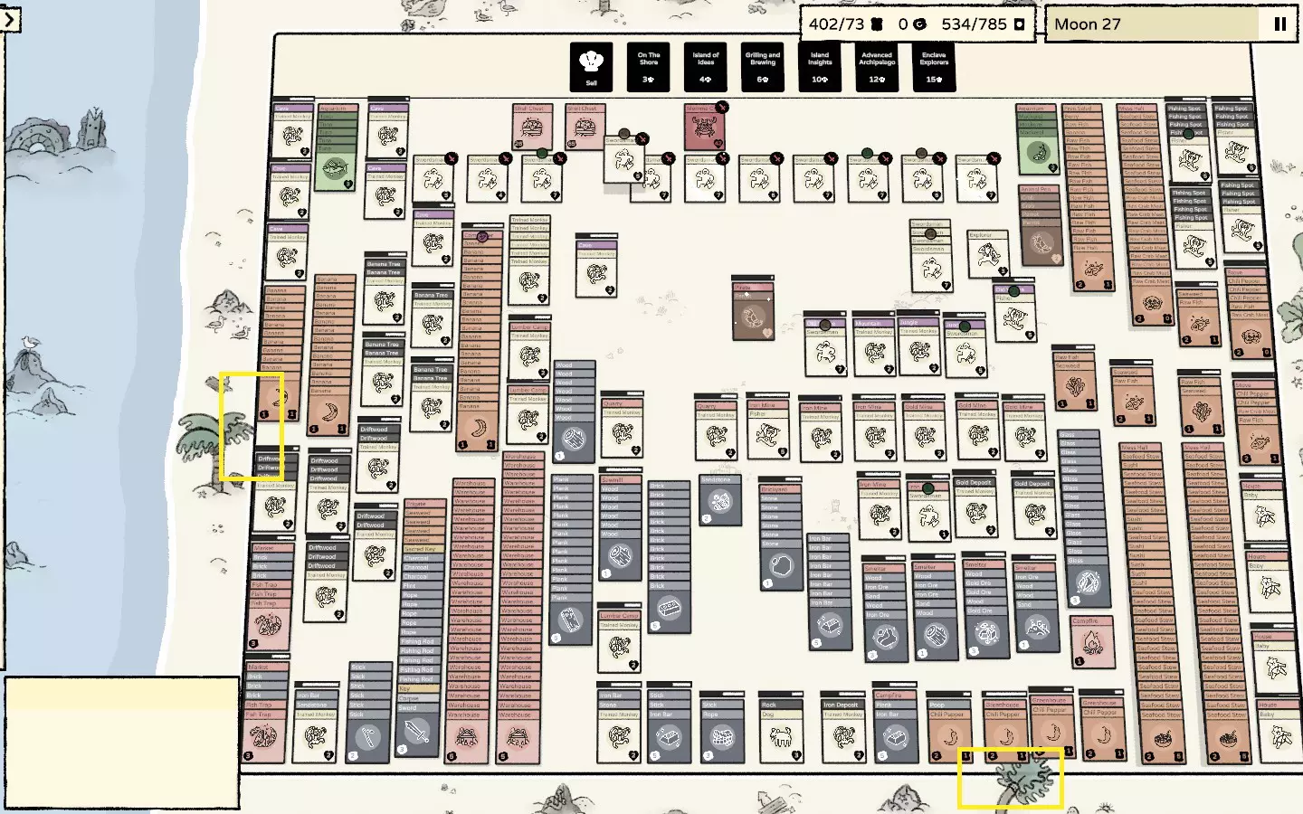 大陆预览。 30个仓库,10个灯塔。 现在10到11个灯塔应该能覆盖整个区域。 第11个灯塔带来的增益很小。 从横向31格的长度可以明显看出。 与过去相比,多亏了灯塔,现在有很多排仓库,生活变得简单多了。 过时内容:扩展区域 尽早开始生产棚屋, 一旦能够,就转向大规模建造仓库。 主大陆