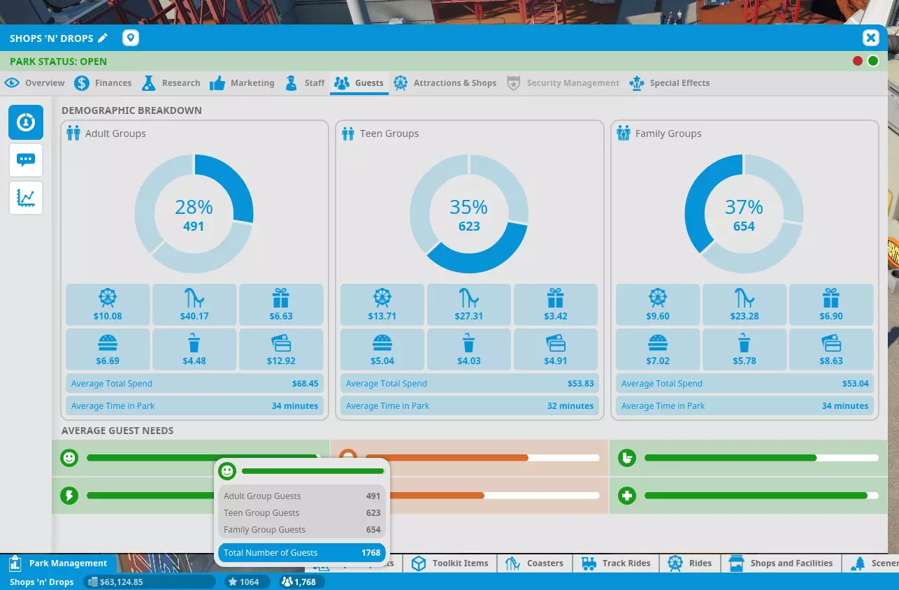 从我的人口统计图表可以看出,我吸引的最多的是家庭游客。你会发现他们在我的商店消费很高,这对我达成目标帮助很大。除了家庭游客外,成年人在这个关卡表现也不错。尽管我的公园里青少年数量更多,但成年人在商店的实际消费更高。所以要吸引这两类游客。 接下来,不要建造太多种类的商店。在我的游玩过程中,我实际上只建造了Chief Beef、Cosmic Cow Milkshake、Gulpee Slush、Hat's Fantastic和Loony Bloons。就建造这些商店吧,因为它们反正都出售价格相当高的商品。在这个场景中,你还需要设置合适的商店定价。以下是价格列表: Chief Beef 14.10美元/16.10美元 Cosmic Cow 8.20美元 Gulpee Slush 9.30美元 Hat's Fantastic 15.70美元 Loony Bloons 12.20美元 厕所 0.50美元 ATM我发现这个价格是最合适的。再高的话,你的顾客会觉得太贵了。另外,很多人建议所有附加项目都加“很多”。但我其实完全不推荐这么做。