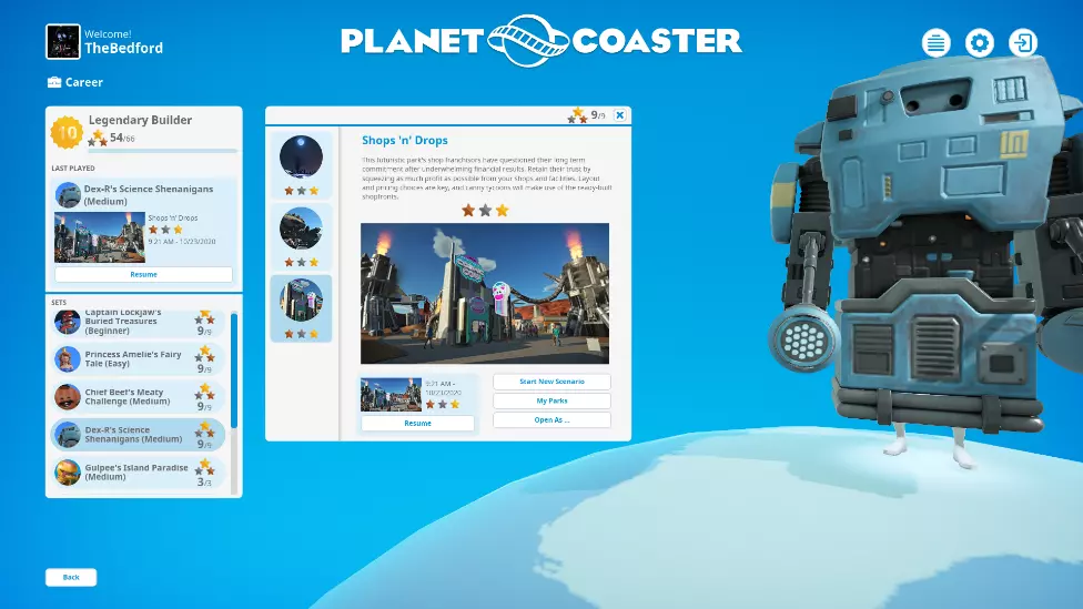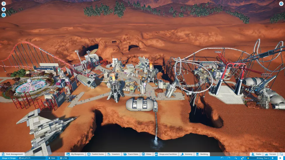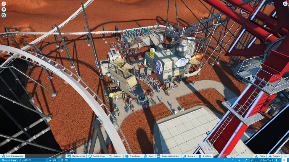 这座未来风格的公园因财务业绩不尽如人意,其商铺特许经营者已开始质疑长期合作的承诺。你需要通过尽可能从商铺和设施中榨取利润来维系他们的信任。 目标: 青铜:商铺、设施、餐厅及酒店的月利润达到2000美元,且游客数量达到500人。 白银:商铺、设施、餐厅及酒店的月利润达到4000美元,且游客数量达到1000人。 黄金:商铺、设施、餐厅及酒店的月利润达到6000美元,且公园评分达到1000分。 本关卡的核心在于通过商铺、设施、餐厅及酒店获取高额利润。本关最大的挑战是必须通过商铺、设施、餐厅及酒店实现6000美元的利润目标。实际上这是一个相当可观的数字。在我的整个游戏过程中,通常从商店和设施只能获得大约2000到3000美元。此外,公园的扩建空间也很有限。你会注意到,公园中间有一个太空垃圾场集市,里面有出租房间,入口右侧有一个相当大的扩建空间,前方还有一个小的扩建空间。所以基本上公园是狭长的形状。有限的扩建空间意味着你不能通过尽可能多地吸引游客来“欺骗”游戏,而是必须在这里运用策略。 正如我之前所说,家庭在商店和设施上的花费最多。礼品店能为你带来最大的利润,其中【Hat's Fantastic】和【Loony Blooons】是最好的选择。不要建造【纪念时刻】礼品店,那家店毫无用处。出于某些原因,【纪念时刻】的经营状况一直不好,避开它!为了吸引大量家庭游客,你需要建造温和的游乐设施。因此,将你的研究树集中在温和游乐设施和商店上。你会希望公园里有很多家庭游客。这里的第二大助力是成年游客,他们在商店和设施上的花费也很多。