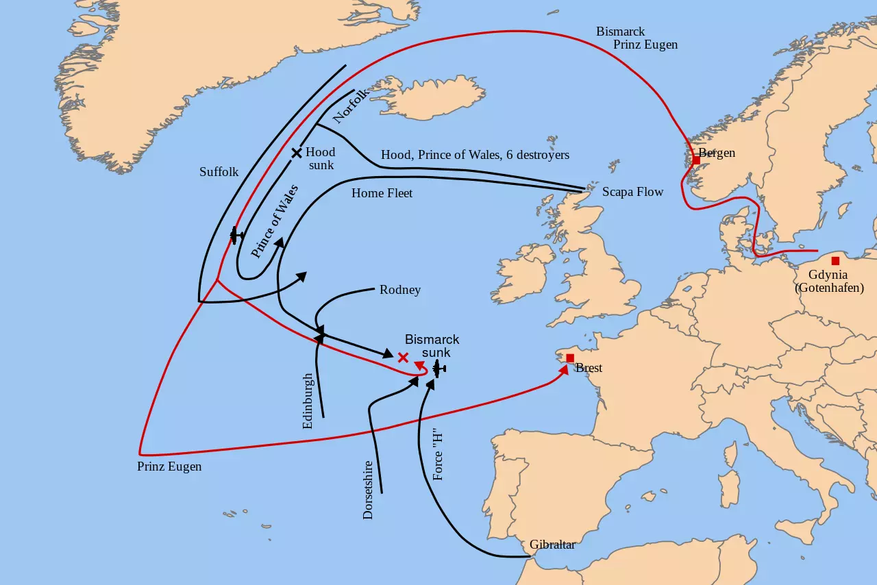 莱茵演习行动 截至1941年5月11日,“欧根亲王”号的维修工作已完成。在海军上校赫尔穆特·布林克曼的指挥下,该舰驶往格丁尼亚港,船员们在那里为其大西洋出击任务做好了准备。5月18日,“欧根亲王”号在阿尔科纳角附近与“俾斯麦”号会合。这两艘舰由三艘驱逐舰——“汉斯·洛迪”号、Z16“弗里德里希·埃科尔特”号和Z23号——以及一支扫雷艇舰队护航。德国空军在舰队驶离德国水域期间提供空中掩护。5月20日13:00左右,德国舰队遭遇瑞典巡洋舰“哥特兰”号;该巡洋舰在卡特加特海峡对德军舰队进行了两小时的跟踪。哥得兰岛向海军总部发送报告称:“两艘大型舰船、三艘驱逐舰、五艘护航舰以及10-12架飞机经过马斯特兰德,航向205°/20'。” 德国海军总司令部(OKM)并不担心哥得兰岛带来的安全风险,但吕特晏斯认为行动安全已无法保障。这份报告最终被送到英国驻瑞典海军武官亨利·德纳姆上尉手中,他随即将该信息转发给了英国海军部。