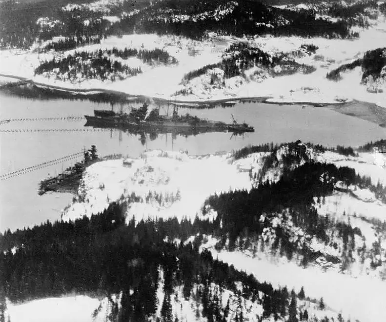 The code-breakers at Bletchley Park confirmed that an Atlantic raid was imminent, as they had decrypted reports that Bismarck and Prinz Eugen had taken on prize crews and requested additional navigational charts from headquarters. A pair of Supermarine Spitfires were ordered to search the Norwegian coast for the German flotilla. On the evening of 20 May, Prinz Eugen and the rest of the flotilla reached the Norwegian coast; the minesweepers were detached and the two raiders and their destroyer escorts continued north. The following morning, radio-intercept officers on board Prinz Eugen picked up a signal ordering British reconnaissance aircraft to search for two battleships and three destroyers northbound off the Norwegian coast. At 7:00 on the 21st, the Germans spotted four unidentified aircraft that quickly departed. Shortly after 12:00, the flotilla reached Bergen and anchored at Grimstadfjord. While there, the ships' crews painted over the Baltic camouflage with the standard "outboard gray" worn by German warships operating in the Atlantic. While in Bergen, Prinz Eugen took on 764 t of fuel; Bismarck inexplicably failed to similarly refuel. At 19:30 on 21 May, Prinz Eugen, Bismarck, and the three escorting destroyers left port.[23] By midnight, the force was in the open sea and headed toward the Arctic Ocean. At this time, Admiral Raeder finally informed Hitler of the operation, who reluctantly allowed it to continue as planned. The three escorting destroyers were detached at 04:14 on 22 May, while the force steamed off Trondheim. At around 12:00, Lütjens ordered his two ships to turn toward the Denmark Strait to attempt the breakout into the open waters of the Atlantic. By 04:00 on 23 May, Lütjens ordered Prinz Eugen and Bismarck to increase speed to 27 knots (50 km/h; 31 mph) to make the dash through the Denmark Strait. Upon entering the Strait, both ships activated their FuMO radar detection equipment sets. Bismarck led Prinz Eugen by about 700 m; mist reduced visibility to 3,000 to 4,000 m. The Germans encountered some ice at around 10:00, which necessitated a reduction in speed to 24 knots (44 km/h; 28 mph). Two hours later, the pair had reached a point north of Iceland. The ships were forced to zigzag to avoid ice floes. At 19:22, hydrophone and radar operators aboard the German warships detected the cruiser HMS Suffolk at a range of approximately 12,500 m (41,000 ft). Prinz Eugen's radio-intercept team decrypted the radio signals being sent by Suffolk and learned that their location had indeed been reported. Admiral Lütjens gave permission for Prinz Eugen to engage Suffolk, though the captain of the German cruiser could not clearly make out his target and so held fire. Suffolk quickly retreated to a safe distance and shadowed the German ships. At 20:30, the heavy cruiser HMS Norfolk joined Suffolk, but approached the German raiders too closely. Lütjens ordered his ships to engage the British cruiser; Bismarck fired five salvoes, three of which straddled Norfolk and rained shell splinters on her decks. The cruiser laid a smoke screen and fled into a fog bank, ending the brief engagement. The concussion from the 38 cm guns disabled Bismarck's FuMo 23 radar set; this prompted Lütjens to order Prinz Eugen to take station ahead so she could use her functioning radar to scout for the formation. The British cruisers tracked Prinz Eugen and Bismarck through the night, continually relaying the location and bearing of the German ships. Battle of the Denmark Strait The harsh weather broke on the morning of 24 May, revealing a clear sky. At 05:07 that morning, hydrophone operators aboard Prinz Eugen detected a pair of unidentified vessels approaching the German formation at a range of 20 nmi (37 km; 23 mi), reporting "Noise of two fast-moving turbine ships at 280° relative bearing!". At 05:45, lookouts on the German ships spotted smoke on the horizon; these turned out to be from Hood and Prince of Wales, under the command of Vice Admiral Lancelot Holland. Lütjens ordered his ships' crews to battle stations. By 05:52, the range had fallen to 26,000 m and Hood opened fire, followed by Prince of Wales a minute later. Hood engaged Prinz Eugen, which the British thought to be Bismarck, while Prince of Wales fired on Bismarck.