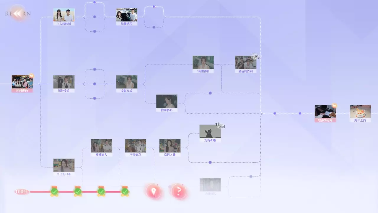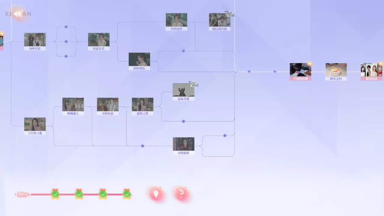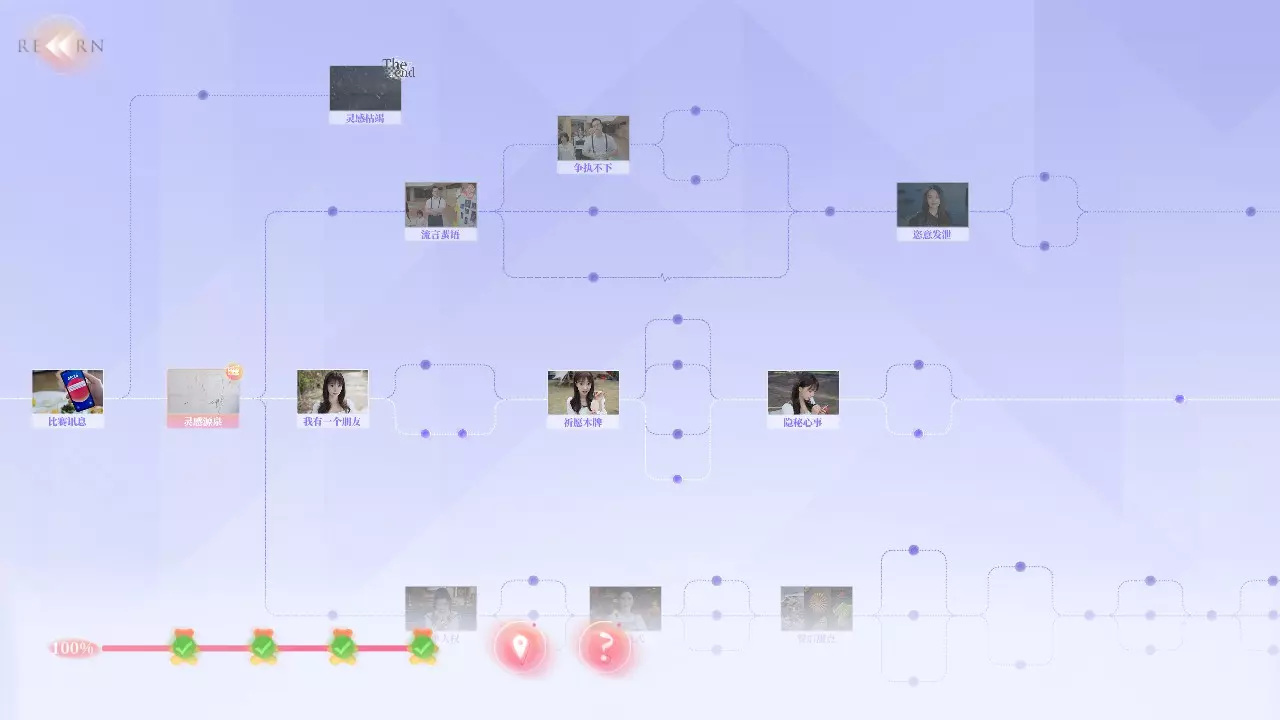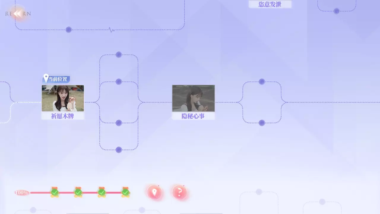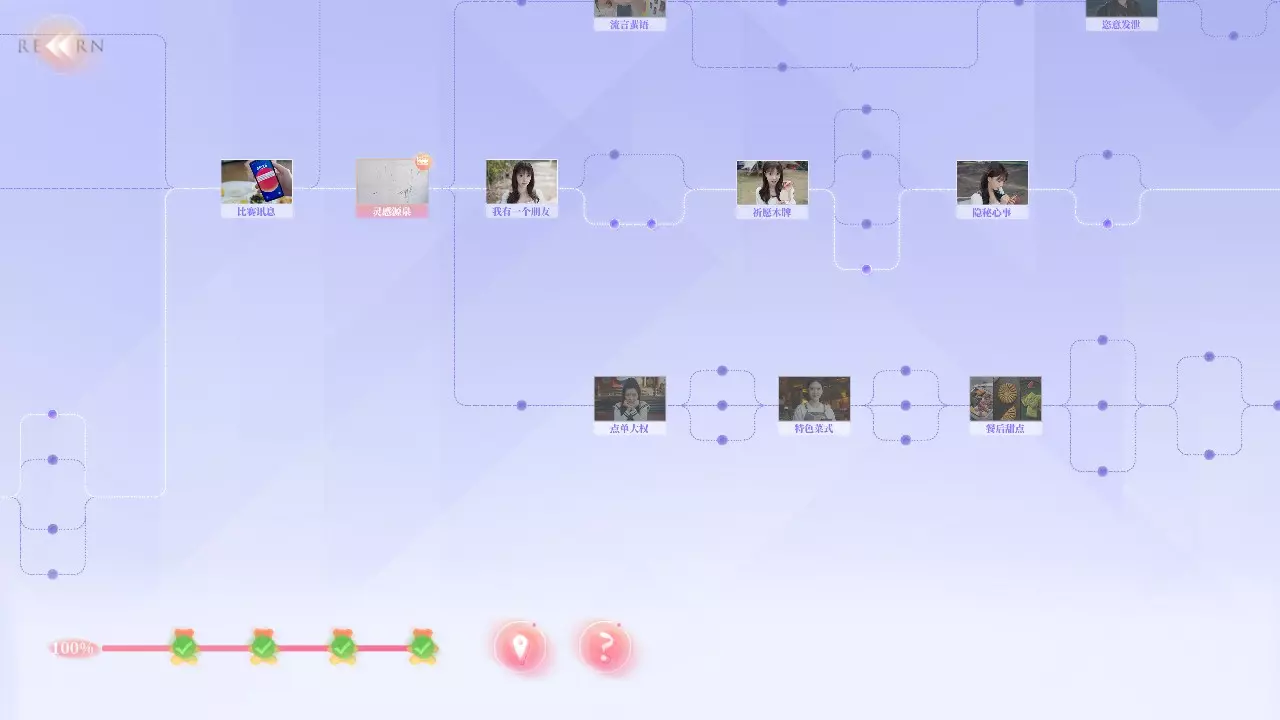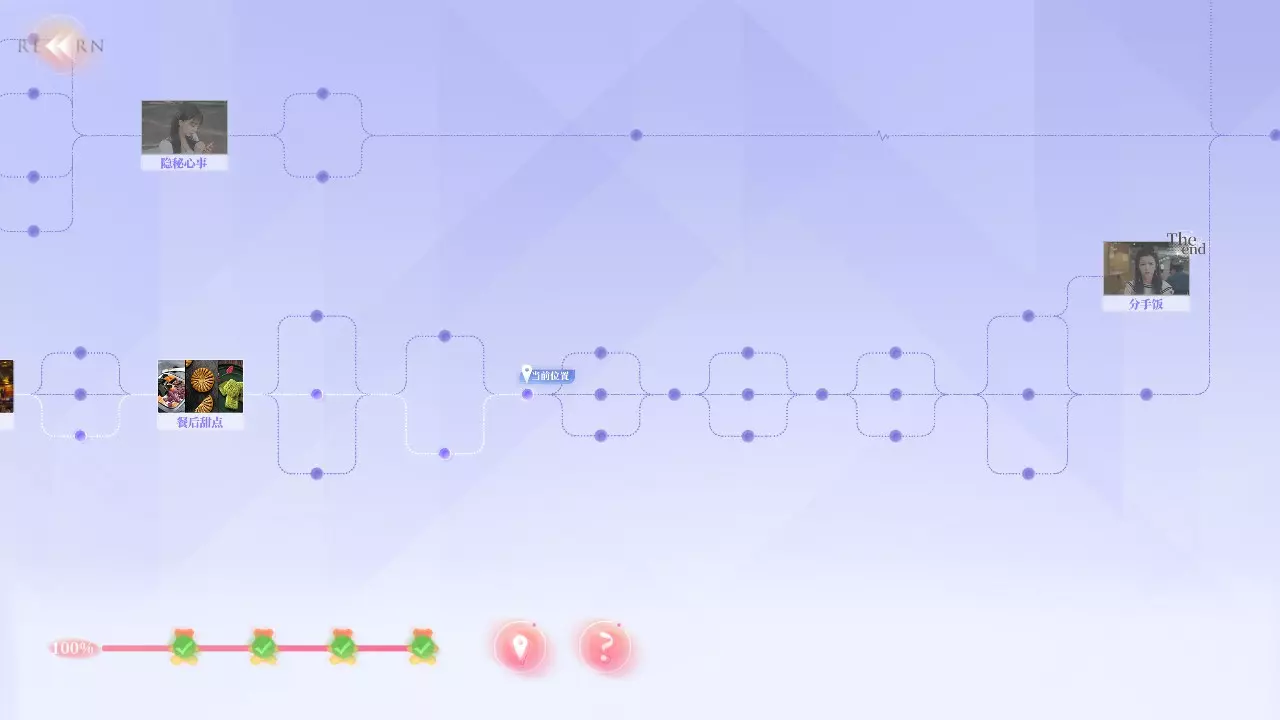 Q2:为什么不能使用快进功能? A2:你需要曾经完成过的剧情才能使用快进,但在部分剧情中无法快进。例如:夏天拍照时,即使上一次拍好了,下一次拍丑了,返回一开始时无法快进,需要重拍。 Q3:为什么我的探索度不满? A3:在部分选择时,有的剧情是通过消耗选择时长来解锁,或者需要在特定好感度内才能达成部分故事结果。例如:夏天开始时的三个选项中,如果在读条结束时未做出选择,则解锁新剧情;又或者在最后【哭泣的女人】成就时,需要与夏天好感不足来触发结局。 游戏界面