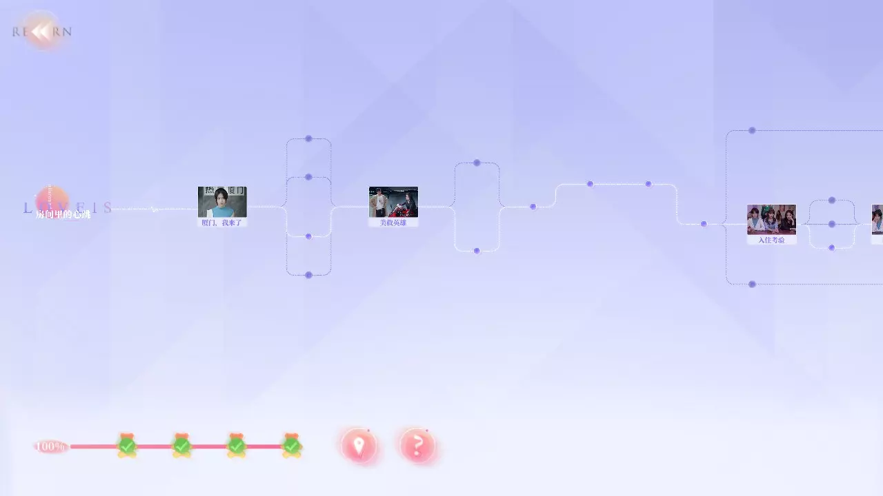 你可以将通过完成故事章节和成就获取的小熊送给你喜欢的角色。 未完待续,后续可能会推出新内容,也可能会以DLC形式更新。 影集: 1. 相册DLC中包含许多具有纪念意义的照片,完成与夏天的拍照后,你拍摄的照片也会保存在这里,你可以选择位置将其保存到自己的电脑中。 2. 心动瞬间记录着结局动画或结局后的故事,引人无限遐想。 3. 花絮记录了该作品拍摄时三位女主的幕后花絮。 设置: 可在此调整游戏窗口、语言、是否开启男主语音、游戏亮度、游戏音量及游戏按键音效。指南使用说明 好感度变化每个剧情选项后面的(无变化、+、-)代表好感度变化程度。 由于许多时候的好感度增长值无法以肉眼形式发现,有的是大量增加,但心心的大小不仔细分辨很难看清。由于DLC没有好感度拉满即为速通的结局,只有部分好感度降低到足够低时,触发特定情况,才会有直通失败结局,所以在这里不做好感度大量增加或大量减少的变化程度的展示(特定情况会以++、--形式表达大量增加或减少)。个别特殊结局会在最后展示选择顺序。如果有朋友发现了每个选项的好感度增长值不同,也欢迎提供,我会对此指南的好感度增长进行重新标注。隐藏结局失败原因:使用返回跳跃选择时,可能会导致前面的选择被自动更换。 建议:如果一直无法解锁隐藏结局,只使用Q快进,避免之前的选项被自动更改。 对话选项说明:游戏选项编号从左到右依次为1、2、3、4……以此类推。 举例说明:指南中出现【选择顺序121】,代表连续场景的选择方式为第一个场景选1,第二个场景选2,第三个场景选1。 基本情况了解得差不多了,那我们开始这次的厦门之旅吧~ 房间里的心跳(上) 厦门,我来了