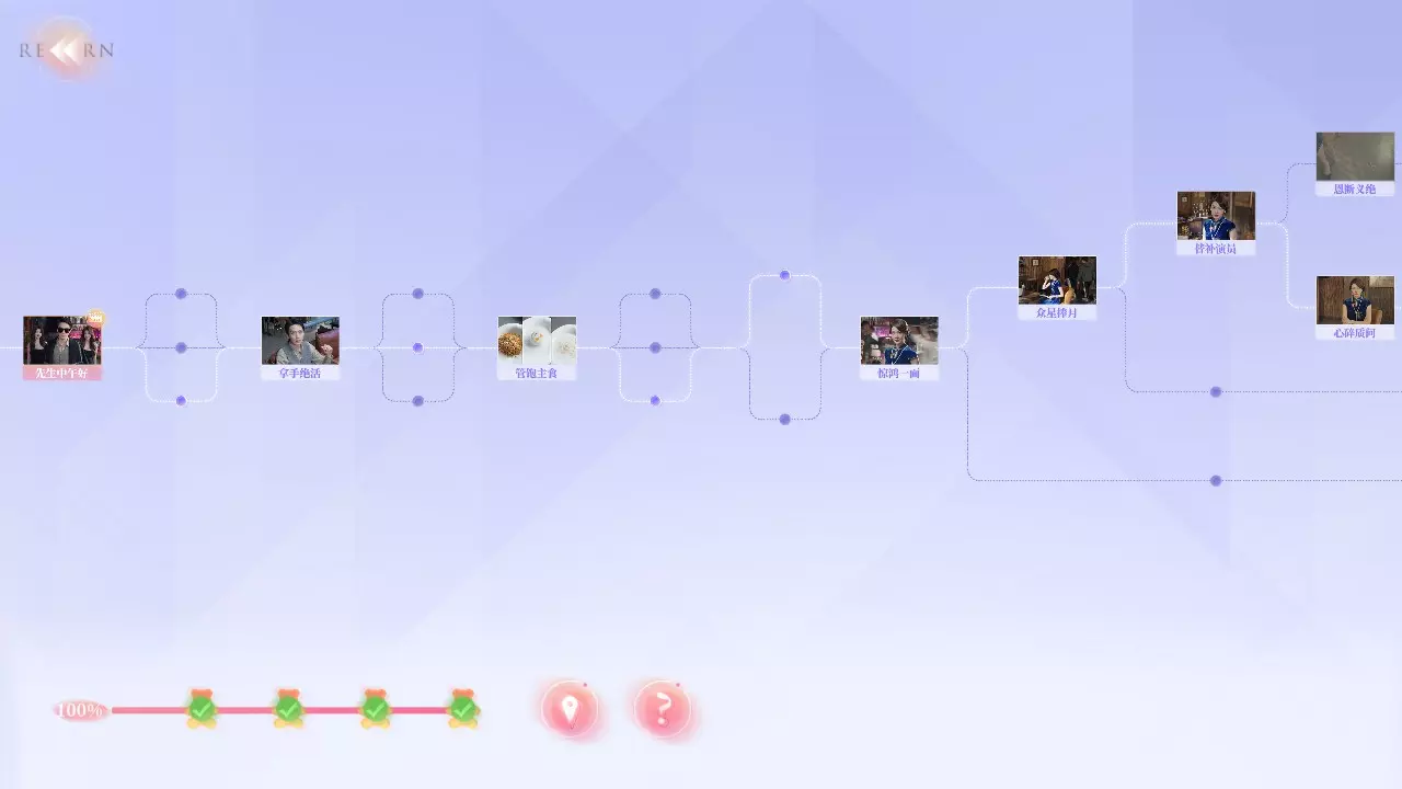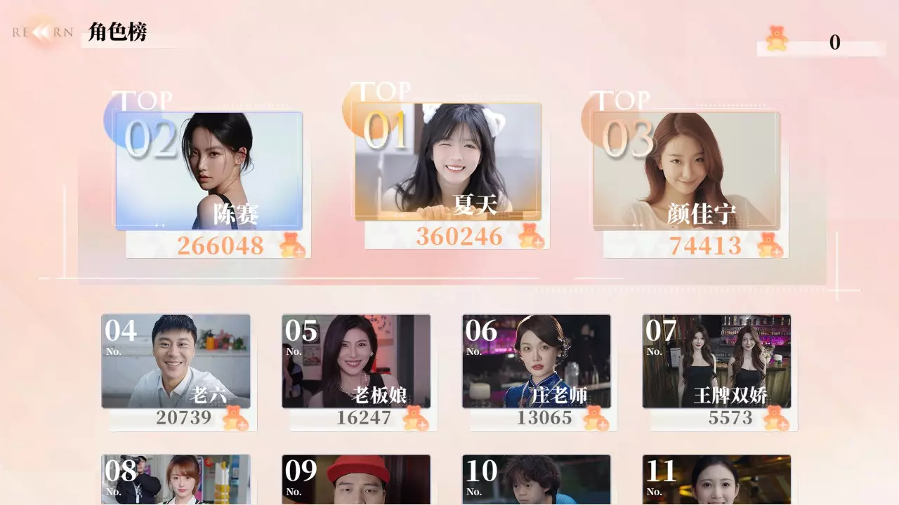 故事线:开始故事旅程,可以随时返回更改选项。 已经完成的剧情内容才能使用剧情跳过。 资料馆: 1. 成就:完成成就后可在此领取小熊。 2. 档案:女主角们的个人介绍。 排行榜: 1. 角色榜