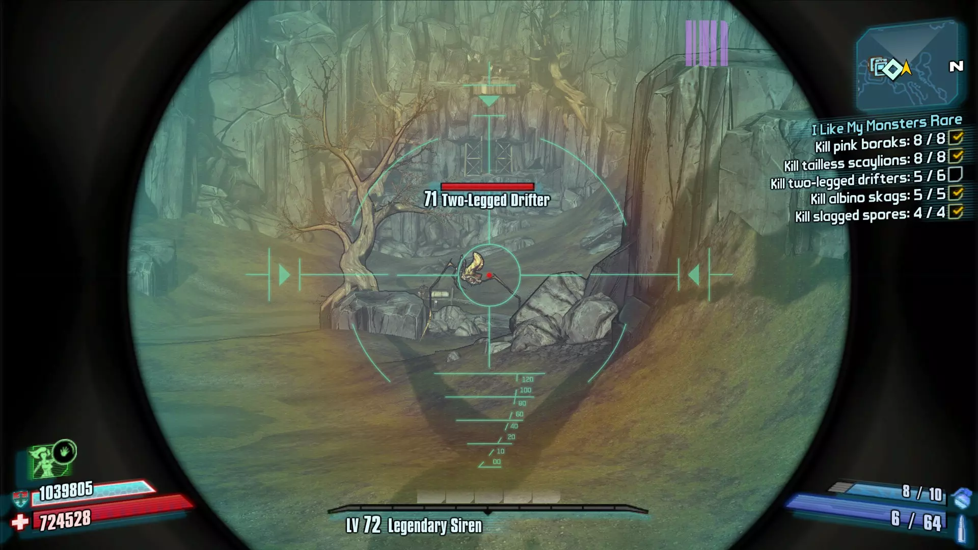 好了,以上就是全部内容,希望这份“指南”能帮助你找到这些东西。这是我的第一篇Steam指南,所以请不要对它太苛刻;如果这份指南遗漏了某些内容或包含错误信息,请告诉我。感谢你阅读本文,祝你狩猎愉快! 【UVHM 更新】 最近我在终极 Vault猎人模式(UVHM)中尝试了这个任务,由于没人和我一起玩,我就用了OP0难度,这让事情简单了不少。我注意到这里会刷出其他的精英变种生物,而不是稀有生物。因此我建议你利用退出/加载的方法,虽然不推荐盖奇使用,但这能节省不少时间。 如果你看到部落成员或其他生物在和你的目标打架(出于某种原因,这在UVHM中很常见),你可以要么干掉干扰者,要么等它们打完。本任务中的稀有生物比普通变种拥有更高(或高得多)的生命值,即使用蜜蜂护盾也需要一些时间才能击杀。你至少需要造成最后一击才能算作击杀,但通常稀有生物会战胜其他敌人,无需担心抢怪。