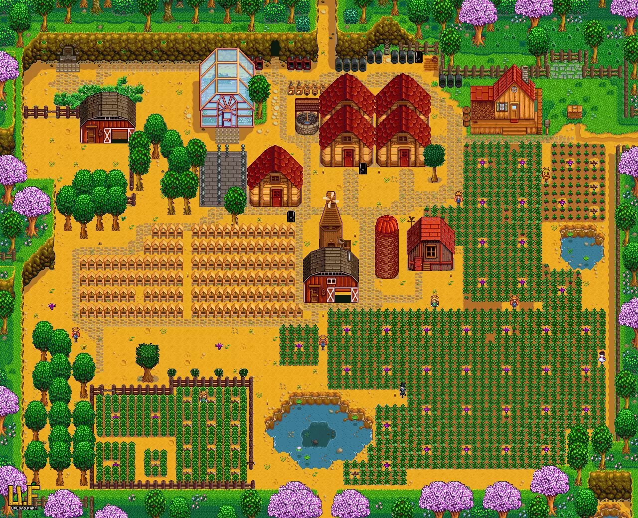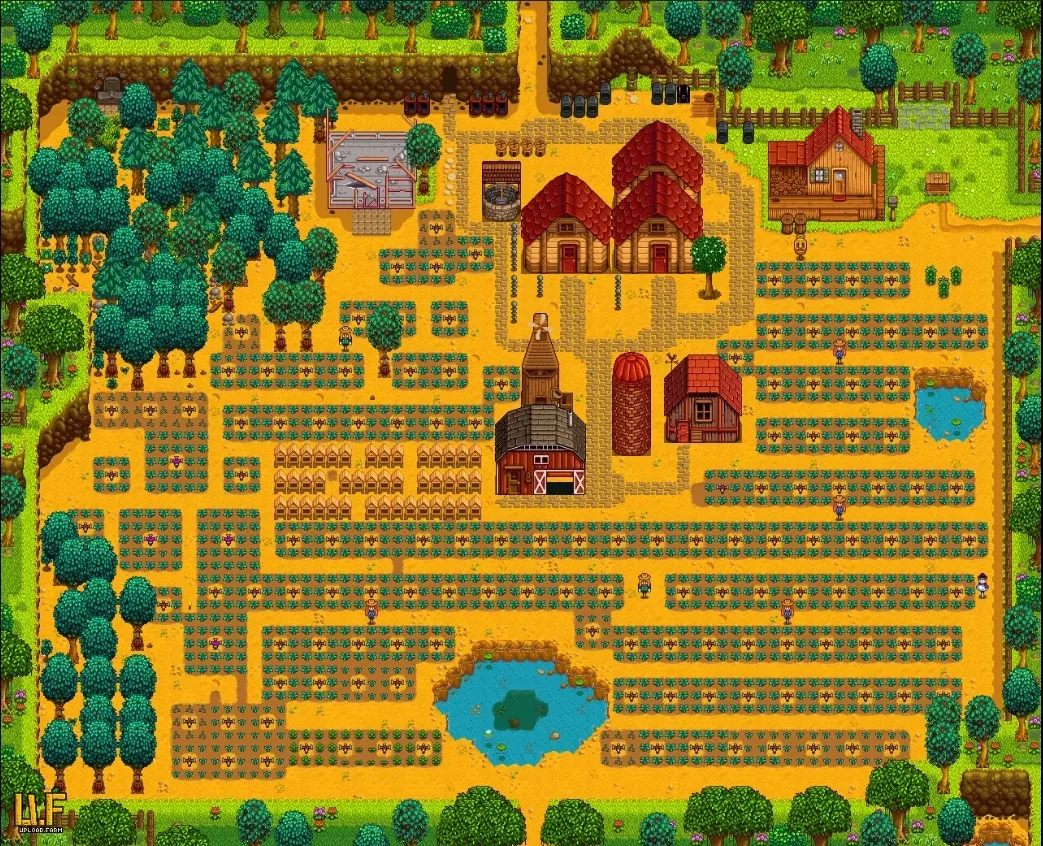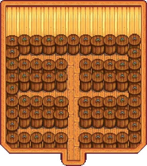 最佳地下室布局,125个可使用的酒桶 当你获得地下室和酒桶后,应开始将最昂贵的酒从酒桶中循环放入木桶陈酿,以实现利润最大化。可以回想一下彩票的类比,但这里增加了一个层次。 水中有铱 你第三年的另一个目标是将洒水器设施升级为铱制洒水器。为了缓解获取铱的缓慢且艰难的过程,你可以每周五去下水道找科罗布斯,以10000g的价格购买一个铱制洒水器。 很快你的农场就会从这样: