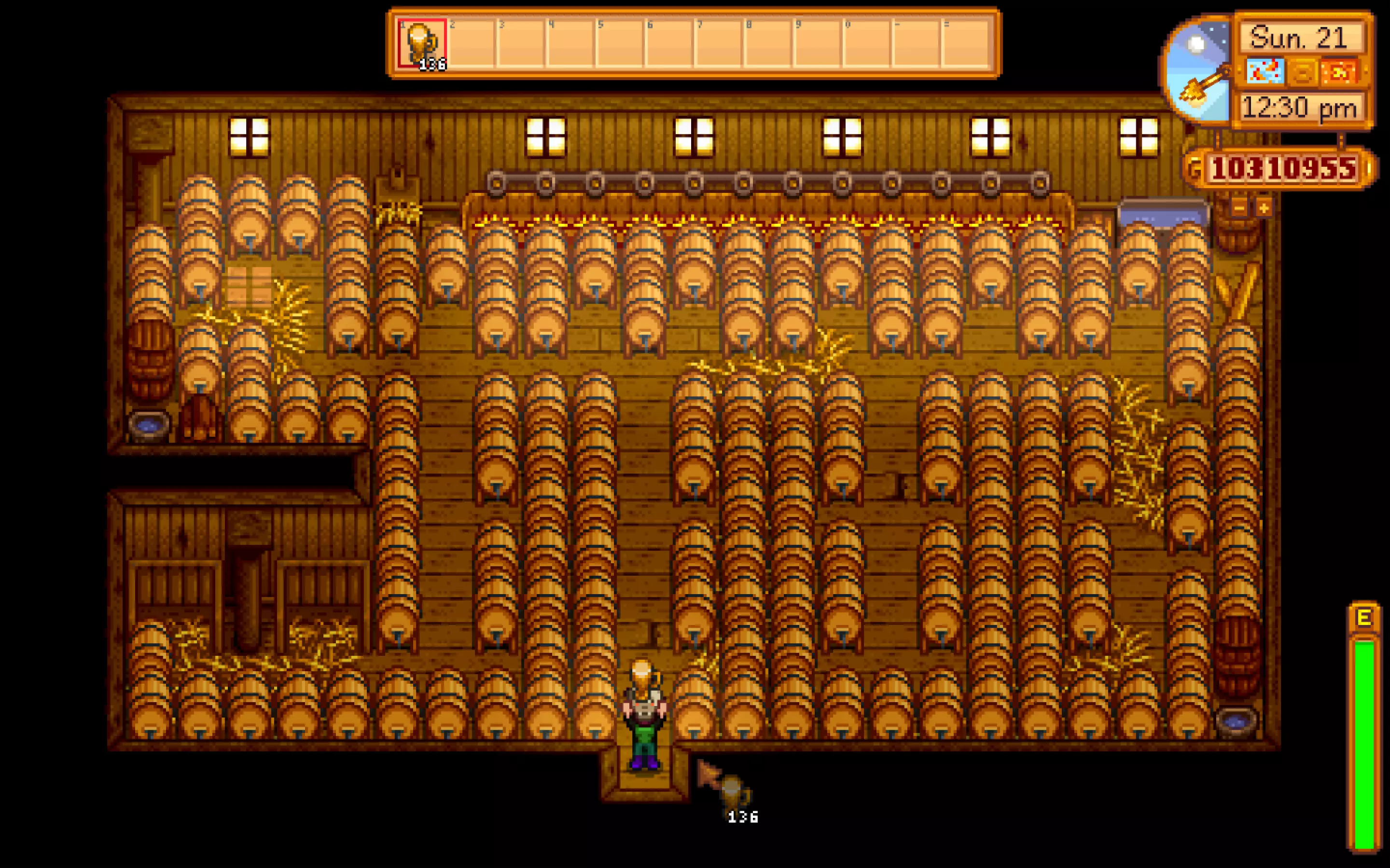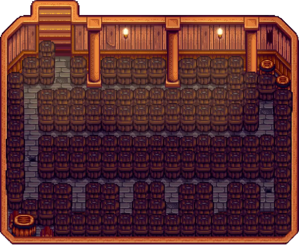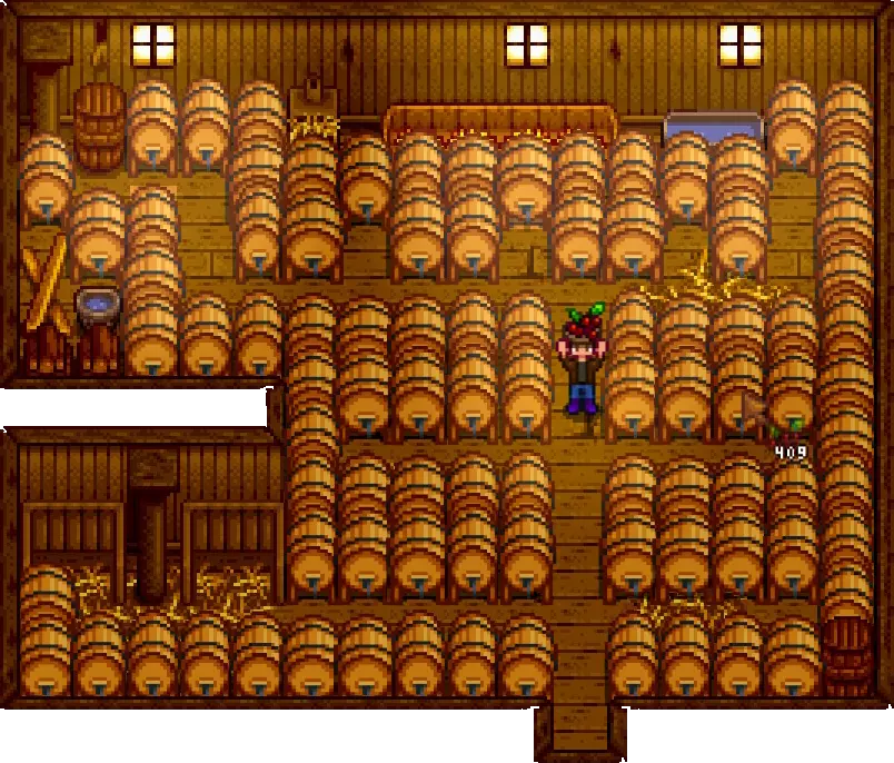 一个可能的最优豪华谷仓布局,可容纳136个酒桶。无论你最终选择哪种布局,请记住,你总是可以用正在工作的酒桶填满行走空间,只要确保如果你计划完全填满一个建筑,要在同一天开始所有的酿造工作。 秋季 你成功了,你种了星果,建了酒桶,并开始将你的金星作物转化为金砖。从现在开始,在酿造星果酒的同时,你可以种任何你喜欢的东西,并相应地出售。也许可以花些时间重新种植一些树木,或者建造更多的工匠设备。对我来说,我倾向于在秋季种植小麦,这样当星果酿造结束时,我可以用一些啤酒来填补。如果你还没获得古代果实,记得每周五和周日去旅行货车寻找。找到后一切就会变得顺利。 冬天你可以随意安排时间。 开玩笑的。如果你还没开始制作铱洒水器,那这应该成为你的首要任务。铱是一种很难找到的物质。 获取铱的途径大致限于绿洲矿井的30层及以下,或者通过万象晶球。 万象晶球可以从矿井115-119层的石头中获得,或者在绿洲从桑迪那里以1000g的价格购买,每打开100个晶球平均能获得10-15个铱。 计算如下: 晶球成本(1000g每个):100×1000=100,000g 打开成本(25g每个):100×25=2500g 每100个晶球平均获得铱:12.55/102500 = 1/8541.6666 = 0.00012铱矿/单位或1铱矿/8642g 从数学角度来看,铱矿确实很昂贵。 至此,第二年结束! 第三年及以后 第三年主要是关于升级,或许还有享受游戏的乐趣,对吧? 酒桶 酒桶是一种工匠设备,能够提高工匠物品的星级,并且只能放置在房屋最终升级后的地下室里。酒桶的使用理念与小桶类似。