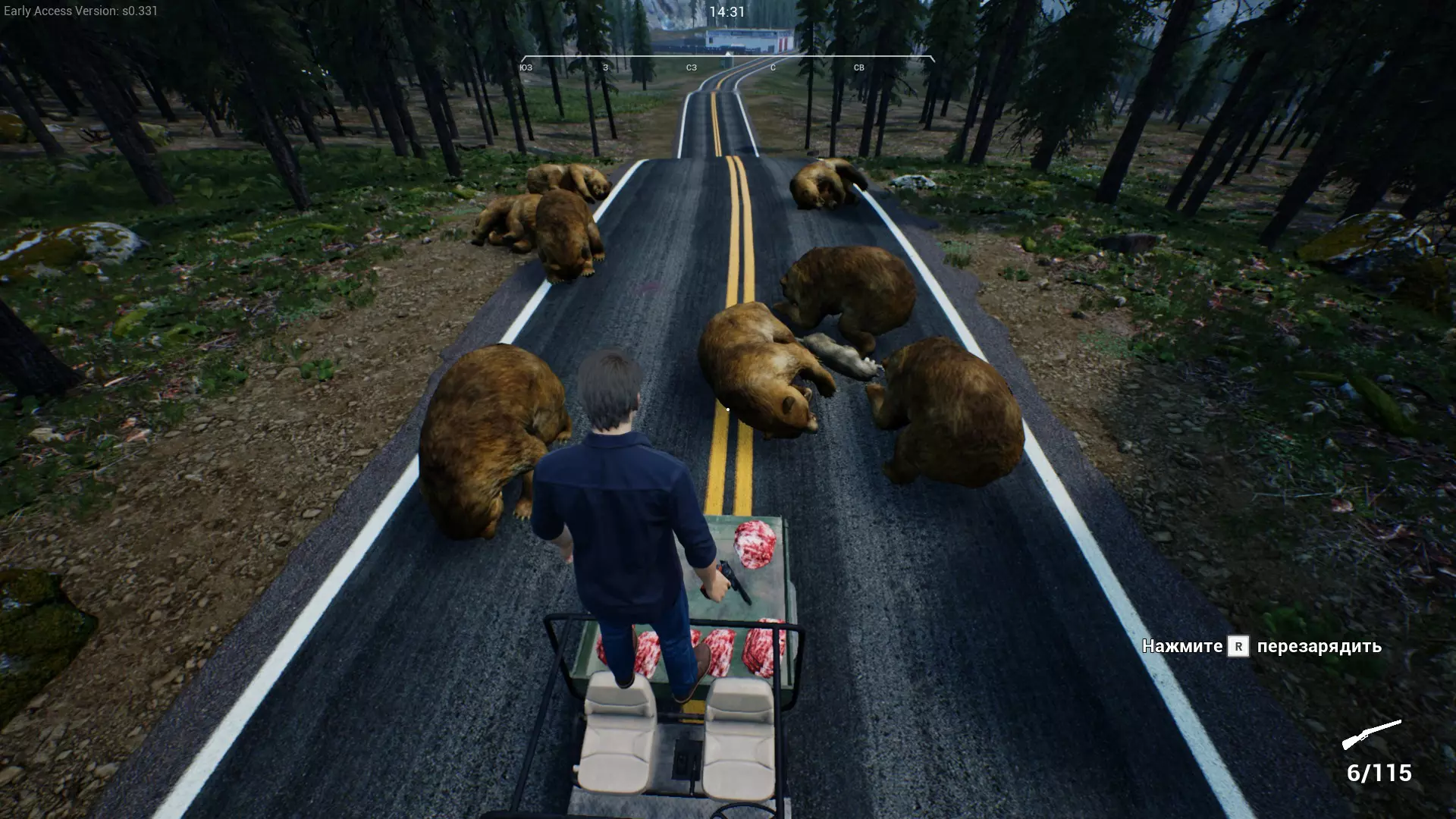 建议1:不要在熊的栖息地杀死它们。首先,附近可能还有其他熊,它们可不会拒绝新鲜的人类。其次,你需要把肉拖到车上,或者靠近每具尸体。利用【吸引装置】为自己服务——把它们一只只引到你的车旁。无法摆脱熊的追击,只能使用【快速奔跑】(Shift键)保持相同速度移动,奔跑时可以给左轮手枪装弹。