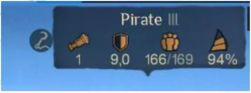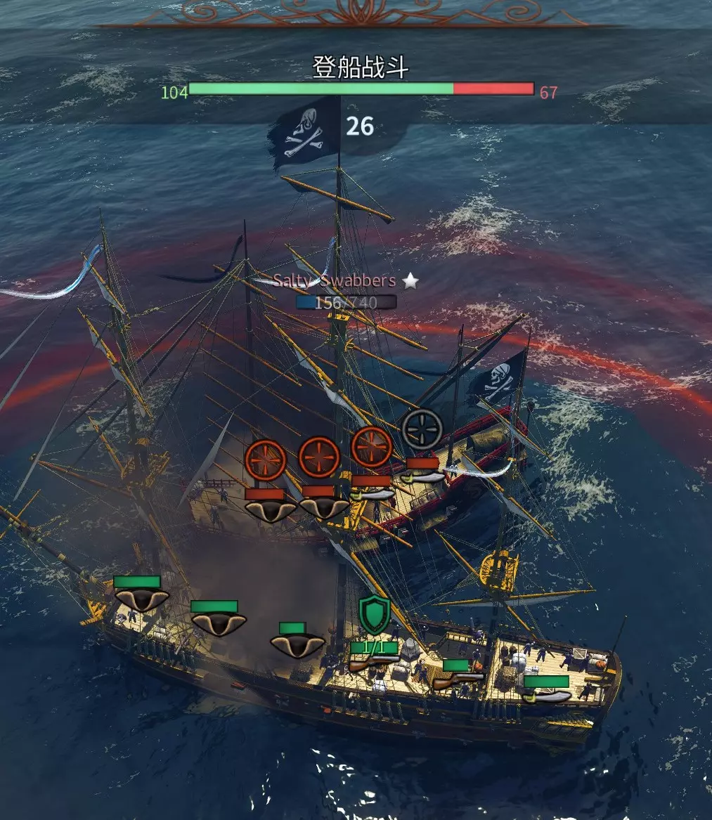 时长30秒,根据回合进行血量扣除,最后根据敌我双方剩余人数结算。 您可以看到己方队伍和敌方队伍的单位图标。 帽子图标代表水手;剑图标代表士兵、雇佣兵;火枪图标代表火枪手。 按住Ctrl键,将光标悬停在目标组上并点击,瞄准点会变为红色【攻击】或灰色【不攻击】。 点击自己的图标可开启保护【绿色盾牌】,最多可叠加3层保护(取决于舰船等级)。 伤害以回合为单位计算,每次伤害均分配给红标目标,保护组不参与攻击。 击中有盾牌的队伍会减少蓝色血量,无盾则减少橙色血量。 最终或提前获胜者取决于队伍剩余人数多寡,若达成显著优势则优先取胜。船员类型及其特性 船员类型 伤害 生命 货物 水手 15 380 30 士兵 30 320 40 火枪手 50 170 20 雇佣兵 20 450 90 PVE可以考虑全配备火枪手,以最大化输出。 PVP流派很多,有人倾向于用一队少量火枪手吸引敌方攻击,有人会优先攻击敌方人数最多的队伍以最大化输出,有人会减少水手配置以增强登船能力,有人会增加水手配置在炮战中取得优势后再登船,具体的操作还需要时间来检验。 劫持成功意味着什么?
