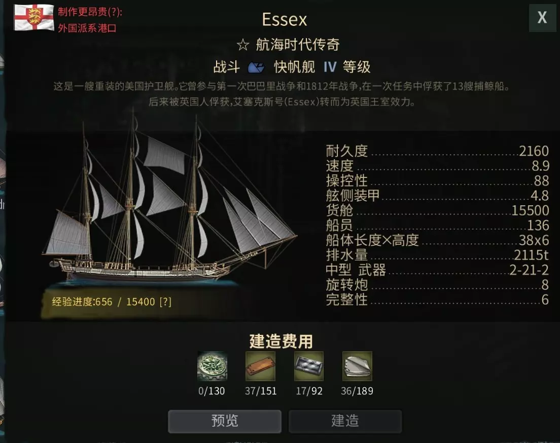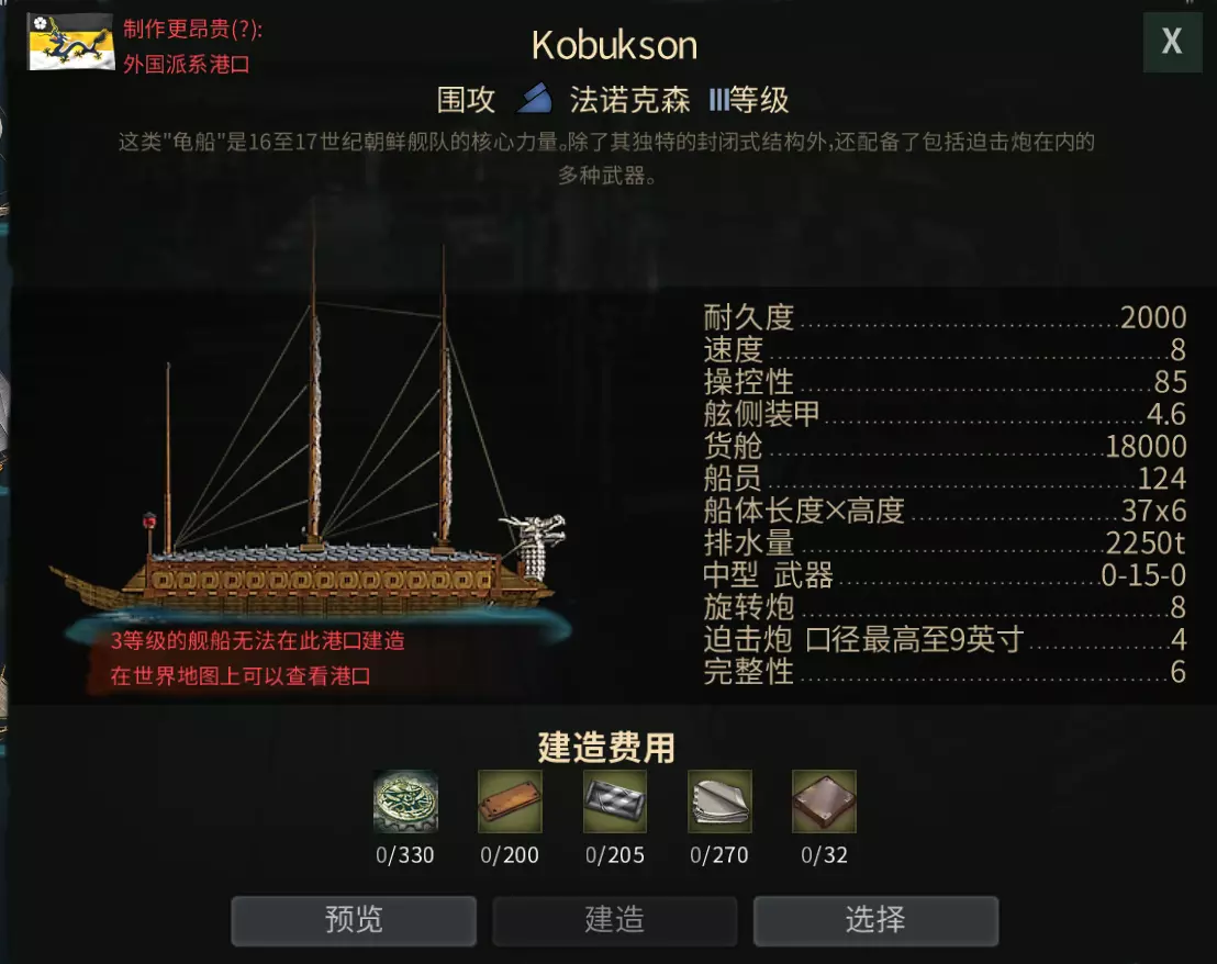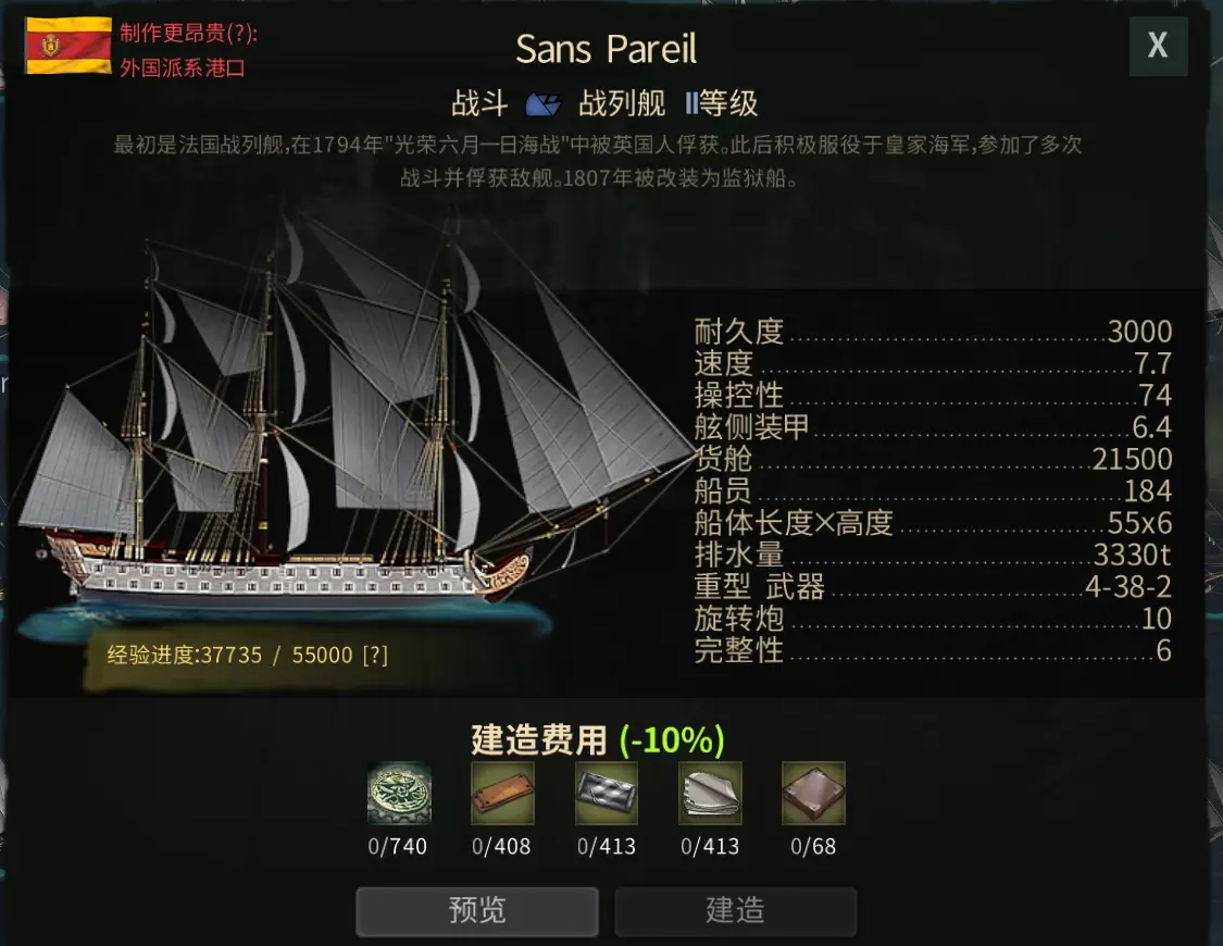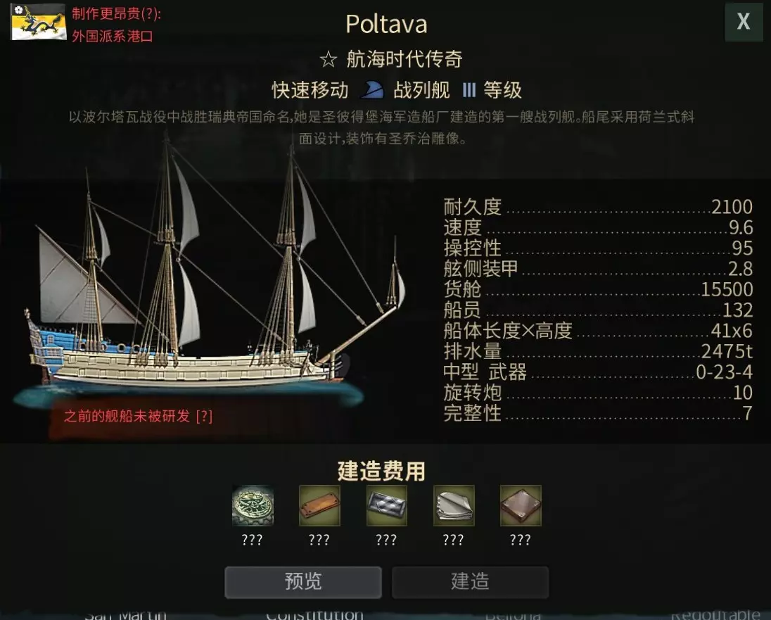 当鼠标悬停在地图中的港口上方时,会显示可建造舰船的等级(I级为最大型舰船,VII级为最小型)。 港口内同一时间只能建造一艘舰船。通常等级越高的舰船,建造所需时间越长。 所有必要的资源和材料必须提前运抵对应港口才能进行建造。 自行建造(非交易所购买)舰船时,您将获得随机强化模块。 如果您拥有充足资金,且不想花费大量时间收集材料,直接从其他玩家处购买舰船也是不错的选择。 在对应国家的港口建造相应舰船可享受20%折扣。