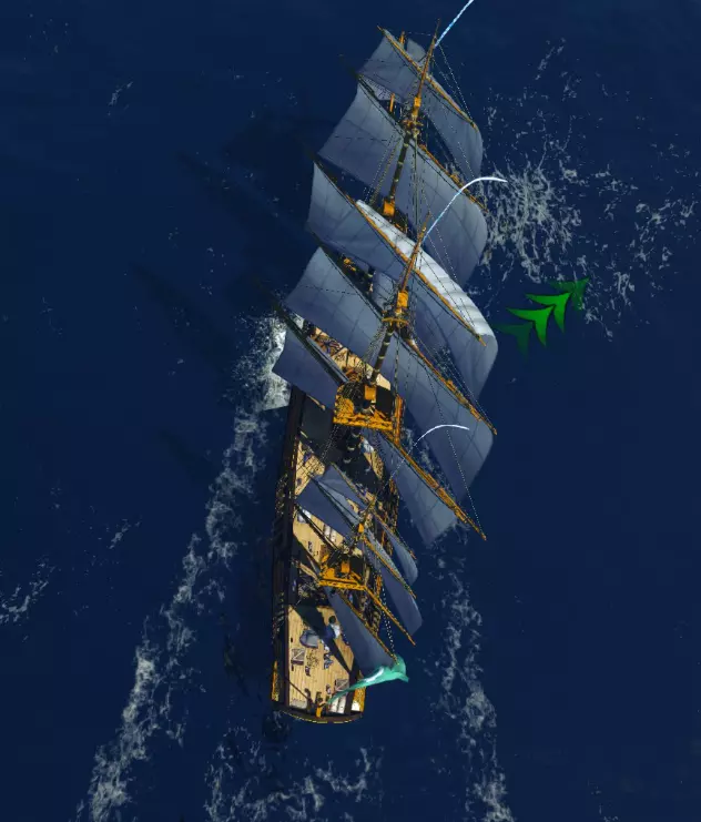 如果不挂和平旗的话,这是个大型玩家对战游戏,经常有老玩家组队驾驶金币船(火风暴、章鱼)在关键海峡蹲守其他玩家,新手尽量还是稳妥行事以确保安全。 白天上午服务器人数通常较少,可以选择在这个时段执行一些有风险的任务,比如收取地图外的工坊资源,或者独自刷野怪获取收益。 地图上某些区域会限制更高等级的船只进入,例如一圈礁石围成的区域里标注V,意味着只有V、VI、VII级船可以进入,更高等级(数字更小)的船无法进入。这些区域在地图右侧较多,目的是保护新手玩家,而公会也会专门培养某一级别的船只来确保港口占领。私人岛在玩家10级、20级后,岛上建筑所需资源会翻倍,建议尽早确定位置以节省资源。 航行: 帆船的行驶与《战舰世界》中发动机和螺旋桨驱动的船只存在很大区别,其受环境影响显著。以下是一些基本航行方法和技巧,助你更好地掌控船只: 1. 风向每15分钟逆时针转动一次,且对全服务器的船只均一致。出行前务必规划好路线。 2. 地图和海面上的箭头为风向指示,旗子也会随风飘扬以指示风向。