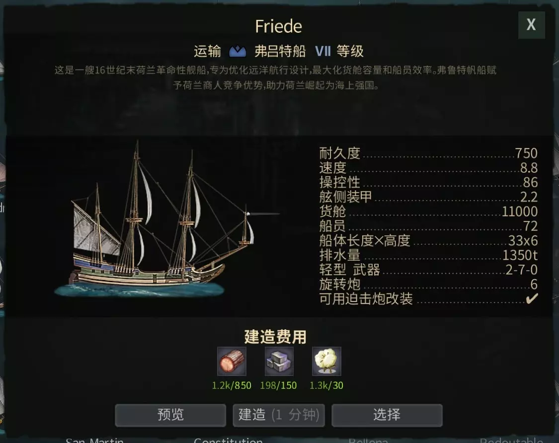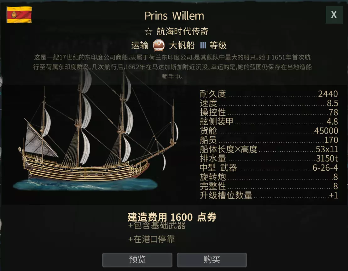 Prins Willem 威廉王子——商船之王。价格差不多150人民币,对于微氪玩家来说性价比最高的船,作为III级船其货舱容量极为宽敞,速度也在同级中领先,使其成为资源运输的强力舰艇。