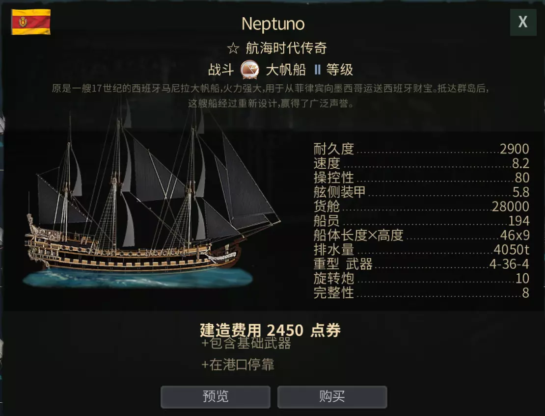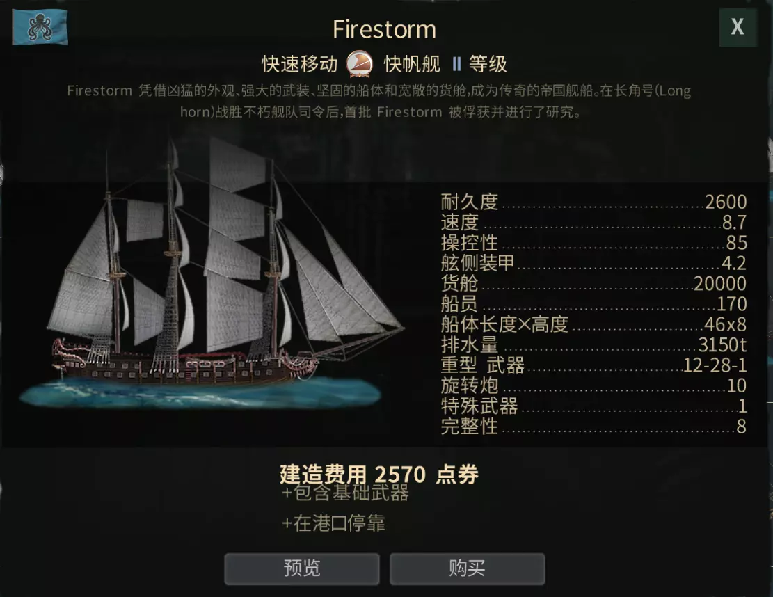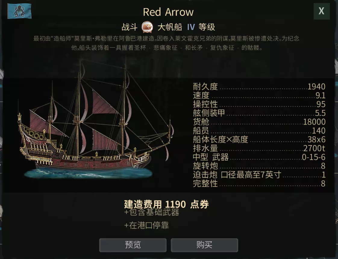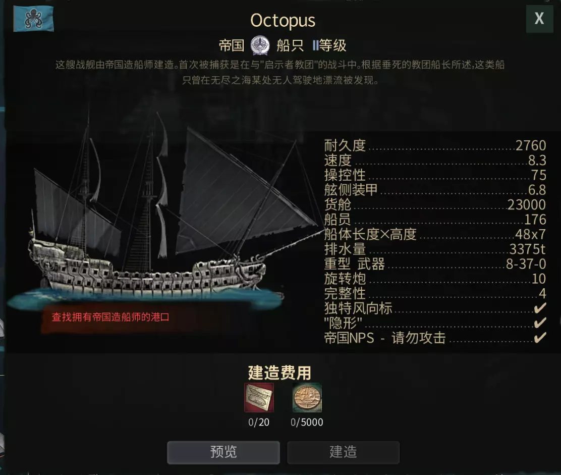 章鱼,新手当然是造不出来的,但在海盗中保有量很大,适合独狼玩家,有着独特的隐身技能,可以自主选择是战是逃,同时带有三角帆,逆风航行速度很快。 加值战舰若您想获取独特船只,可考虑以下方案: