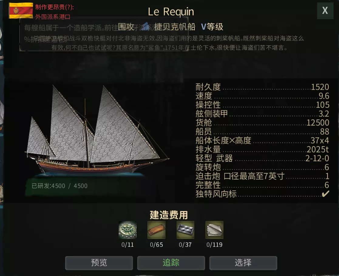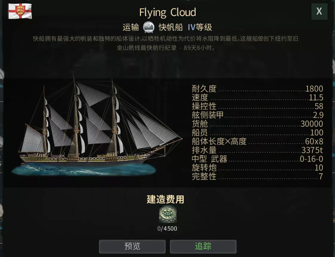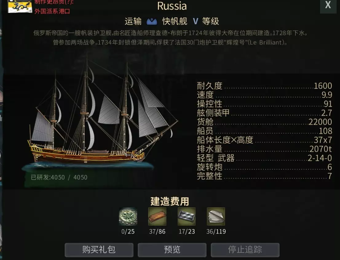 第二步:Russia 俄罗斯(V级) 银币货船中最快的,顺风能跑出18节以上的高速,遇上大部分敌人都可以靠速度逃跑,其他性能也有着完美平衡,既适合交易,也适用于对抗人机,平常整理资源,捞鲸鱼也是好手,合理安排配件在竞技场中也有一战之力。