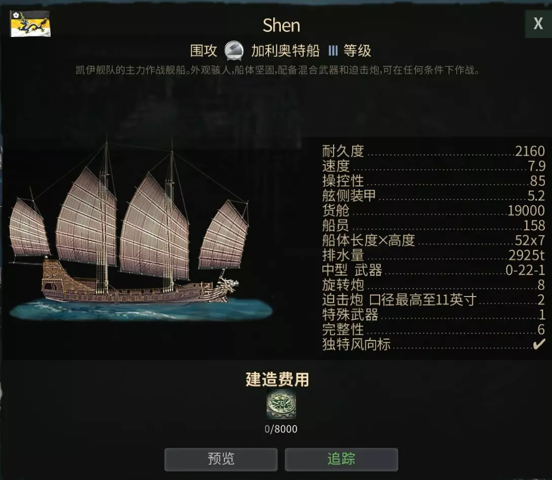 Shen(战斗标记兑换) “神”号堪称海盗与玩家间最顶尖的战舰,其声望在同级中独树一帜。 硬骨帆能逆风航行。 强韧的船体——火力强大。 2门11口径迫击炮——游戏中最致命的火力配置。 维修成本极低,适合频繁战斗。 四种配置方案——极其通用。 永不过时——在游戏的任何阶段都充满活力。