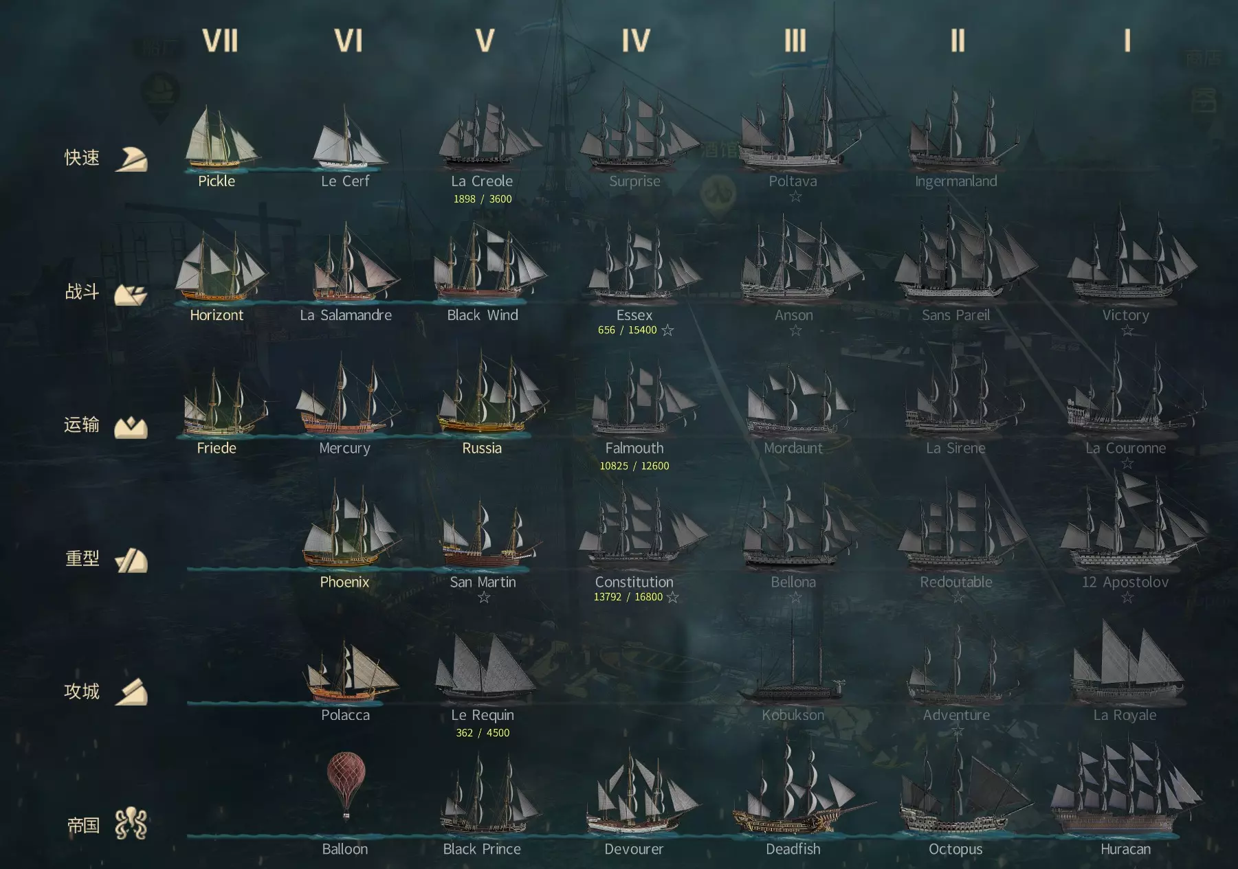 快速 用途:侦察、拦截、截击。 优点:高速度与高机动性,更多的头部火炮。 弱点:防御薄弱,船员不足,货仓小。 在开阔海域表现优异,尤其擅长使用拖刀战术【保持距离并消耗敌方力量】。 战斗 用途:适用于玩家对战和竞技场的核心角色。 优点:伤害、防御和机动性均衡,适合近身格斗,平衡的头尾火炮。 优势:适用于各种距离和格斗形式,表现卓越。 运输 用途:资源运输,简单PVE战斗。 优点:超大储藏空间,较高的航速。 弱点:大部分情况下不适合战斗。 优势在于:经济开发、货运以及和平区的发展。 重型 用途:港口的夺取与防御,工会战。 优点:装甲坚固,乘员众多,火力强大。弱点:机动性差,完全无头尾炮,无掩护时在开阔海域易受攻击。 优势:工会战中作为团队核心存在。 攻城 用途:专用火力支援,带有迫击炮。 优势:速度高于战斗型,部分配有三角帆或桨,可逆风行驶,机动性良好。 弱点:突击力较弱,小队作战能力有限,防御力略逊于快速型单位。 优势领域:战术机动、火力支援与远程打击。 帝国 用途:专为特殊性能而设计的精英舰艇。 特点:按照帝国图纸和草图建造,性能独特。 巡逻的帝国战舰在公海航行时不会攻击此类船只。 造船厂建造自己的船——提升经济实力与战斗力的关键要素。 每个港口都拥有自己允许建造的船只等级。