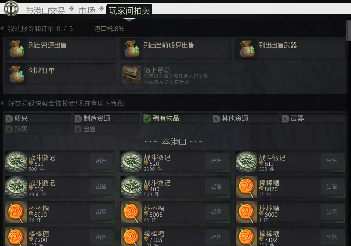 交易所是一个全球性的拍卖场,玩家在此相互交易资源。 可以发布销售订单或采购订单,同时可发布的订单数量有限制。 在运输过程中会收取佣金,具体金额取决于港口和货物类型。海盗团伙的成员只能在海盗城市下达订单,但可以在任何港口进行销售。 在交易所可以买卖哪些商品? 交易所是获取和销售贵重物品的关键途径。通过它,可以: 交易工艺品资源(如木条、青铜、帆布等); 买卖加工材料(铜、煤炭、布料、铁器等); 买卖稀有物品,包括图纸、古董、巫毒骷髅等。 建议:若想赚更多钱,不要按已报出的订单价格出售,这些价格往往被压低了。最好参考市场行情自行定价——这样能获得更多利润。 市场每个城市都有集市,可以: 买卖琥珀、地毯等被动商品。交易并非在玩家之间进行,而是通过系统完成。这种模式是轻松安全的收入来源基础。 渔村和海上商人——这里可以找到更便宜的进货和更高的出货价格,且不涉及玩家对战(PvP)风险,商品每天都会更新一次。 拍卖会是贸易公会的特殊经济赛事。 每10天进行一次,持续24小时。 每个普通港口都会出现10个供所有人使用的琥珀。 交易所开始接受琥珀订单。 公会任务: 将琥珀运至地图西南方哈里发国的三座城市中,以数量最多者为胜。获胜的公会将获得为期10天的港口控制权——无需战斗。 重要提示!琥珀不能以和平旗帜运输。即便未占领港口,也会导致公会评分扣分。 在【WOSB】中,优秀的商人绝非普通商贩。他们既是侦察兵、物流师,更是战略家。而赢得拍卖会的胜利,便无需流血却能获得公会至高荣耀。 公会积分是赛季排名中提升等级的主要方式,获胜者将获得【WOW】世界中的奖励、声望和影响力。所有玩家的活动都会为公会宝库贡献战利品,即使你并未直接参与战斗。 海盗公会任务:海盗生活充满战斗、袭击与掠夺——这些因素都在排行榜上有所体现。击毁塔楼——+6分 成功防守港口——+4点 港口被征税——+8点 经验值——每累积30万点,可获得+1点经验 完成50个任务可获得+1服务点数 招募——每获得5个队长级别,+1点积分 声誉——参与者每达成120项成就可获得+1点数 劫掠——每击杀75名任意派系玩家,+1点数 劫掠——成功完成8次商队成员登船,可获得+1点积分 季节性补给——一项与港口管控相关的附加活动 即便你没有参与PVP,依然可以有所助益。任何贡献都算在内 商会任务:商人们是物流、工艺与经济的行家他们通过积极的商业活动赚取积分: 经验值——每积累30万点经验+1点 任务——每完成50项可获得+1点积分 招募——每获得5个队长排名,+1点 贸易——每完成500万银币周转,+1点信誉 声誉——每达成120项成就,+1点 造船——建造1-2级舰船各+1点 琥珀——通过拍卖出售300单位琥珀,+1点 生产——消耗5万工艺时间,+1点 商会对于追求稳定发展与经济繁荣的玩家而言,是理想之选。 此外,竞技场排名靠前的玩家将获得公会积分奖励,这能有效提升团队凝聚力和PvP战力。 一些玩家建议: 【特种船员‘海盗’与‘文书’将加速您的发展】——RURU66 【在PvP中,不惜一切代价求生。生存是首要任务。】“机动行动以1速和2速进行,有时原地转向比绕圈移动更胜一筹。”——战斗鹅 “没资格进入灯塔——先打上分队旗的勾勾——”Shocki “伤害机制如下:穿甲减去舰船护甲等于舷侧耐久值减小。船头的伤害减免效果更强,而船尾在任何情况下都无护甲。务必多用船首承受齐射攻击,切勿暴露船尾。”——R-H创始人巴伦·疯狂者 “竞技场是新手获取金币的主要途径。赚到金币后,你就能直起腰杆子了。”——埃迪诺罗格 “风向每15分钟逆时针方向变化一次。请提前规划好交易路线。”“——Paralax “地图左侧,图例、工具一栏,一览你的所有资源”——Shylbert 红灯或金灯——Shoki “资源(如帆布梁等)在私人岛上制作,可享35%折扣” 在港口处理资源(矿石、药剂等)时,可享受代理优惠,即20%的制程时间折扣。 于是,港口时间消耗与个人时间消耗形成了循环。 “奴隶是必需品。需要大量奴隶。最好一开始就积累资源,之后再批量制作。这样就能避免因工坊轮换导致奴隶流失过多。”——凯拉鲁斯