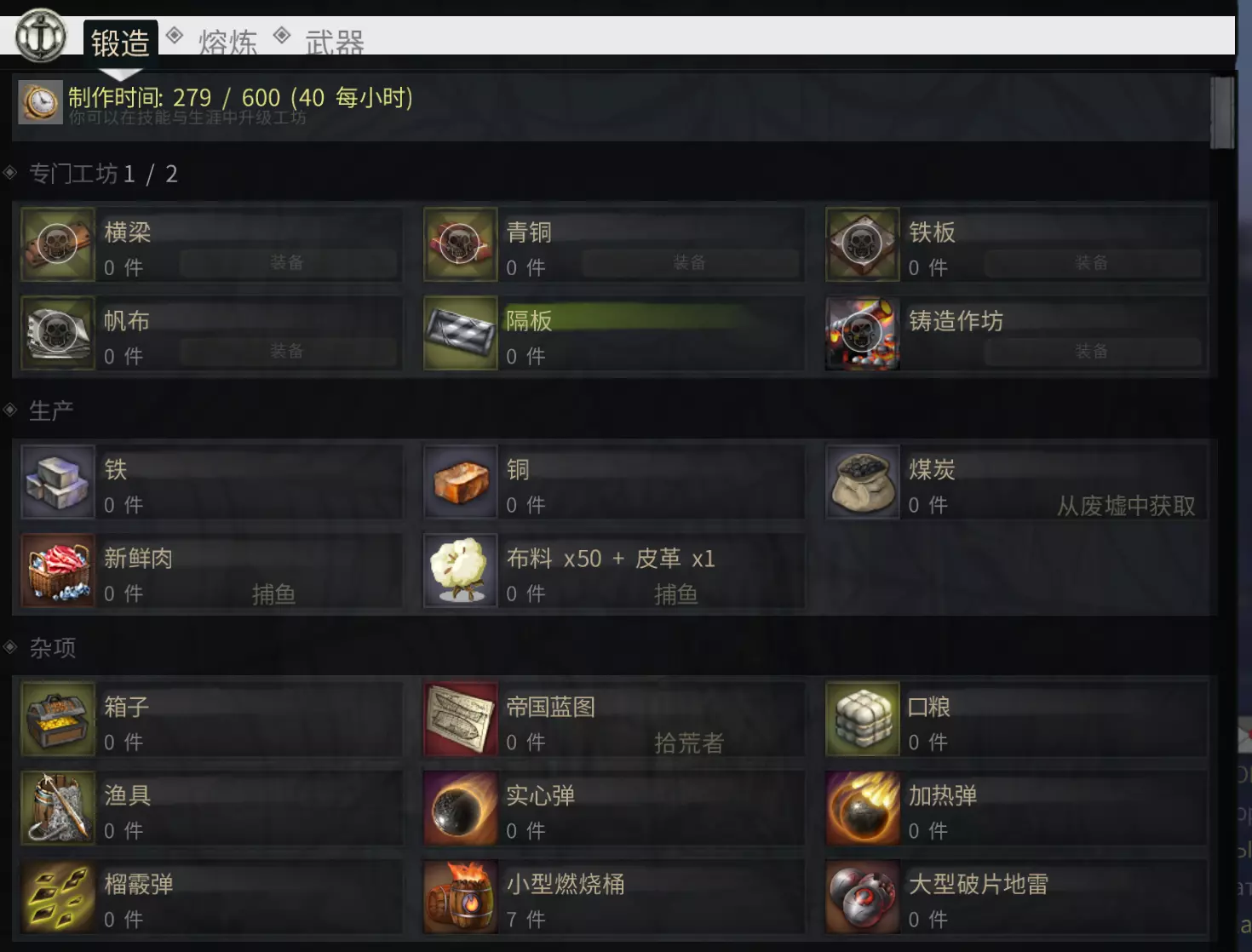 作坊与生产:每个港口可开设一家作坊。若仓库已升级到5级(成本很高,前期基本无需考虑,因此工坊只能在各个港口分散开设)和/或拥有【地下大厅】技能,则最多可开设两家。可用的作坊类型包括:梁、青铜、帆布、隔仓、铁板、火炮。 铁、铜、煤炭、新鲜肉类、布料与皮革的提炼与加工作为基础功能也可使用。 也可以制作特殊物品: 箱子(500金币合成一个,被携带配件的海盗抢劫一次后领悟到,这东西可以减少暴露的资金总量)、帝国蓝图、口粮、渔具(建议购买而非制作)、炮弹(建议购买而非制作)、燃烧弹(建议购买而非制作)、榴霰弹(用于迫击炮)、小号火药桶、大号破片式水雷。 私人岛