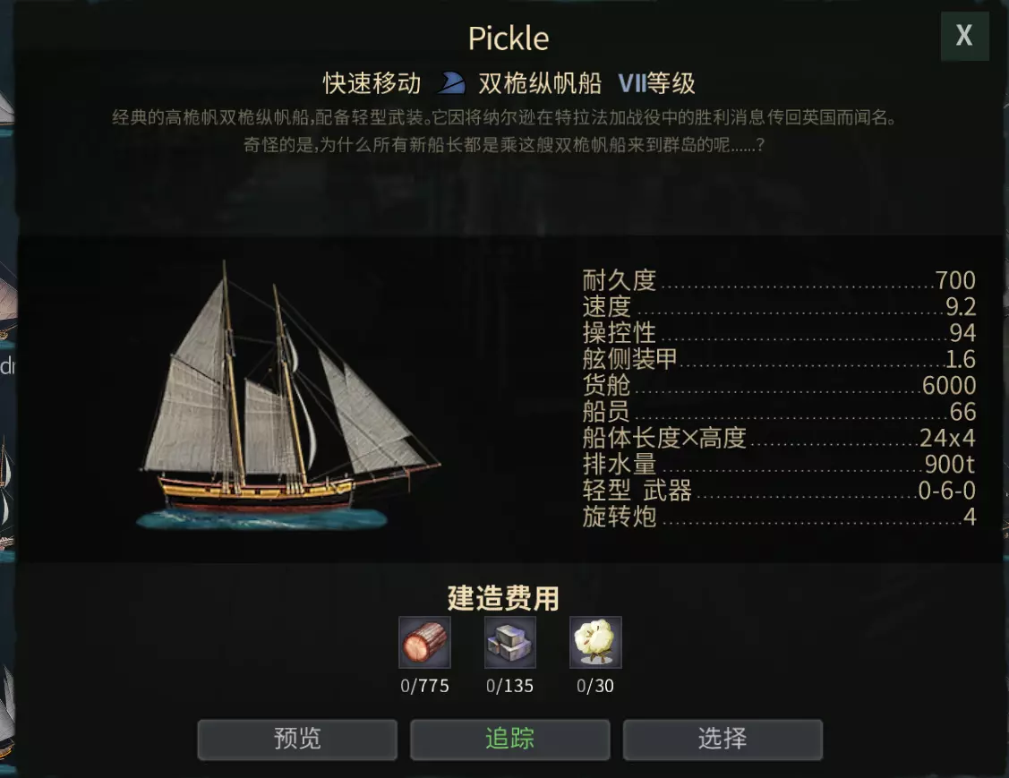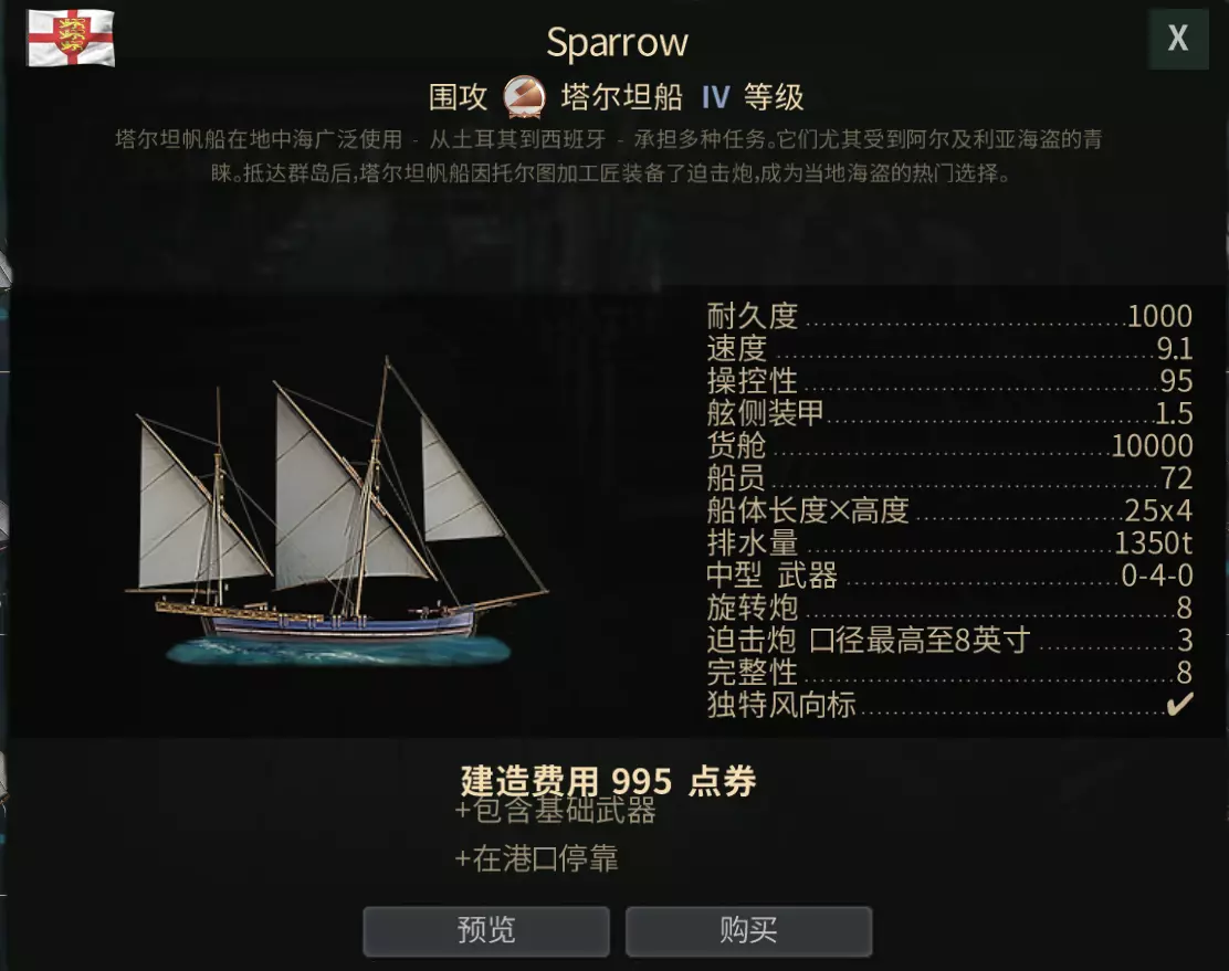 第三步:Mordaunt 莫当特(III级) 船舱宽敞,火力适中,适合留在港口作为【驮马】赚钱和运送造船材料。跑商路上遇到1800血的NPC能够稳定拿下,一定程度上能在PvP中自保。