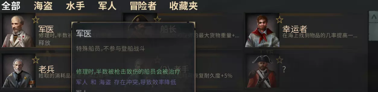 特殊船员分为4类: - 海盗 - 水手 - 军人 - 冒险家 舰船上最初设有3个专用船员位。如果已提升相应技能,可增至4个。 每位成员有独特加成——包括伤害、机动性、维修速度、资源收集等。 服役期限有限——在时限结束后,船员将消失无踪。 船员工作需要工资——其金额可通过技能提升来降低。 船员冲突 船员冲突会降低加成效率。 如何获取特殊船员? - 在海上救援(通常能遇到冒险家) - 在酒馆接任务时(极小概率) - 部分PvE模式 - 在帝国舰队登船时 - 在私人岛屿上的酒馆——俘虏在手时最有效的手段 登船 登船是一项核心战术,难度很高但收益也很大,需要敌人、友军都配合才能完成。登船后可以获取更多战利品、俘虏,甚至能让NPC加入你的舰队。 如何开始登船