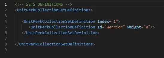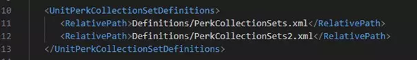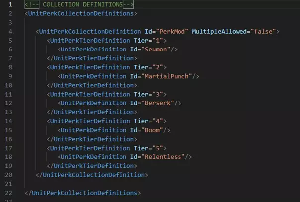 UnitPerkCollectionDefinition元素有两个属性: Id:你的集合名称。 MultipleAllowed:一个布尔值,用于启用或禁用集合的多重性。例如,杂项集合可以在多个槽位中生成,因此此属性设为true。但是,你不能同时拥有多个工程师或刺客集合,因此此属性设为false。警告:如果你希望你的集合允许生成多次,请注意每个层级中至少需要有相同数量的可用特长。 集合用于CollectionSets(参见下一份文档)。 UnitPerkDefinition在英雄生成时从所有可能性中随机选择。警告:多个修改或实现同一集合的模组无法正常工作。最后加载的模组将优先于之前的模组。这仅在模组存在重叠时需要考虑。 perk 集合组子模块 为了实现 perk 集合,我们需要定义 perk 集合可以出现的位置。 英雄完全生成后,将有8个可用的集合组。 一个 perk 集合组绑定到一个索引,并定义该索引处可以生成的集合。 实际上,游戏目前遵循以下逻辑: 第1、2、3组默认是战士/法师/弓箭手。 第4和第5组是“专精”集合,例如 hexer 或工程师。 第6组与种族绑定。 第7和第8组是杂项。