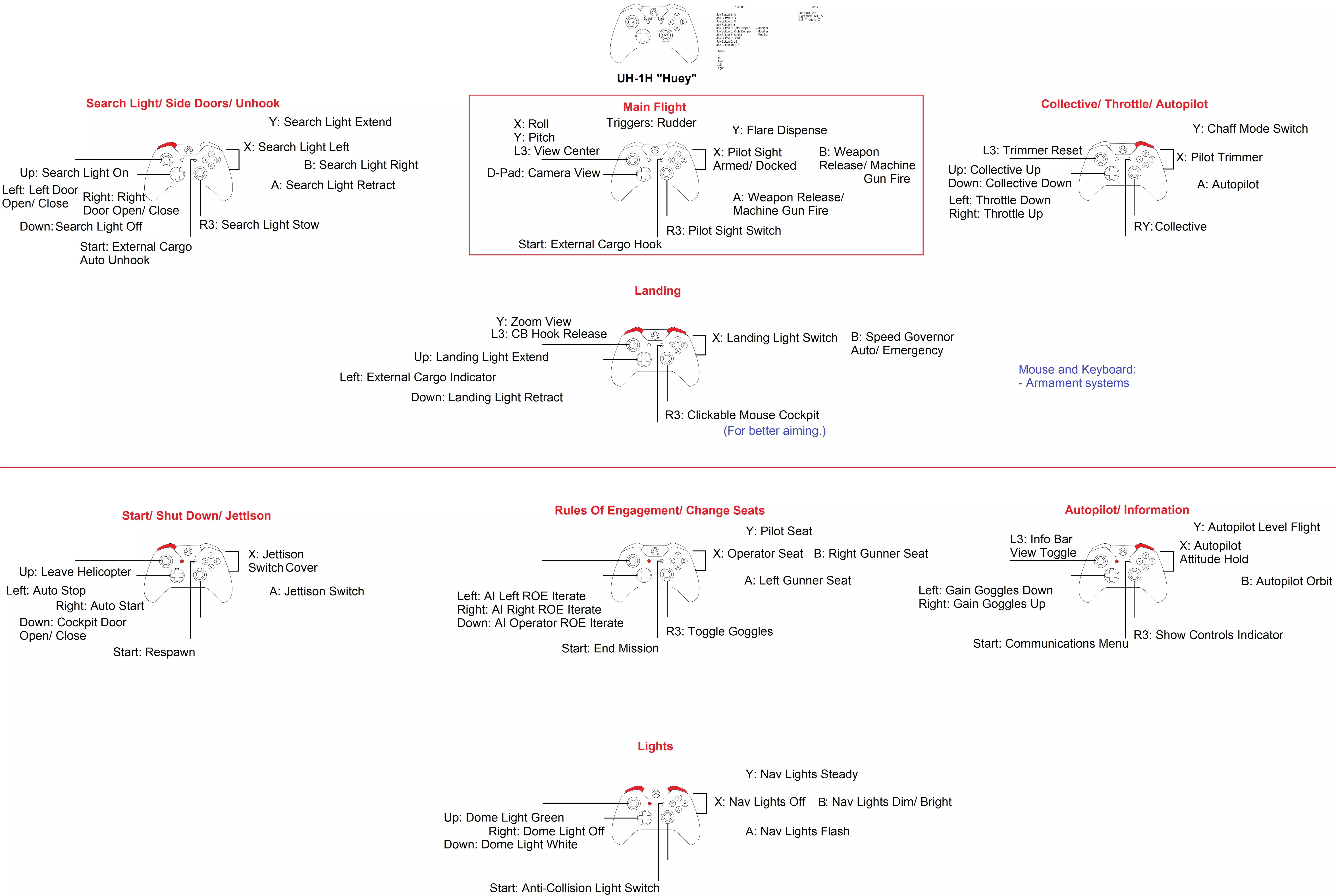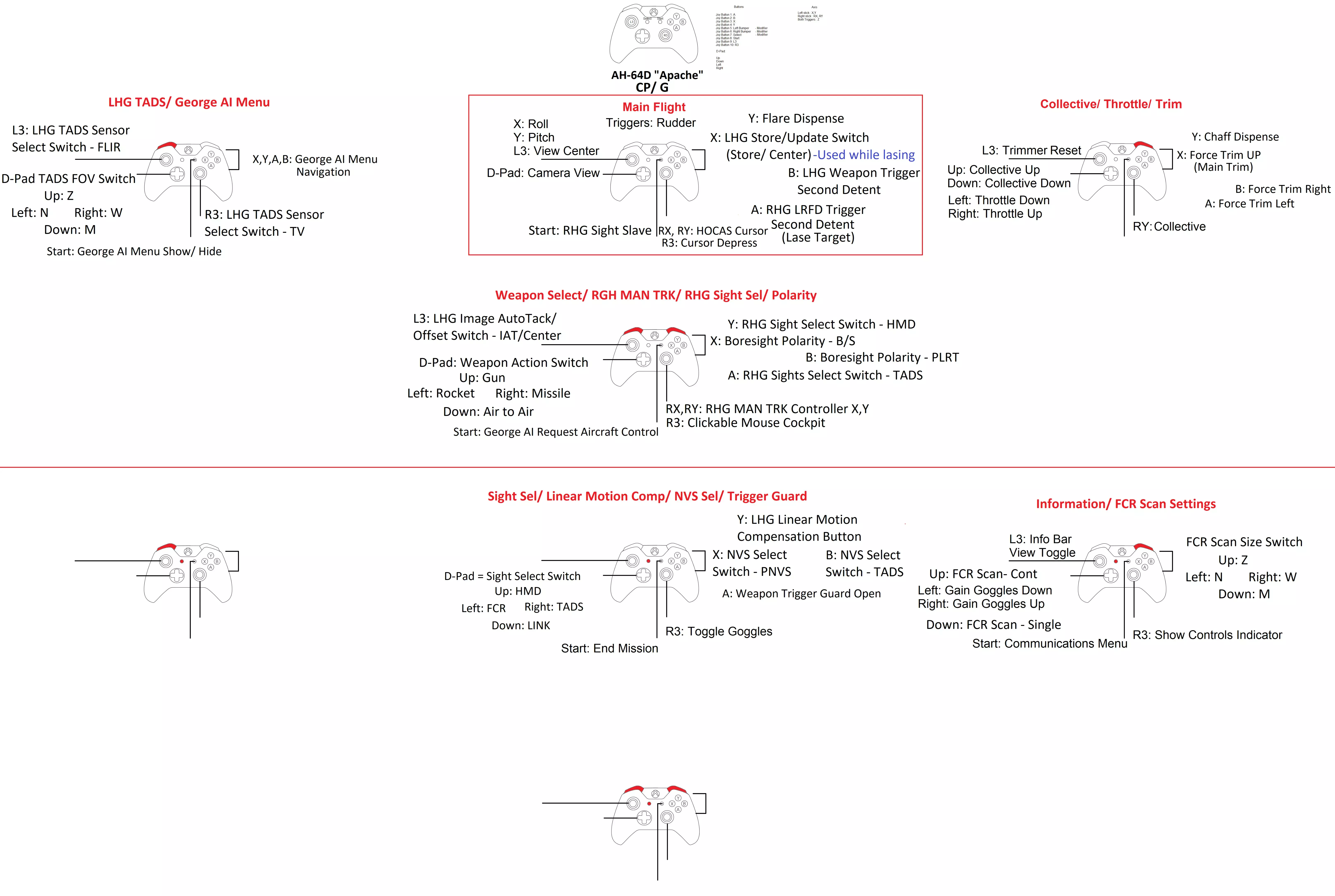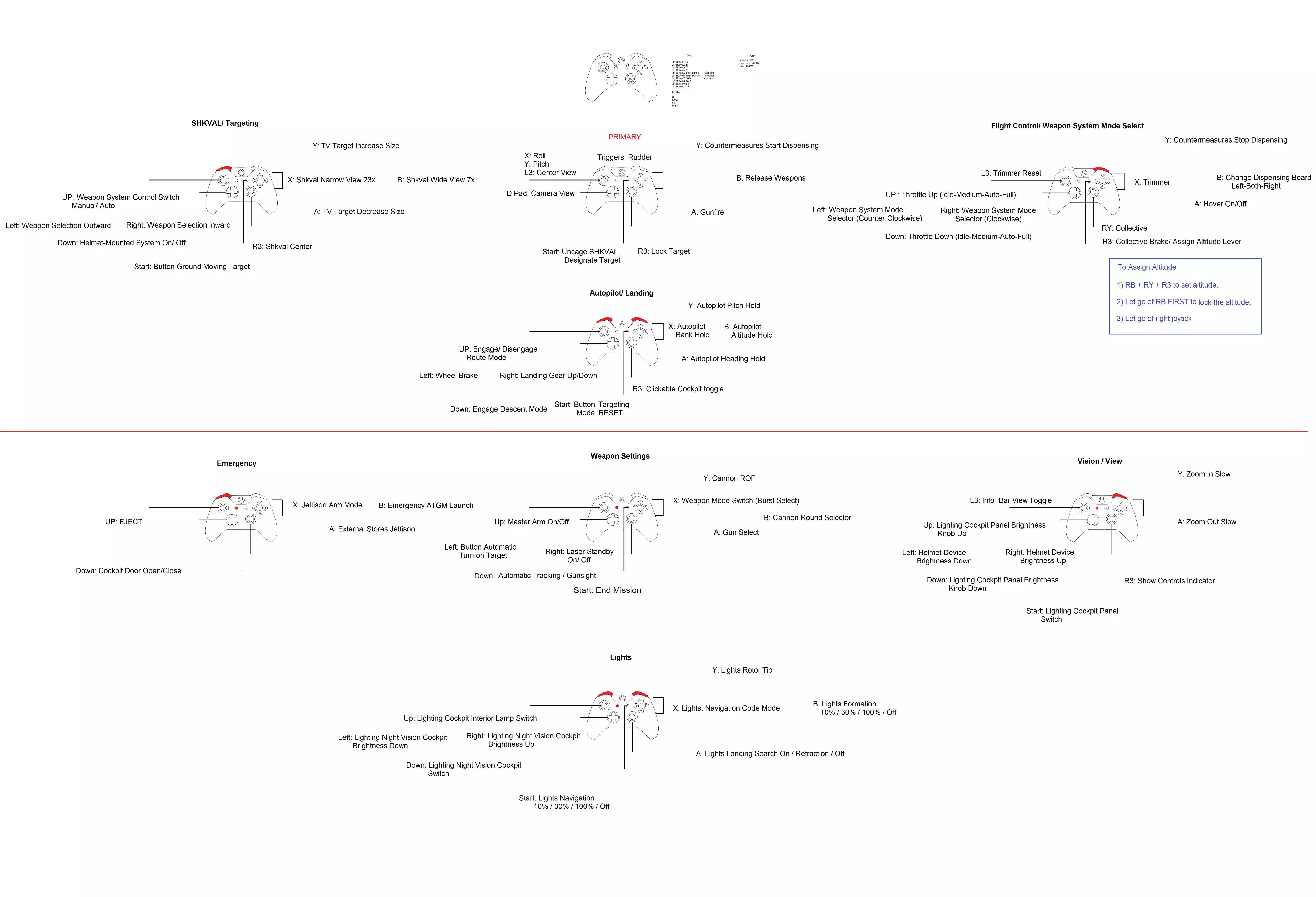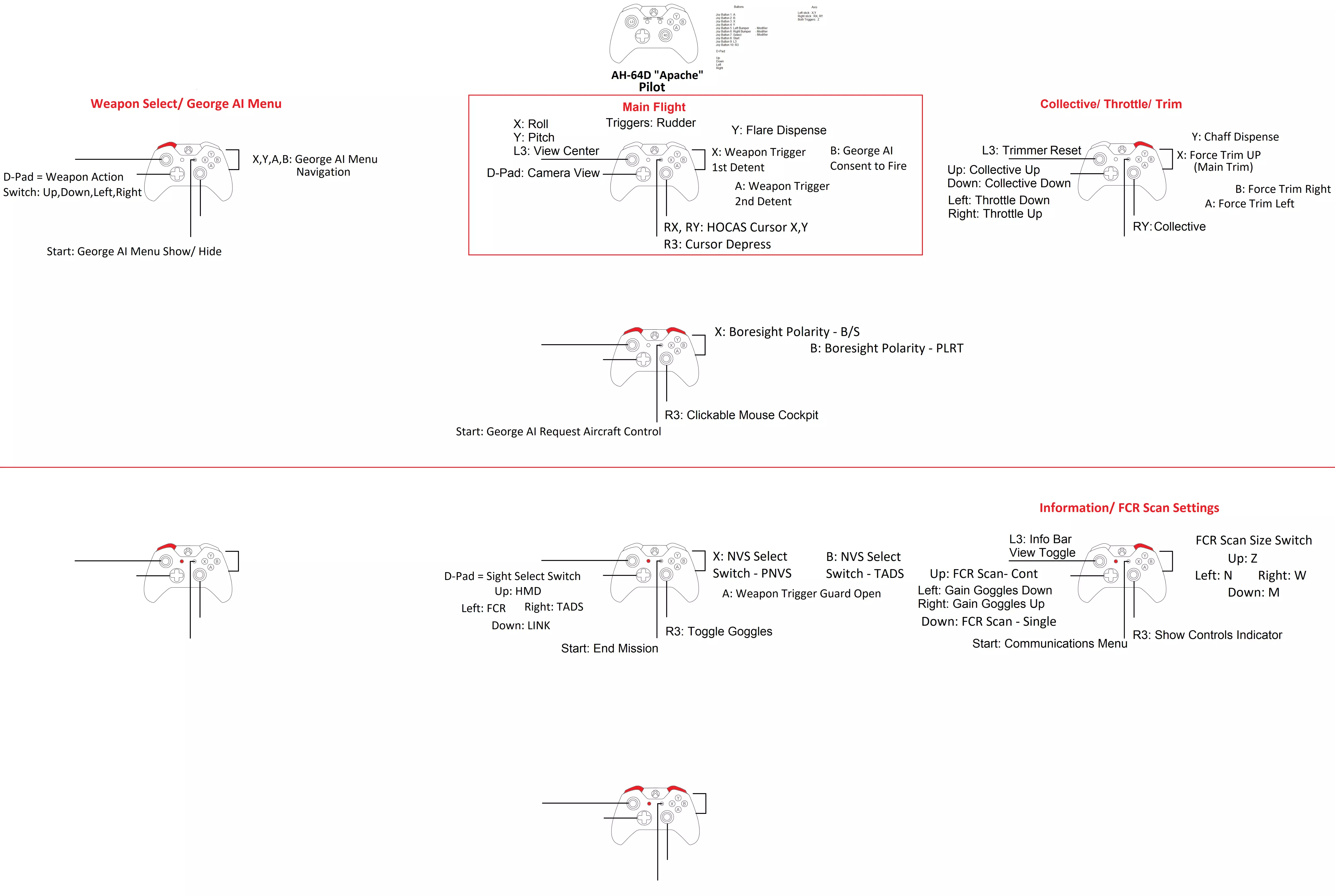想玩模拟飞行游戏,但没有飞行摇杆、脚舵、红外追踪器等专业设备?你是否只有一个Xbox One手柄? 那么这篇指南就是为你准备的! 简介 欢迎阅读本指南! 如果你没有飞行摇杆、脚舵和/或Track IR,也没有设置Free Track,那么这篇指南适合想要用Xbox One手柄玩模拟飞行游戏的玩家。 对于有经验的玩家,本指南可以作为一个不错的模板,帮你节省设置按键绑定的时间,只需根据个人喜好稍作调整即可。 注意:我会在有时间或购买了其他载具后,添加更多载具的设置内容。 2022年1月4日:更新了A4E-C指南的链接。 2022年1月16日:新增了UH-60L模组的设置页面。2022年4月4日:添加了AH-64飞行员和CP/G的初始布局。我会在有时间时尝试优化它。 2022年9月7日:大家好,抱歉Steam出现了一些问题,删除了我的部分布局图片,导致它们无法正常显示。 2022年9月12日:这是目前我的指南以及其他人的指南所遇到的情况。
