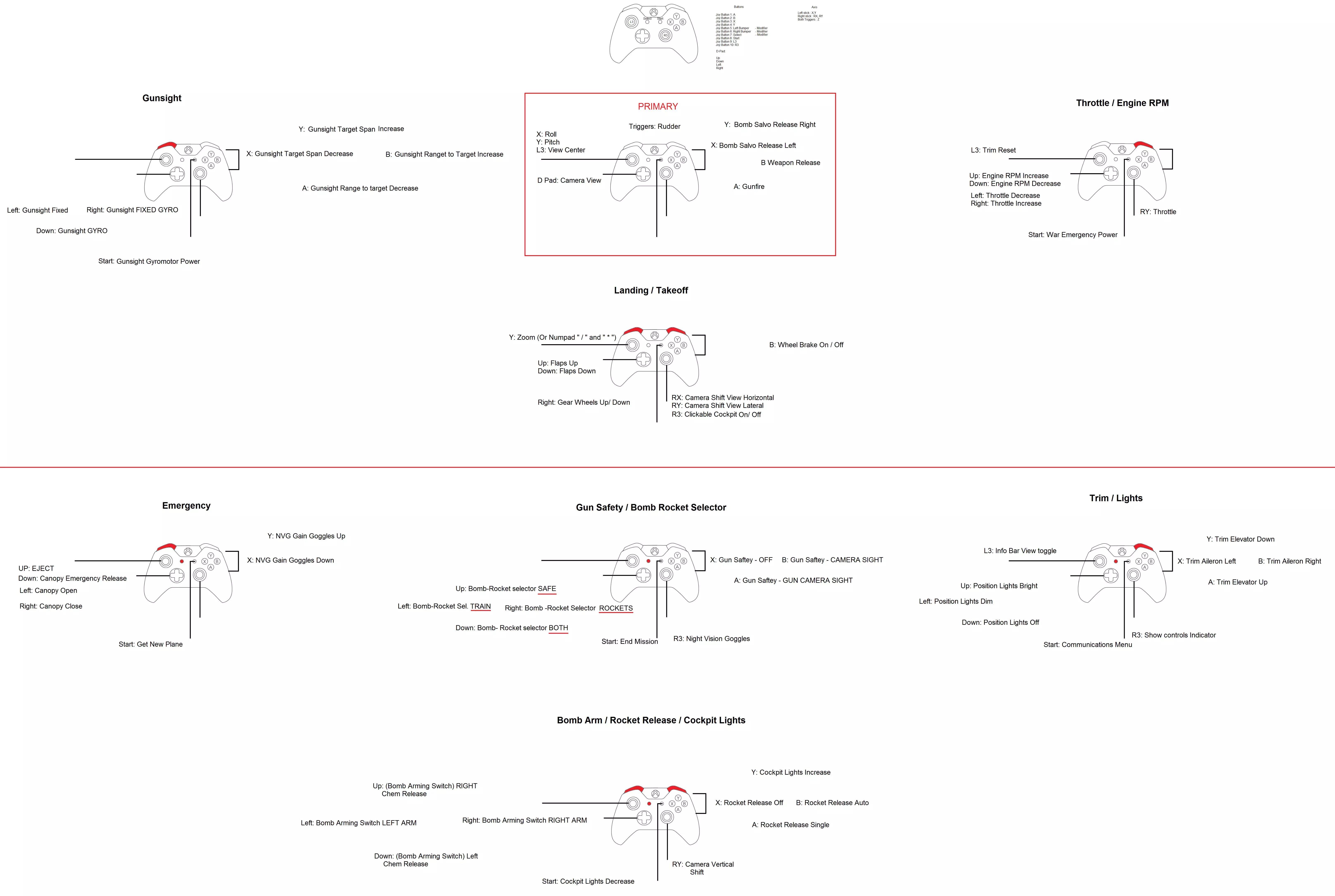 我的控制设置中的修改键为左 bumper/L1、右 bumper/R1 以及选择/返回键。 注意:我的部分旧控制方案为修改键设置了特定名称,这可能会导致控制中的按键绑定冲突。我目前正尝试移除这些名称,以便你只需加载.diff.lua文件并设置修改键即可。 关于油门控制的说明: 在我几乎所有的设置中,你会发现油门有两个控制位置。这是为了满足玩家的不同偏好。