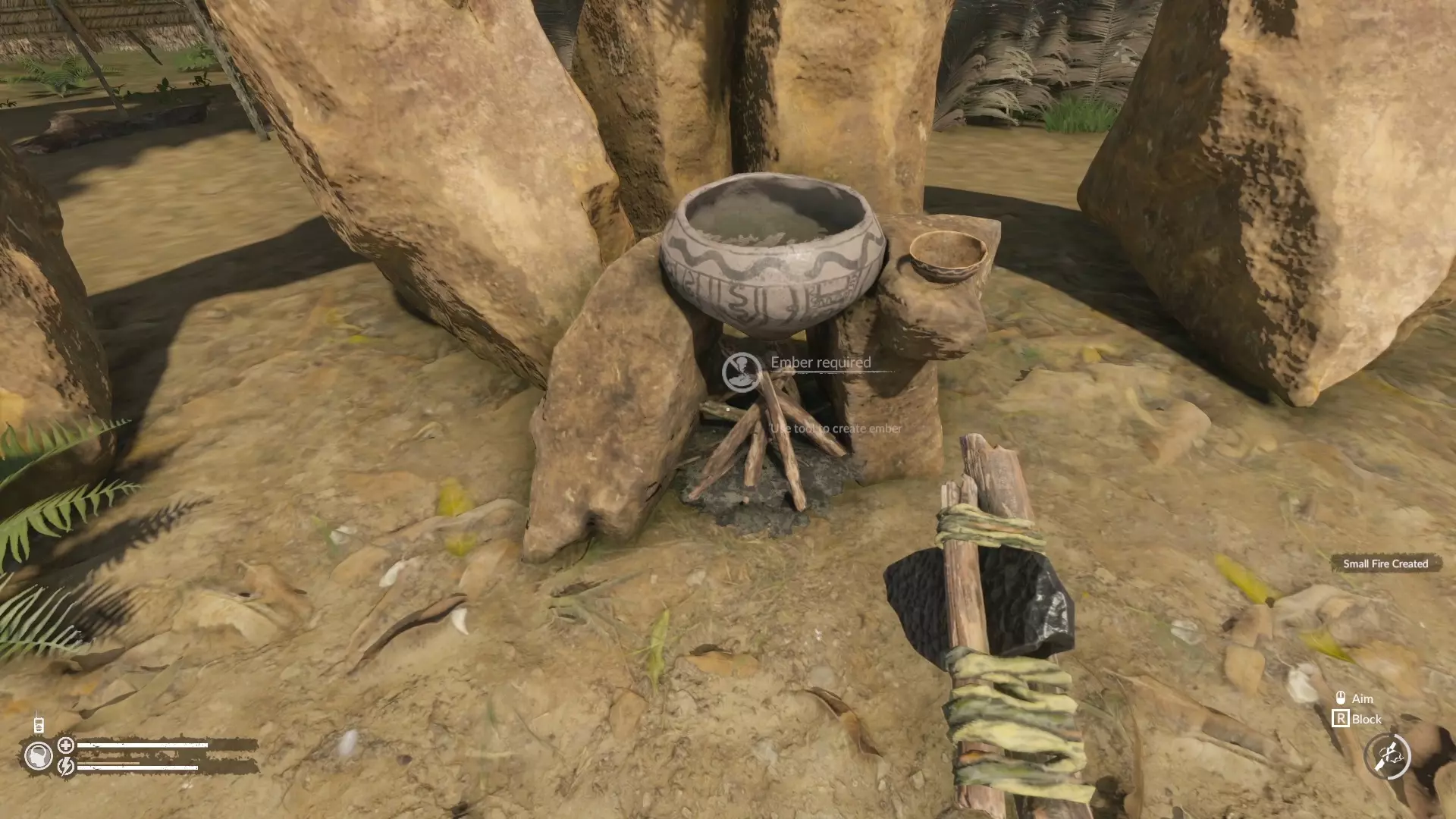 现在你已经集齐了材料,找到一个散布在世界各地的仪式锅,在锅下生火,然后按E键与锅互动即可触发过场动画。