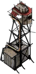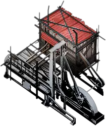 猎人吊架在获取食物的效率和效果上都有所提升。一旦研究完成,它可以建造在小屋顶部,对小屋进行升级,从而提高驻守工人每天早上带回的食物量。由于猎人从空中而非地面进行狩猎,吊架每天最多可提供30单位食物。如果进一步升级,在已研究升级的情况下,猎人吊架可以在使用与猎人小屋相同数量工人的前提下,将每日食物供应量从30单位增加到45单位。