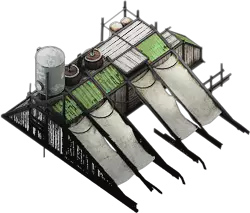 尽管你会发现周围已没有任何绿色生命,但温室是一切可能再次开始的地方。建造温室需要研究和一个珍贵的蒸汽核心,它每个标准工作日可生产30单位食物。温室需要10人才能满员运作,基础供暖为1级。 与猎人小屋或猎人棚屋不同,温室【必须】保持在可工作状态,即至少达到“寒冷”或更温暖的温度才能提供食物,因为内部种植的植物无法在严寒中存活。如果没有供暖升级或发电机提供的热量,温室将无法运作。 不过,温室可以通过升级来提高建筑的供暖等级,研究还能进一步提升温室每个标准工作日的食物产量。