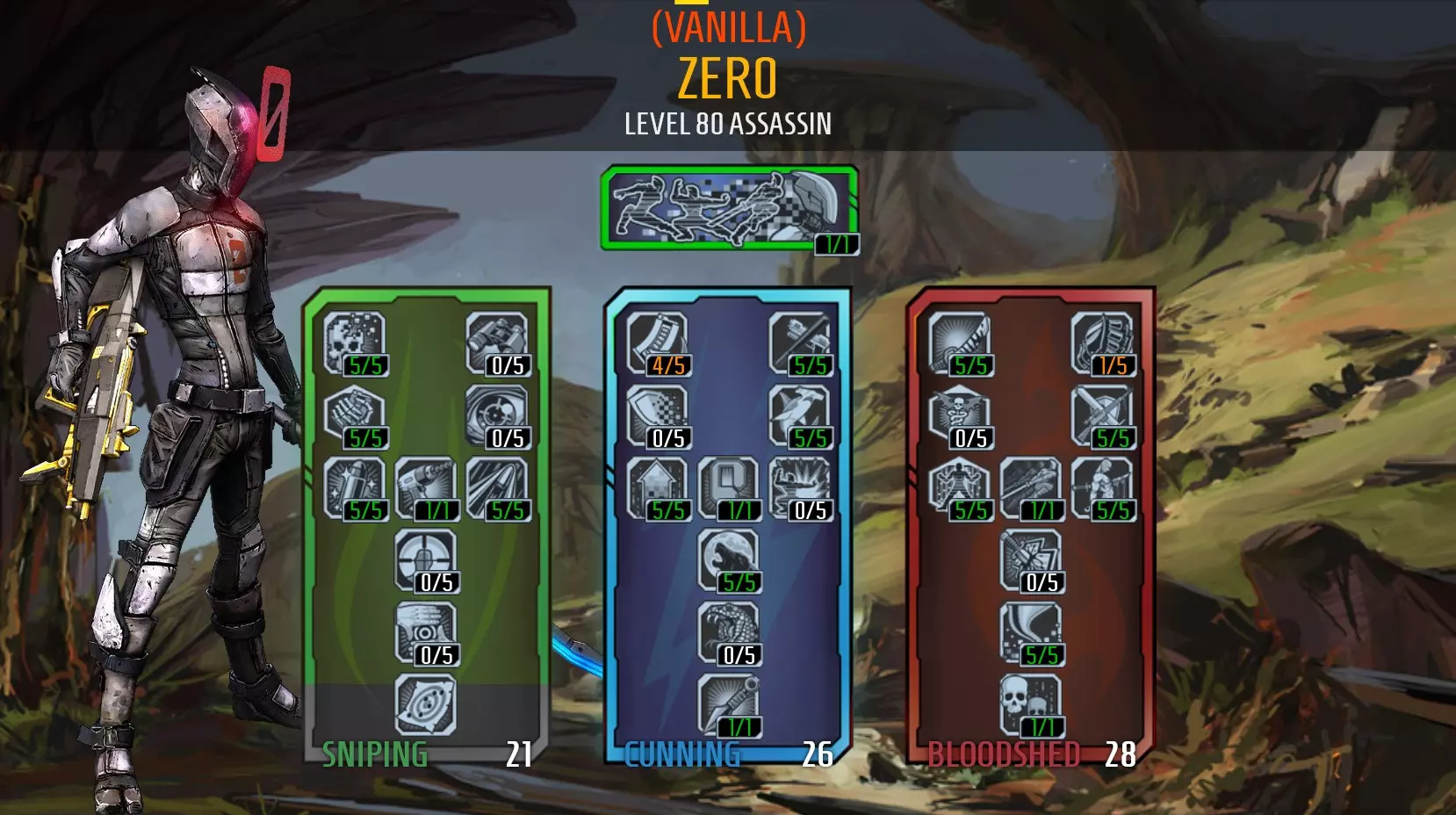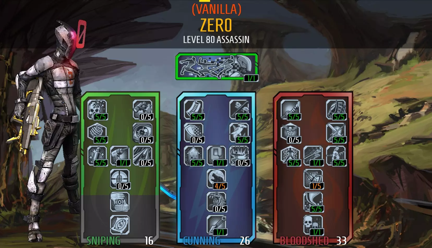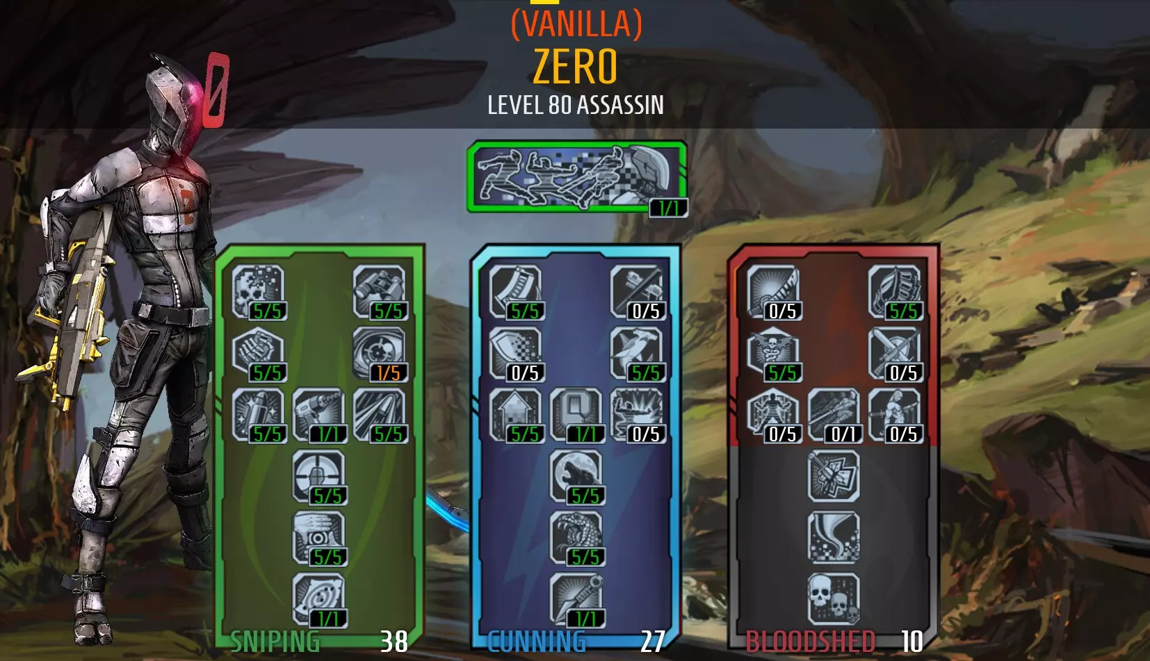https://youtu.be/3--ZDJM0hDg Tips: To play this build effectively, you need to know where your damage comes from: Killing Bl0w will activate when an enemy's health drops below 30% Be Like Water will increase your next melee attack's damage after you shoot something. A melee attack will increase the damage of your next shot fired. Backstab will increase your melee damage when attacking an enemy from behind. Ambush will also increase damage you deal when you attack an enemy from behind or it's attacking something other than you. This boost also effects gun damage. F0ll0wthr0ugh will increase your melee damage and movement speed after you get a kill. It also increases gun damage. Like The Wind will increase melee damage when moving. Rising Sh0t will increase your melee damage when melee attacks are dealt in quick succession. Also effects gun damage. Death Mark will increase all damage the marked target takes by 80% Slag will increase damage by 300% Decepti0n will deal up to 650% melee damage. To score maximum damage, you need to attack an enemy at the end of it's duration (notice the scaling bar displayed on screen while Decepti0n is active. Maximum damage is achieved when the loading bar reaches the explosion icon) C0unter Strike has a chance to activate when you take damage, granting increased damage on your next melee attack if executed quickly. Aim for critical hits You can further increase your melee damage by equipping class mods, roid shields, and +melee damage relics. To maximise damage you need to meet the requirements of as many of these points as practical when striking your opponent. Many Must Fall will extend the duration of Decepti0n after each melee kill while Decepti0n is active. It doesn't add much time though, so you'll need to attack your next target quickly. You will have enough time to use Death Bl0ss0m to Death Mark a new target and either strike before the kunai explodes or wait until after it explodes. Alternatively, you can try to Death Mark multiple targets, and stay 2 steps ahead with marks so you won't be charging into exploding kunai. You can use Death Bl0ss0m to weaken enemies, apply Death Mark and try to slag your targets to make it easier to kill them with your next melee attack. If you successfully kill a target with a melee attack while Decepti0n is active you'll be able to use Death B0ss0m again. Try to use kunai as much as possible as it's a good damage dealer, but try not to kill your targets with kunai as this won't activate Many Must Fall. Careful not to hurt yourself with Death Bl0ss0m's explosions, as you don't have a lot of health and they will down you quickly. Throwing grenades does not break Decepti0n so you can use grenades to slag enemies snd/or break your shields to activate roid damage while Decepti0n is active. Suggested items Use Captain Blades Rapier when you activate Decepti0n as it gives a massive +200% but it's gun damage is horrible. You can swap to a different weapon after Decepti0n to deal gun damage. The Law (pistol) and Order (shield) are a good combination, as melee attacks will heal you when both are equiped. These items are obtained as mission rewards from Santuary missions Won't Get Fooled Again for Law, and BFFs for Order. The Grog Nozzle is a good alternative as it provideshealing as well, but hard to get with the +melee damage variant. You may want to ask the Borderlands community to give you one for this build (only way to acquire it as it cannot be farmed). you could use either a Legendary Ninja Class Mod (preferred) or a Legendary Hunter Class Mod would work if you altered the spec. If you don't have one of these, you could use a blue or purple Ninja Class Mod or an Infiltrator Class Mod. I'm using a relic that boosts my melee damage. A reduce cooldown relic would also work. A slag grenade is handy. Transfusion for additional healing, Bouncing betties as they last longer in combat, or Magic Missile. You may want to keep a weapon handy to manage things you don't want to get too close to (like constructors). a sniper, Maliwan Caster or a thrown-like-a-grenade Tediore will do the trick. This weapon should be reliable enough to use to recover from Fight For Your Life. Problem's with this build: Levelling the character up wasn't a fun experience but it was worth it in the end. Sometimes it was difficult to melee flying enemies -but my friends thought it was funny watching an assassin using Dashing Strike to fly through the air yo chase them. You will become better at timing your attacks against aerial units with practice. The build does not have much toughness and will fall quickly to enemies you can't melee. Gameplay Videos: https://youtu.be/2zfJ3W8NN84 https://youtu.be/8P2tpqyCD-g Zero - Contract Killer (Team Player)* Oops, this build is outdated and is being reviewed. check back soon! 17/05/2022 " I'm on a mission / With automatic weapons / It's kill or be killed." This build uses the Cunning skill tree and the Sniping skill tree, but not for sniping -which makes things a lot easier. Here's the skill tree: Tips: Rising Sh0t is considered useless by the wider community but it's not with this build. Rising Sh0t is very effective with automatic weapons when you're holding the trigger and consistently hitting your enemy. Use Decepti0n often, while active use Death Bl0ss0m to apply Death Mark to multiple enemies, recharge your shields, regen health and reload your gun. Ambush is not as useful when playing solo, you will get an increase in damage while Decepti0n is active but that boost will end as soon as you're revealed. It's more useful in co-operative play when enemies are attacking other players. Zero is a hero that's based on skill. His damage comes from consistently getting critical hits. Use Death Mark on things you can't slag In co-op games, use Decepti0n to trick enemies into targeting another player. Look for opportunities to use B0re. If you can get a kill just before you use Decepti0n you will gain movement speed fro