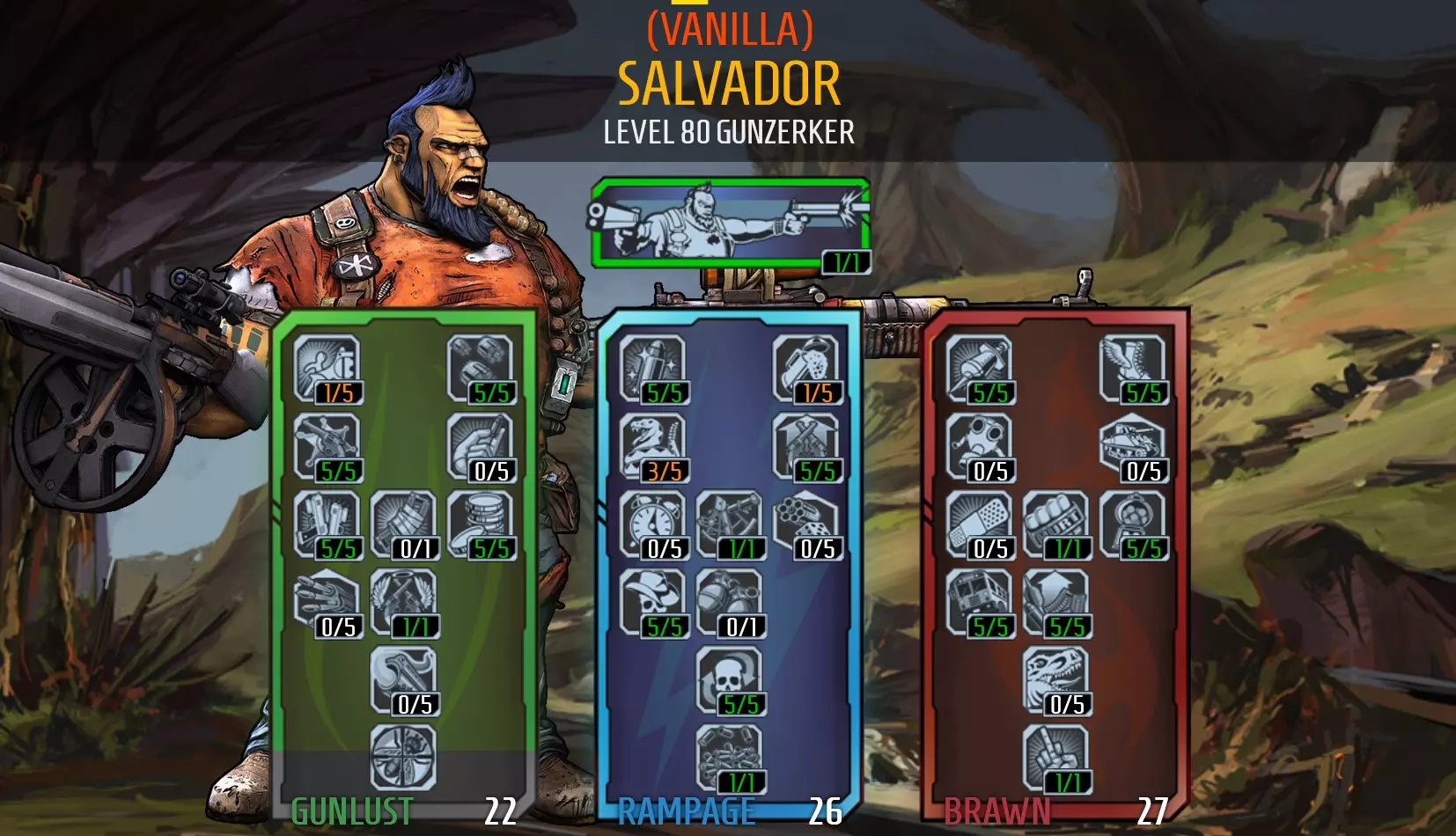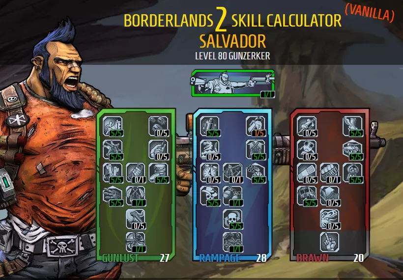 TipsWhen using the Lady Fist: Hyperion weapons are good for Gunzerking as they increase accuracy while holding down the trigger. This makes them accurate when shooting from the hip. The Lady Fist works well if you use a Bee shield and can consistently score critical hits. Kill a weak enemy first to activate No Kill Like Overkill to apply additional 'overkill' damage to each shot. Each kill will re-apply No Kill Like Overkill based on the new value 'overkill' value, meaning the 'overkill damage can stack on top of itself and continue to climb with each consecutive kill while the ability is active. The Lady Fist gun damage, Bee shield's amp shots and 'overkill damage' will all receive the +800 critical hit damage the Lady Fist provides; this is what causes your damage to sky rocket after the first kill or two, and will continue to climb until you reach maximum damage as long as you keep getting kills with critical hits. Killing an enemy with a body shot may cause your damage to topple and you will have to build it back up. The Lady Fist does not work with the Grog Nozzle as it does not deal enough damage without the Bee shield's amp shots and the drunk effect the Grog Nozzle applies will cause it to become too inaccurate to use until you sober up. The Unkempt Harold and Grog Nozzle option requires far less skill to deal massive damage and increase survivability, but you will need to ditch the Bee shield for something tougher to get closer to enemies. Just hold the trigger down and spray high damaging explosive bullets (which are fantastic against most enemies) and the [Grog Nozzle[/i] will convert a percentage of damage dealt to heal yourself. You will only be able to get a permanent one through mods (literally the only thing i used the community mod for). Otherwise you may get one from other players or leaving 'The Beard Makes the Man' mission is incomplete. If you opt for leaving 'The Beard makes the Man' mission incomplete, you risk losing access to your Grog Nozzle while you're in a game where the party leader has finished the mission, but you will regain access when you leave their party. When playing in groups you will need I'm Ready Already as other players will be killing enemies preventing you from extending your gunzerking duration. You can combine skills such as Inconceivable, Filled to the Brim, and 5 Shots or 6 (kill skill) to shoot free bullets non-stop without reloading for a short time after getting a kill. If you a couple of Topneaa rocket launchers equipped (preferably one slag and one for damage) - you can hold your trigger down and spray enemies with free rockets. This will deal less damage than just using your pistols though, but it looks impressive - like a Super Saiyan slamming enemies with 'Continuous Kikōha'. Suggested Items:Weapons: Guns like the Unkempt Harold, Grog Nozzle (for healing), Lady Fist are good. I've also tried duel wielding B|tches SMG (i didn't name this gun), it works OK but it's not nearly as powerful and drains more ammo. I stuck to Hyperion weapons when levelling up as they are accurate when fired from the hip when duel wielding. Shield: Blockade, Antagonist, Rough Rider, or at the very least an Adaptive shield will give you more survivability. A Bee shield will give your more damage and compliment the Lady Fist, but you will need to play more cautiously. Grenade: Singularity grenades are good for grouping and nuking enemies, especially when using an Unkempt Harold. Class Mod: Legendary Hoarder Class Mod, or a Tiny Tina Monk Class Mod. Relic: +pistol damage, +explosive damage (for Unkempt Harold), or +health Problems with this Build The Lady Fist only works well against enemies with crit zones; so use the Unkempt Harold against creatures without crit zones. Also, getting the right Lady Fists can be annoying. Here's how you can do it, but it's an exploit - so if you don't want to do this then i suggest you finish reading this section here. Here's how it works: if you don't like the reward you've received you can force the application to close without saving, reload your game and turn the mission in again, and repeat until you get the gun parts and/or element you want. You can also have a second account join with a freshly made character to earn a second reward simultaneously. Gameplay Videos: https://youtu.be/ANqccZv2CRM https://youtu.be/WQ0-TB0mQqw Salvador - Zippy Beserker (Speed Runner) NOW LET'S HAVE SOME FUN! This build was based around the gunzerker's ability to move quickly. It's quite satisfying leaving your friends in the dust with Salvador's athletic ability -watch his little legs go! but wait, there's more! The build also hypes up his attack speed, reload speed, and boasts some damage, which allows you to melt enemies with an almost endless barrage of bullets. Damage: 7 Toughness: 10 Difficulty: 2 Fun: 8 Here's the skill tree:
