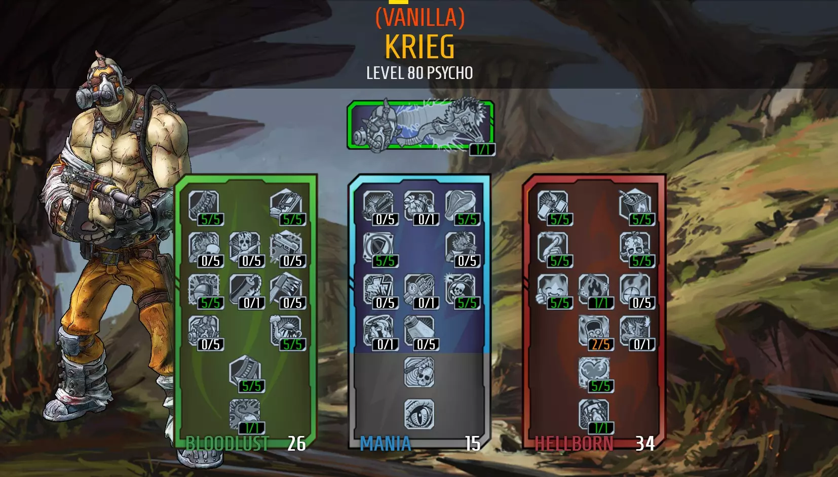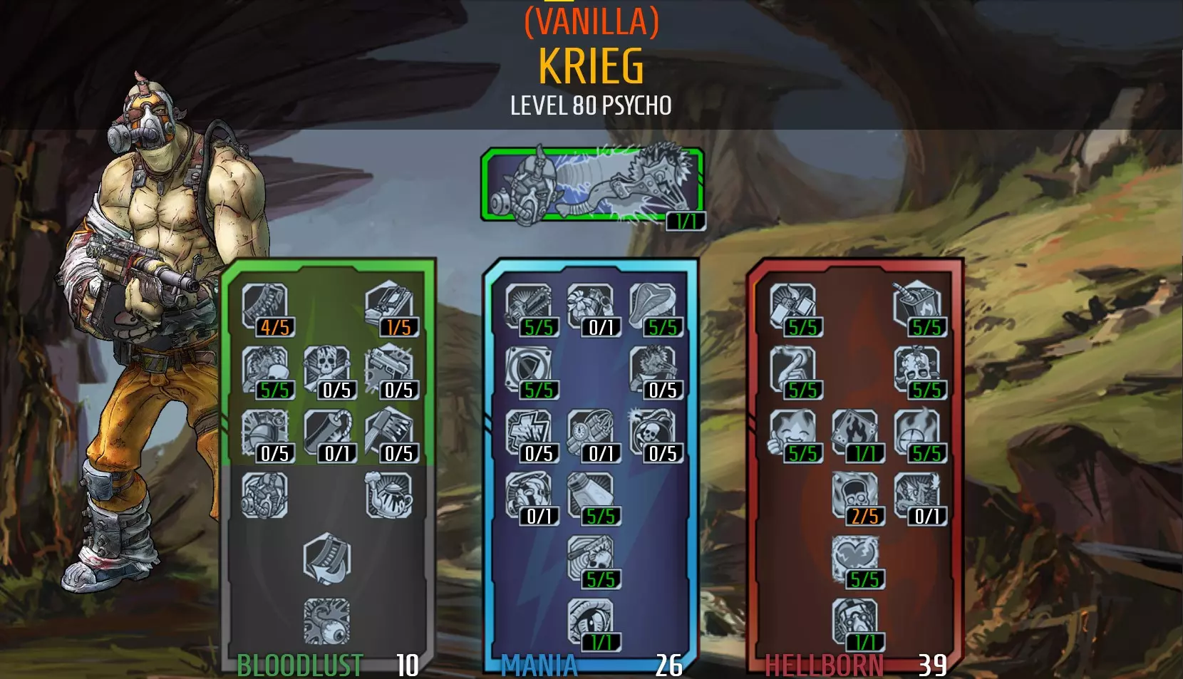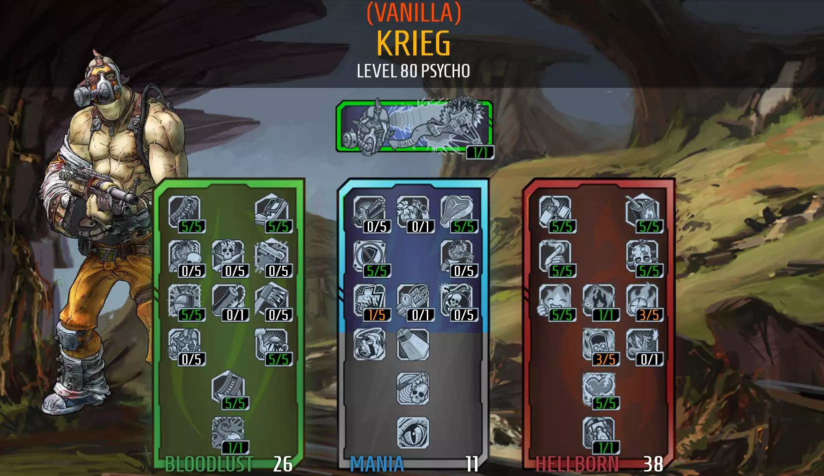 https://youtu.be/tc3u6H794H8 Tips: Focus on slagging things. your Raving Retribution will take care of the rest. Burn Baby Burn and your class mod will give you a big increase to your burn status effects (status effect damage refers to damage over time effects and slag). Your other elements will not receive any bonus damage but may still be beneficial against enemies resistant to fire. Otherwise you could just use an explosive weapon to dispose of them quickly. Pay attention to if enemies have shields equipped. Shields provide resistance to fire and corrosive damage and will need to be broken if you want your burns to hurt them. Grenades deal much higher status effect damage than weapons, but weapons can stack status effect damage faster. Elemental Empathy is a powerful skill, but only converts status effect damage to health. This skill will keep you alive of you can keep multiple enemies slagged and under status effect damage at the same time. This ability may fail if you only have 1 person ignited, or targets are resistant to the status effect applied. Avoid shields that have immunity to burn damage. They will stop you from being able to immolate yourself so you won't be able to get the bonus "on fire" stats. killing an enemy with a grenade or explosion will activate Bloodbath, giving you a massive boost (up to %500) to gun damage for a short time. The initial impact damage of Raving Retribution counts as explosive damage. Kills from status effect damage applied by grenades and explosions will not activate Bloodbath. Don't worry about the clips size of your weapons, Blood-Filled Guns and Elemental Elation will give huge boosts to magazine size. This also means you can better utilise weapons that are normally designed to deal massive damage but need to be reloaded often. It's much easier to apply status effects when you are on fire. Loot ammo and health vials after battles where you are missing health, so you're ready for the next fight. You're vulnerable at the start of fights while you're applying status effects, starting a fight with low health won't help. Increase your health as much as you can. This will help keep you alive when you don't have many active status effects, and surviving being on fire after fights. Your experience bar can only show up to 5 skills active at a time, but the other skills will still be active in the background (Blood Bath, Elemental Elation, Blood Twitch, Nervous Blood, Fuel the Fire, and Salt the Wound can all be active at the same time, but the game will only display some of their icons on the exp bar). Suggested items: Weapons: Moxxi weapons will provide additional healing. The Good Touch, Slow Hand, Grog Nozzle, and Ruby are good options. I use the Slow Hand to slag enemies. An Unkempt Harold is also useful for enemies that won't burn, especially when it's receiving bonus damage from Bloodbath. A rocket launcher such as a Nukem, World Burn or Norfleet can also be used to recover from Fight for Your Life. Shield: Rough Rider as it provides additional health and damage reduction. The Flame of the Firehawk will work for lower levels. Grenade: Firestorm or Antifection to apply status effect damage. The Fast Ball also works well to get grenade kills for bigger Bloodsplosions and to activate Bloodbath for increased blood damage. Class Mod: Legendary Torch Class Mod (best option), or Legendary Psycho Class Mod as it provides similar damage boost to ignite damage and more max health, but burns on yourself and enemies will not last as long. Relic: +Max Health (best), or +Fire Damage. Problems with this build: Occasionally you will die from self-immolation (after combat finishes) and there's nothing you can do about it but bite your nails and hope you live it. You can increase your chances of survival by: A) Maxing out Numbed Nerves for damage reduction, B) equip a fire damage resistance relic, C) use a damage reduction shield, and D) Avoid killing the last enemy too quickly so you can steal some last minute heals from Elemental Empathy before they die. The build is not as good against enemies that are resistant to fire. Don't over invest into fire damage and keep some other elemental weapons handy. Hellborn Psychos struggle even more against enemies that cannot receive status effects as you will not be able to receive any 'On Fire' benefits and Elemental Empathy won't work (no heals). These enemies are usually close to others that can receive status effects; try to keep these alive to maintain on fire effects and heal yourself. Gameplay Videos https://youtu.be/r-Uhzmma_QA Krieg - Hellborn Grenade Psycho I COOKED THE LITTLE RED ROCK AND THREW IT AT YOUR DEATH! With this build you can use grenades as your primary weapon. With this build you'll be running through mobs lobbing grenade after grenade with each kill giving you more grenades to throw until you're heart is content. You can do this 2 different ways -based around explosive or elemental grenades. This build uses the left tree for grenade skills, then the right tree for elemental damage. Damage: 8(solo) 5(co-op) Toughness: 4-8 (increases when on fire) Difficulty: 4 Fun: 9 Here's the skill tree: