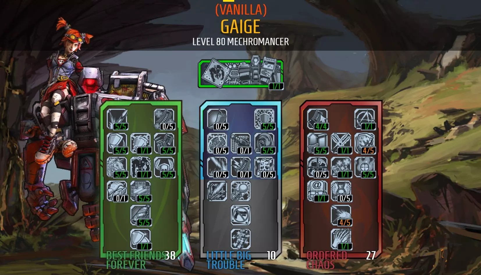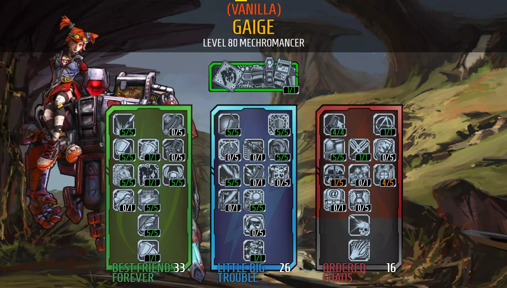 https://youtu.be/Hva7by5qsmg Tips: Deathtrap will use Robot Rampage as his first attack after he is summoned. This attack will deal double damage if he is charged with an element - Make it Sparkle. Keep Deathtrap charged with an element to double his damage. His elemental damage is equal to his physical damage. Increases to his physical damage will increase his elemental damage. This build requires the player uses a roid shield so Deathtrap can use his Sharing is Caring to receive a copy and deal crazy damage. Deathtrap will just be a bullet sponge without it and you'd be weaker than you would be with a different build. The good thing about this build is that Deathtrap gives you instant power; he doesn't need Anarchy to deal damage. Just run support for him while you're starting to accrue Anarchy so Gaige can deal damage. Dying is a real set-back when using Anarchy as you'll lose all of your stacks and have to start accumulating them again. The only 'sound advice' I can give here, is 'die less'. Nah, Just kidding; try to avoid tough fights without Deathtrap backing you up. Enemies are more likely to target Deathtrap, so you can hide behind him while he soaks up the damage for you. Deathtrap counts as an extra player, so team boosts also have an effect on him. You will need to get these boosts (like +attack speed) from other players as Gaige doesn't have much to offer herself (other than +team max health or +team elemental effect damage). Cooldown rate can be increased above 100%. 100% recharge will halve the wait time for your Action Skill. For Gaige, 6% cooldown rate is about 1 second faster. Deathtrap can activate your kill skills but he doesn't benefit from them (or any of your stats). Increasing Gaige's melee damage by any source DOES NOT increase Deathtrap's damage. Don't use a Hoplite shield when Sharing is Caring is unlocked as Deathtrap's copy will slow you down. Deathtrap can be healed by transfusion grenades but this will be quite minimal, Maya's Restoration, and Maya's Elated skill are more effective. Explosive Clap is an early game skill that is ineffective late game. Avoid unlocking The Stare and One Two Boom. Deathtrap is not intelligent when using The Stare and will target enemies resistant to fire and sometimes players. Deathtrap takes too long to charge and shoot One Two Boom and you will have difficulty shooting the orb to trigger the explosion due to your negative accuracy. Both are ineffective damage dealers compared to Deathtrap's melee attacks. Accuracy on guns doesn't matter much as your Anarchy will erode it. Guns with higher base damage will receive a greater damage increase from Anarchy. You won't be using a Bee shield with this build, so fire rate becomes less vital for damage output, but consider how many shots will be needed to hit your target. Getting in close to an enemy will slightly reduce your chances missing, and is worth the chance of scoring a direct hit for maximum damage. Ricocheted bullets will deal 50% less damage. Deathtrap sucks in boss fights as he will use his lightning bolt attack instead of meleeing them. Swap your roid shield out in boss fights for something that can keep Gaige alive or a Bee shield for extra damage. Suggested Items: Weapons: There will be times when Deathtrap is being a dumbass, so you will need a powerful weapon like an Unkempt Herald to carry him when he's not being useful. The predictable spread of the Unkempt Harold will also make it easier to hit enemies. Shield: The Hide of Terramorphous will give the largest boost to Deathtrap's melee damage, but a good purple Maylay shield will work fine if you can't farm Terramorphius yet. Grenade: Grenades don't really matter but they can be used to accurately kill enemies as they are not affected by Anarchy's negative accuracy stat. Class Mod: Legendary Roboteer Class Mod is the best option as it provides cooldown reduction, melee damage, toughness and movement speed for Deathtrap. The Legendary Mechromancer Class Mod can also be used but it will only provide cooldown reduction and melee damage. A regular Roboteer Class Mod is also viable. Relic: Use an Action Skill Cooldown relic to help Deathtrap recharge quicker. Problems with this build: Deathtrap is only effective while he is meleeing things. He's useless against flying enemies and most bosses as he will use his lightning bolt attack instead, which doesn't deal damage late game (seriously, he can't even kill a surveyor bot with this skill). You can't tell him who to target or recall him to reset him, So if he attacks something he can't kill (like a Stinging Cactus), he'll stay locked onto it until he expires or you move a great distance away from him. If possible, kill the target he's electrocuting so he can pick a new target. There's no way to return Deathrap when he's no longer needed (unless you change zones or jump into a vehicle) and his cooldown only begins after he dies or despawns. This means there will be times when you'll be on your own and you won't be benefitting from all of the points you've invested into him. I've managed to reduce the cooldown time to 23 seconds, which isn't bad. You can always use your Anarchy to kill things without him if you need to do something while you wait! You will have difficulty hitting flying units due to your negative accuracy. Try to avoid fighting flying things. If you have to fight them, use grenades or shoot at them (or the ground to richochet bullets) when they're flying low. The Mechromancer is a class that really doesn't have skills to increase her damage output other than Anarchy. This means all Mechromancer builds will play the same way and suffer from 'no accuracy'. You simply won't deal enough damage without Anarchy, but you can balance it around 250 stacks if you can't stand not hitting things. You can't run a Bee shield with this build, as Deathtrap newds the roid damage. Gameplay Videos: https://youtu.be/ztbfujyWHGU Gaige - Catalyst (Not Reccomended) Ugh, got some br