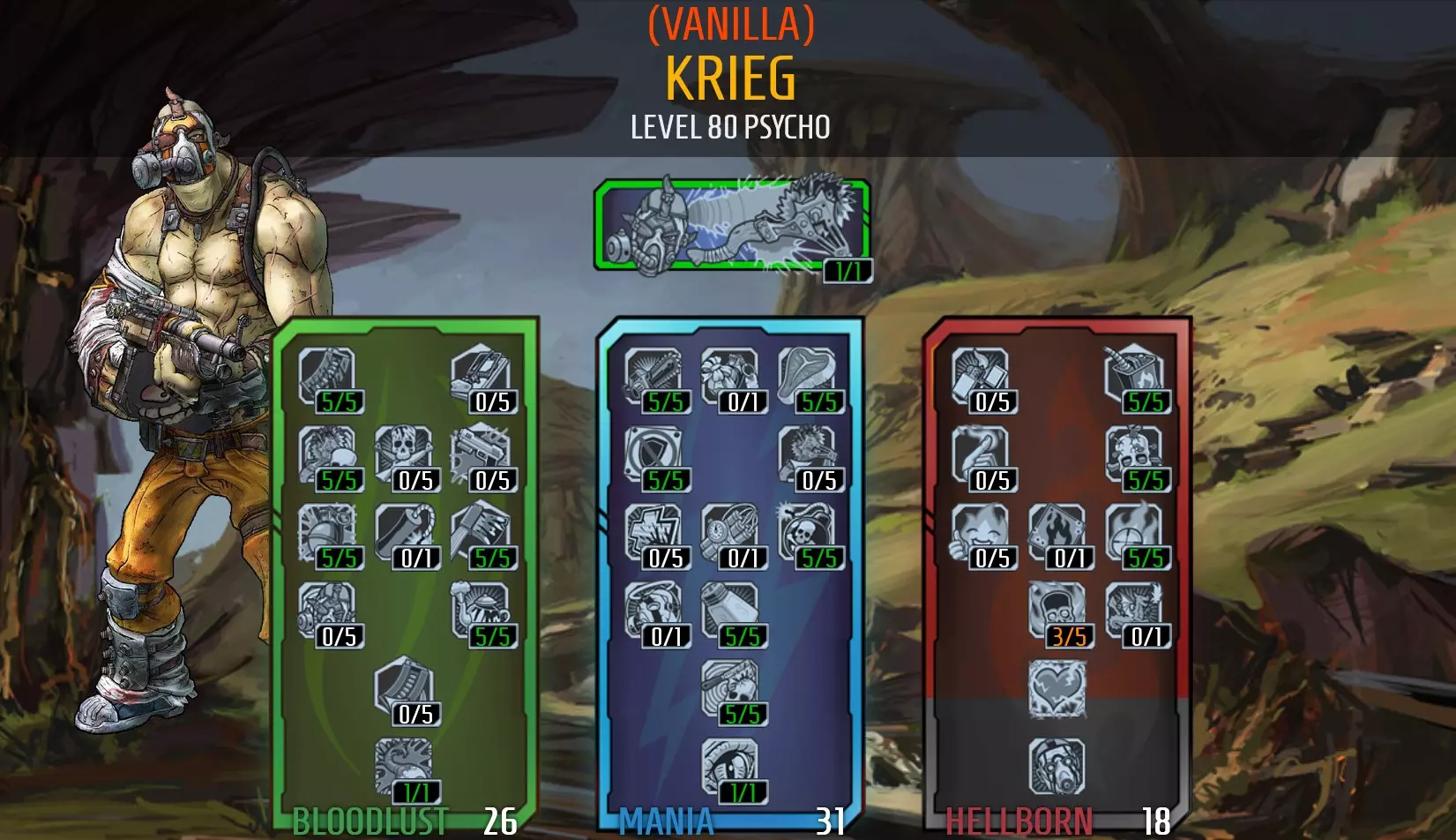 https://youtu.be/_qUNg-zpMbk Tips: Your power scales with Bloodlust stacks. Bloodlust stacks can be accumulated by dealing constant damage to enemies but start to decay quickly when you stop dealing damage. Applying status effects and using high fire rate weapons can help you to accumulate bloodlust stacks quickly. Killing an enemy with a melee attack activates Fuel the Blood, which will greatly increase your grenade damage for a short period of time, but you would have to invest most of your skill points into melee damage skills to make this skill viable, so it has not been selected. Killing an enemy with a grenade or explosion will activate Blood Bath which will cause enemies to drop grenades and significantly increase your gun damage for a period of time. Killing enemies with Bloodsplosion and the initial impact of Raving Retribution's homing fire balls count as killing enemies with explosions and will also activate Blood Bath. Using a class mod that extends your kill skill duration will help you to better utilise kill skills such as Blood Bath. You can run this character with all 5 elements if the elements on your guns are different to your grenade; so you can always play to your opponents weaknesses; but only your fire damage will be receiving bonus damage. Use shields that give +health as shield capacity won't last long and will not recharge as you will be receiving burn damage from being 'on fire'. Also avoid shields that have immunity to burn damage, as they will stop you from being able to light yourself on fire and get the "on fire" bonuses from your Hellborn skill tree - this would also prevent you from using your best skill - Raving Retribution. Grenades aim off-centre to the left of your cross-hair with most guns equiped. This is important when using the Fast Ball grenade mod. Grenades aim at the centre of your cross-hair when a rocket launcher is equiped. Lightning type Chemical Sprayer grenades are safer to use as they will not hit you when you're running inside their area of effect. Careful when using the Quasar or Electric Chair grenades though, as the explosions caused by these grenades will hurt you, even if their chemical sprayer component does not. Avoid using Bouncing Betty grenades as they deal damage by 'spraying bullets'. Kills achieved with bouncing betties will not count as killing an enemy with a grenade or an explosion, because you're actually killing enemies with bullets. Damage reduction sources start to lose their effectiveness when multiple sources are applied. Numbed Nerves and a Rough Rider shield will provide enough damage reduction to stay alive with this build, additional sources will reduce damage further but not by much more. Krieg's abilities allow him to exceed 100% damage reduction, but he will still take damage because the game calculates damage reduction by carrying incoming damage through all sources of damage reduction in turn, instead of cumulatively (You won't have 145% damage reduction, you will have incoming damage-75%=value-50%=value-20%=total damage reduction). This simply means you cannot be invulnerable unless you receive 100% damage reduction from a single source. Suggested Items: Weapons: The Good Touch, Slow Hand, Rubie and Grog Nozzle are ideal weapons as they can apply fire and slag elements, and convert a percentage of damage dealt to healing. Slag is preferred to amplify damage. Other elements can be used to heal when enemies are resistant to fire. An Unkempt Harold can come in handy for enemies that are immune to damage over time effects (i.e Constructors). The Logan's Gun or the Thunderball Fist are useful (but not effective late game), as the explosions caused by these guns will cause enemies to drop grenades. Shield: the Flame of the Firehawk will work at lower levels but loses its effectiveness late game. The Rough Rider will increase your health and provide damage reduction that will keep you alive late game. Grenade: Chemical sprayer grenades are easy to find and fire types will deal significantly more damage but electricity will let you enter it's radius unharmed which makes it easier to draw enemies into it. It also kills enemy shields so you can better deal damage with your fire and corrosive weapons. Sprayer grenades will be effective up until ~level 55. After that, you'll need something that hits harder such as an elemental Fast Ball. The Fast Ball will 1 or 2 hit most slagged enemies and trigger greater Bloodsplosions damage. Bloodsplosion will deal additional damage to slagged enemies, and can chain further from the enemies it kills. Class Mod: Legendary ReaperMod or Blister Class Mod. These class mods will extend the duration of killskills, so you can reap the bonus gun damage granted by Blood Bath after getting a kill with grenades or explosions. Relic: +elemental damage relic, +health can also be beneficial but less preferable. Problems with this build The build works best when playing solo as enemy health will increase as more players join, this will mean you will need more grenades to kill things and your pool of grenades will dry up quicker. Also, other players will become excited when they see how many grenades are being dropped and start burning through grenades themselves, so there will be fewer to go around. This problem can be managed by focusing more on using your elemental weapons and saving grenades for weaker enemies or to finish off enemies to activate your Blood Bath skill for more gun damage. Sprayer grenade damage dropped off around level 52-55. After that, swap to a Fast Ball for additional damage. You will occasionally die from self-immolation. Fortunately, Borderlands 2 is a game where dying doesn't really matter. I've learnt to enjoy the psycho's self destructive behaviours but if it does annoy you, you could swap the +elemental damage relic with one that gives you +health or +fire resistance. Krieg's Elemental Empathy is not very effective against slag resistant/immune enemies -so be more 