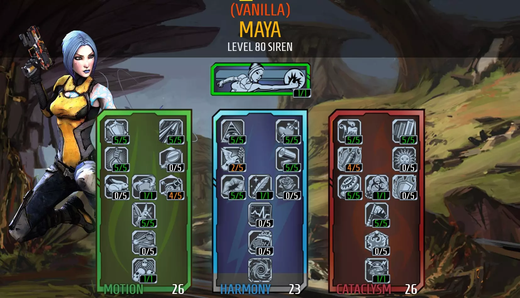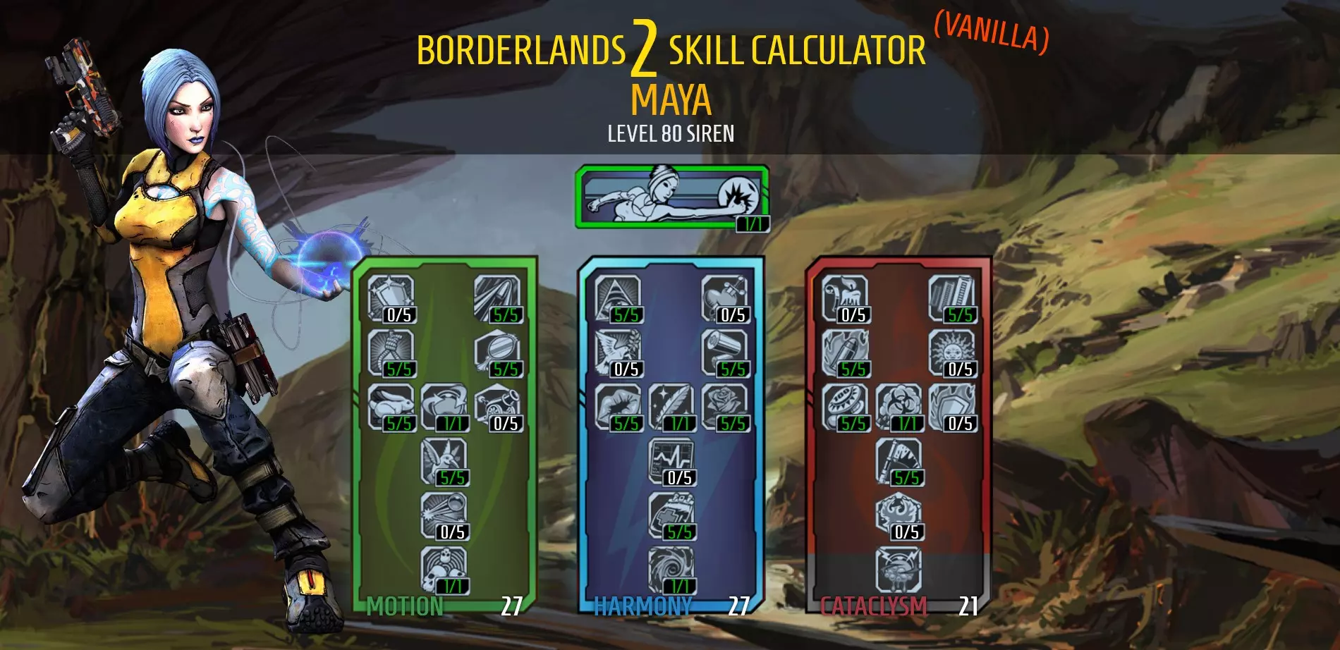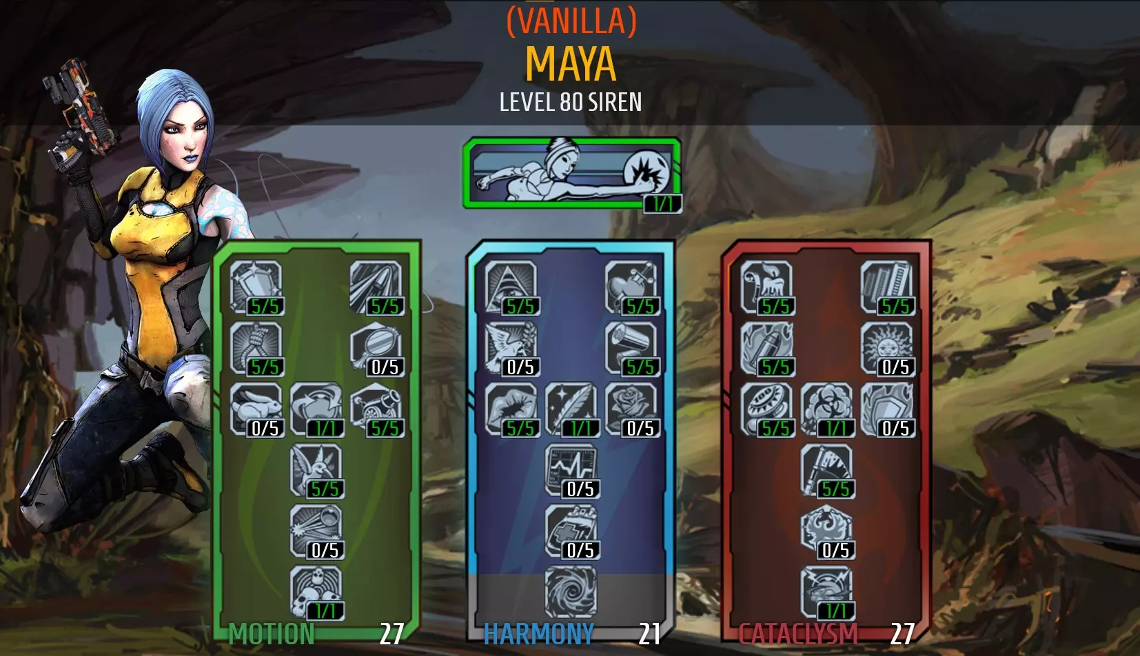 Note: This build only need points in Fleet. https://youtu.be/F7ss1DajQXQ Tips: Consider including Fleet in another Siren build so you can swap between your Banshee class mod and Rough Rider shield when you want to gain the Fleet Siren's speed boost, and swap to your main class mod and shield when you want to deal more damage. Sweet Release provides good healing when you're below 50% health, but the health orbs move too slowly to catch you when you're using Fleet. You will need to wait for the health orbs to reach you on run towards them if you want to use Sweet Release with your build. Suspension and Thoughtlock work well together as you will be able to hold a target 19.5 seconds. You will also heal 5% of your health each second while an enemy is Phaselocked if you have unlocked Elation. Thoughtlock can be used to distract other enemies, as they tend to prioritised attacking Thoughtlocked targets over players. Using Thoughtlock to distract enemies can be handy for running through crowded areas when you're trying to skip content. Also consider increasing your Action-Skill Cooldown Rate so it's ready to use before you run through the next area. It's worth investing into abilities that heal Maya to keep her alive while she is using the Rough Rider and has no shields. Life Tap is a useful healing ability and it pairs well with Recompense and Kinetic Reflection as you will heal a percentage of damage these skills reflect back at attackers. These skills are more useful if reflected damage is hitting slagged enemies. Life Tap only needs to keep you alive until Thoughtlock is ready to use again. Be careful when using Skorn, as it moves slower than you can run with Fleet. Avoid casting Skorn while running forwards as you will run through the projectile, causing it to explode and slag yourself. Skorn has a moderate cooldown and isn't always reliable, so bring a slag weapon just in case. Ruin is a good substitute as it is reliable for slagging, but you will need to give up Life Tap for Flicker. Recompense will be less useful without Life Tap, so consider moving points from Recompense to Sweet Release for an alternative source of healing. Blue level 50 Banshee Class Mods are the highest quality mods you can find for this build as they can give +6 skill points to Fleet and don't decrease your health as much as higher level mods. You also will not benefit from the +shield recharge rate and -shield recharge delay stats that higher level class mods offer. Suggested items Weapons: Moxxi weapons will provide some additional healing - Miss Moxxi's Good Touch has been a reliable weapon. The Unkempt Harold also packs a punch. Bring a slag weapon as Skorn isn't always reliable. Shield: Rough Rider Grenade: Firestorm grenade for some additional status damage and almost instant healing while Life Tap is active and to AoE nuke enemies after they have been grouped with Converge and slagged with Skorn. Class Mod: Blue Level 50 Banshee Class Mod with +6 to Fleet. The Breakneck version provides the better secondary skill. Relic: Skin of the Ancients will give you +Action Skill Cooldown Rate and +Elemental Damage (Best Option), otherwise look for +Action Skill Cooldown Rate (preferred), +Damage to preferred weapon (2nd pref), or +Max HP(3rd pref). Problem's with this build: This build works for guerrilla tactic fights and isn't good for boss fights. The build also struggles against enemies that cannot be Phaselocked as you cannot receive healing from Elation. Fire elemental damage is good against flesh - that's you without shield protection. Prioritise eliminating enemies dishing out fire damage. This build only heals through combat (and Dr Zed Vendors). It's risky trying to recover health when you're already low. I was initially using Sustenance to counter this but then got rid of it because it wasn't have a big impact. The build sacrifices damage and toughness for speed. Using an interchangeable build will reduce power loss for your character. Video Guide: https://youtu.be/vE56yvQ7L_M https://youtu.be/0clPHaKy0m4 https://youtu.be/eCZwlhMGQKE Maya - Vampire* Oops, this build is outdated and is being reviewed. check back soon! 17/05/2022 "While others wither, I grow stronger" There's some seemingly useless skills in Borderlands 2, but even those skills can become useful when paired with another. Recompense and Blight Pheonix are pretty bad skills on their own, but when you pair them with Life Tap you get a Vampiric Siren. Just kill something to activate Life Tap and then hurt your enemies to heal. Here's the skill tree: Tips: You should use class modsthat increase Life Tap to get the most out of this build. Alternate between Phaselock and Skorn to slag without needing to switch to slag weapon or use grenades. Avoid weapons with long reload times or that need to be reloaded too frequently as this is when you're most vulnerable of getting knocked down. Blight Pheonix will be useless if you're not getting up close to your target. Some points in Fleet will help with this. Be very careful when recovering from Fight for your Life as you will revive with no shields and low health. You will recover with your kill skills active so you can be aggressive to steal health or seek cover until you have a plan/opportunity to engage. If you're not able to chain a kill before your kill skills deactivate, you may need to consider upgrading your weapons or using something to sustain your health until you can get your next kill (i.e. Elated or transfusion grenades). The pulsing noise Life Tap emits was annoying at first, but you get used to it. It's far less annoying when you consider it a useful audial way to tell when your kill skills end (when it stops emitting noise). You're safer when it's pulsing. Trickster class mods can increase your Life Tap and Kinetic Reflection. If you can boost your Kinetic Reflection to 10 points you will gain 100% damage reduction and bullet reflection -making you bullet proof until the kill skill wears of