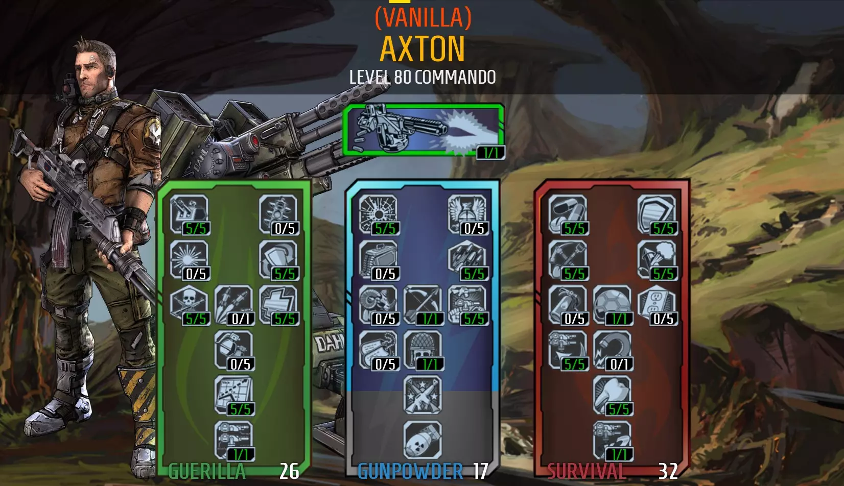 我玩过很多《无主之地2》。我对角色技能树的尝试越多,就越欣赏和享受这款游戏。我制作了本指南来分享一些配装。希望你喜欢 :) 简介 欢迎 《无主之地2》一直是我最爱的游戏之一,我确实玩了很久。本指南包含了我尝试过的所有成功配装(还有一些没成功的就没放进来)。每个配装都会包括:评分、技能树、游玩技巧、推荐装备以及一段实机演示视频。总的来说,本指南旨在展示配装的多样性,并通过我亲自从1级练到72级+OP等级的可靠配装,为大家提供其他的游戏玩法,这些配装均未使用模组、修改文件或漏洞。这些配装已在80级OP10难度下重新测试,确保在【小缇娜强袭龙堡】更新后仍可正常使用。 本指南内容较多,请使用滚动条或目录菜单跳转到您想查看的部分。 希望您能找到喜欢或有用的内容。 猎宝人们,玩得开心! 请注意: 我使用【Borderlands 2 Skill Calculator】来展示角色的技能加点方式。 如何构建配装 新手需要了解的技能树知识: 技能树采用层级系统,每在一个树中投入5点技能点即可解锁下一层级。 每个技能树的最后一个技能是【质变技能】。技能树中还有其他只需投入1点即可点满的技能,它们也能提供特殊增益。带有六边形边框的技能是【杀戮技能】——当你击杀目标时,它们会激活一段时间(约8秒)。 通常情况下,将技能点完全投入到一个技能中比分散加点以解锁所有技能更好。 你可以在31级时到达第一个技能树的底部。在57级时,你将能够使用其中两个技能,但在最高等级80级时,你无法获得第三个。 你可以随时在【自定义站】通过点击【重置技能点】选项来重置你的技能点。你可以多次进行此操作,且不会花费太多游戏内货币。 如果你对技能选择感到困惑,想要一个简单的选择方法,可以先查看每个技能树的最后一个技能,然后选择你最喜欢的那个。接下来,将你的点数投入到该技能树中;在通过层级系统逐步解锁至最后一个技能的过程中,你每次只需在两个技能之间做出选择。 如何构建流派: 构建流派始于一个想法,然后是使其实现的决心。 寻找能够相互配合的技能。 基于装备类型或偏好的游玩风格来构建。例如:你可能想使用霰弹枪或增益护盾,你可能喜欢近距离击杀敌人,或使用远程攻击、支援队友,或是成为主要伤害来源。 围绕你找到的职业模组来构建。《无主之地2》中的职业模组都有特定主题。如果当前构建与你不匹配,你总能找到新的职业模组。你甚至可能偶然发现一种配装。还有一点……你可以打造适配多种职业模组的配装,这样就能根据需要切换符合条件的职业模组来改变自身优势。例如:魔女可以装备一个侧重辅助技能的模组,然后通过切换到带有伤害技能的模组(无需重新分配任何技能点)来转为进攻型。这只有在你解锁了两种职业模组所需的全部技能时才有效。 艾克斯顿——传奇士兵(最适合输出) “十年达尔军事经验为你效力” 这套配装利用艾克斯顿的技能、职业模组、圣物和护盾来尽可能提升他的伤害。这个流派比其他“玻璃大炮”流派更容易上手,因为艾克斯顿的炮塔可以用来吸引敌人注意力并施加slag(腐蚀)效果。 伤害:9(可单人挑战无敌的哈迪拉克) 生存能力:4 难度:2 乐趣:7 技能树如下: