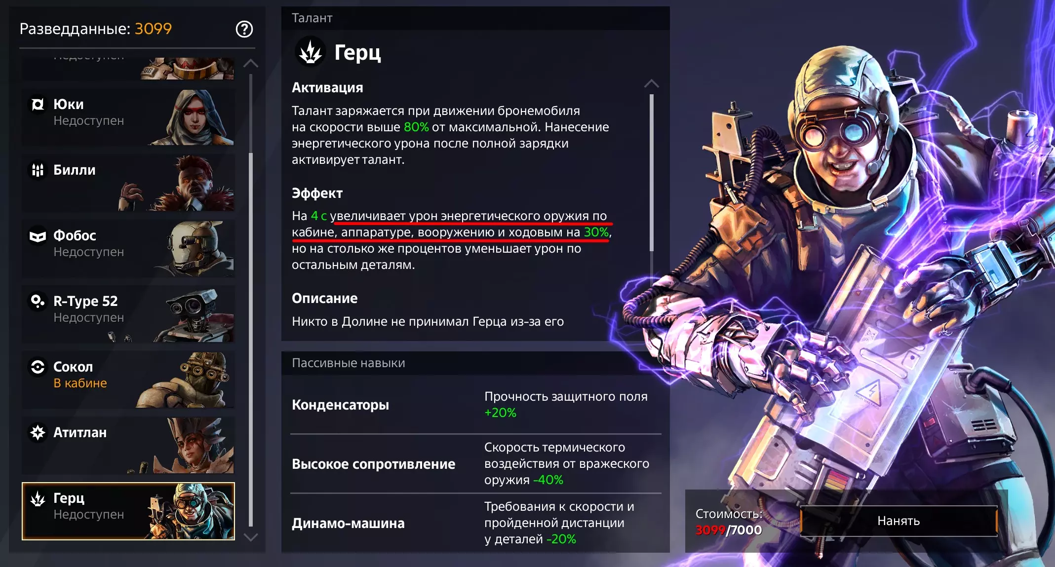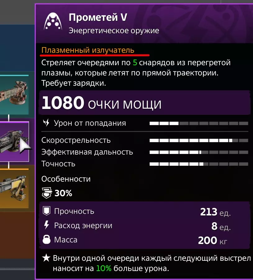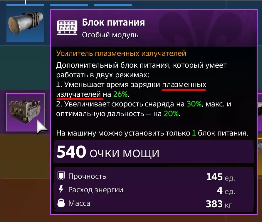 假设我们选择了这位驾驶员,这意味着要使用能量武器。 安装3门武器(等离子发射器类型),并为其配备模块【电源块】——如上方表格所示,再添加一个带有能量伤害加成的驾驶舱。