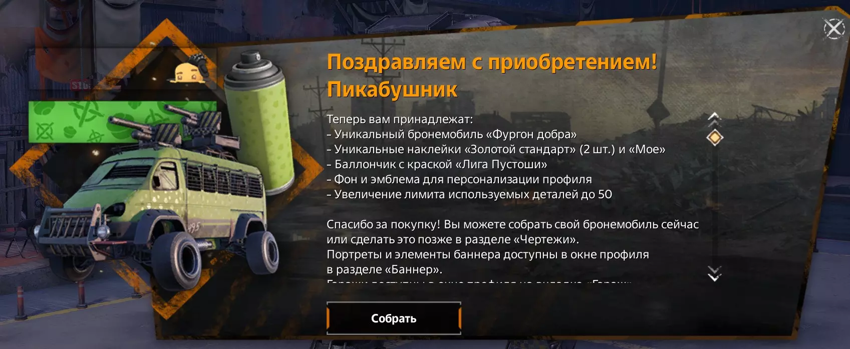长号的生产成本约为200。活动期间售价为300,活动后售价为500,而当它作为组件参与活动时,价格飙升至800。也就是说,这里的利润率为300%。请记住这一点。但是通过购买某些套装并出售它们,你可以获得4单位游戏货币兑换1卢布的收益。 出售资源。在早期阶段,你能快速积累机械师声望。每升一级不仅会给你新零件,还会给你汽油,汽油用于突袭。因此,一旦你获得突袭的访问权限,就可以立即前往。那里的机械师声望积累速度更快,而铜可以选择出售或用于生产。汽油是一种资源。仓库里的汽油只有在3级突袭任务中使用才划算,其他情况下最好卖掉。你可以在普通任务战斗结束时获得汽油,前提是你获胜并存活下来,且你的车上还留有油桶(小油桶、大油桶或两者都有)。新手不易注意的事项 要完成在车库打招呼的任务,你需要有好友。 战斗结束后,你可以添加顶尖玩家为好友,或者给他们发消息询问他们使用的武器。