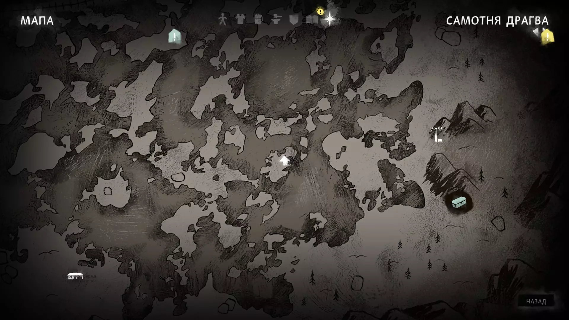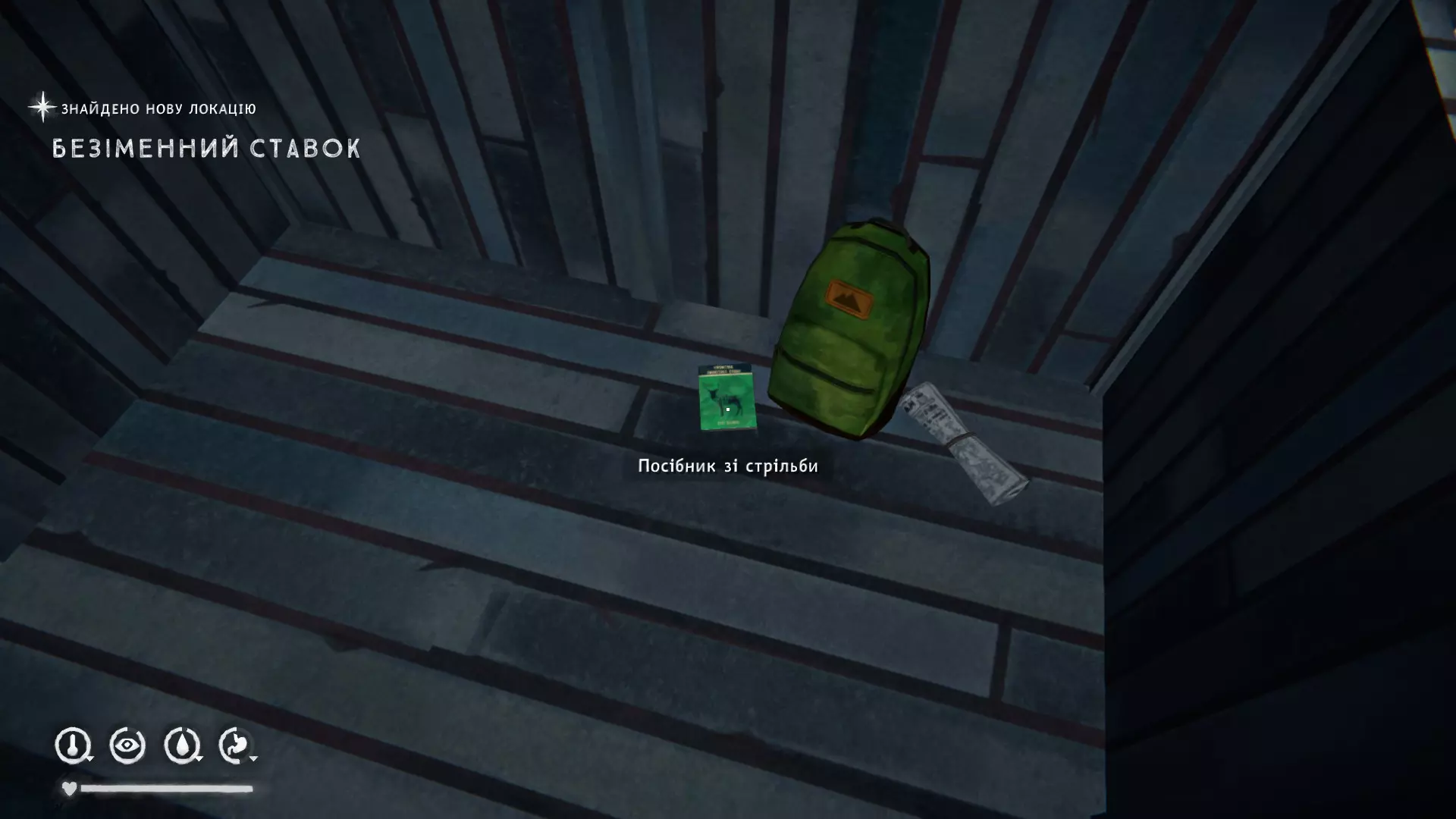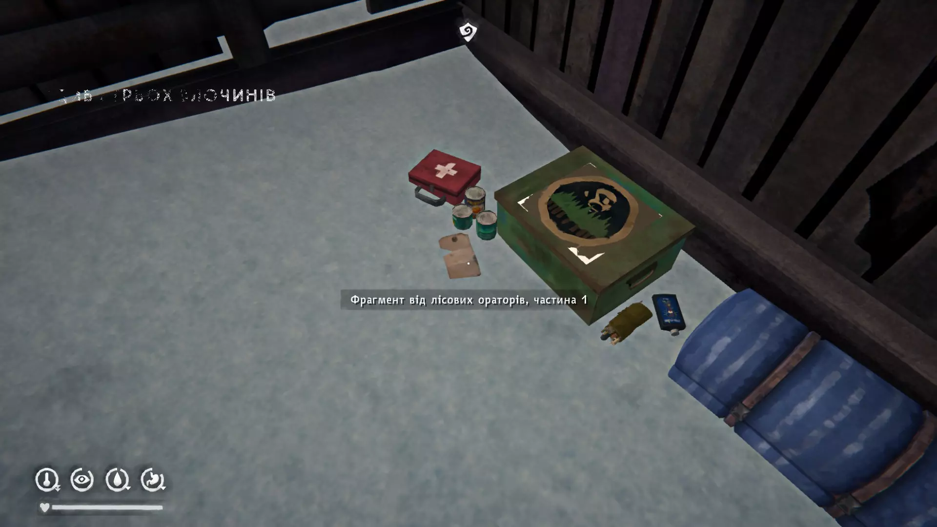 孤狼德古拉 4) 在翻倒的车厢旁的地面上,以乌鸦为参照物。位于关卡起点附近的低处。里面有登山袜、羊毛衬裤、信号军刀、针线包和水瓶。