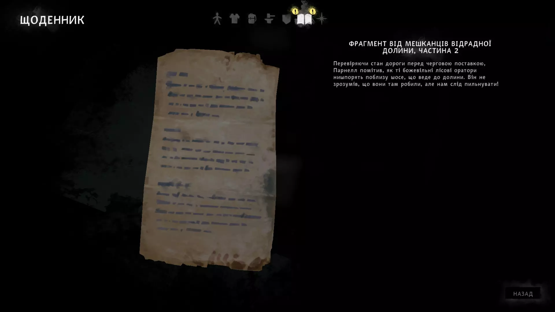 需要额外向冰箱补充12000卡路里,并带回可维持24小时的木柴。奖励:纸条所在地的樵夫外套。第二章