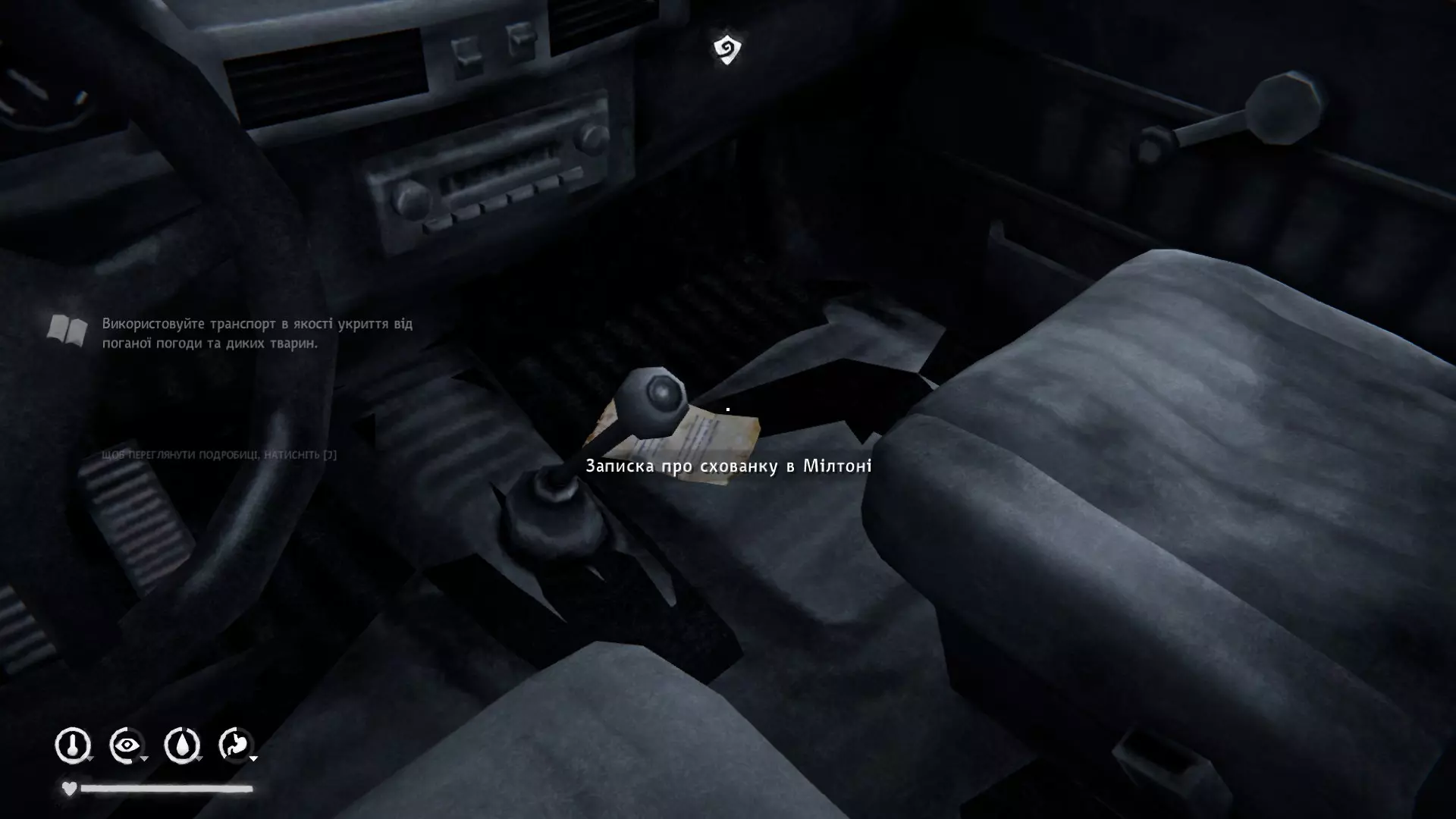 【隐藏物品大师(第一章)】 找到第一和第二章中的所有隐藏物品。 隐藏物品的坐标会显示在你的地图上,而要找到坐标需要阅读笔记。 1. 在米尔顿中心的车里。教堂后面靠近大树枝的地方。里面有灯油、缝纫工具包、布料、干肉条和应急兴奋剂。