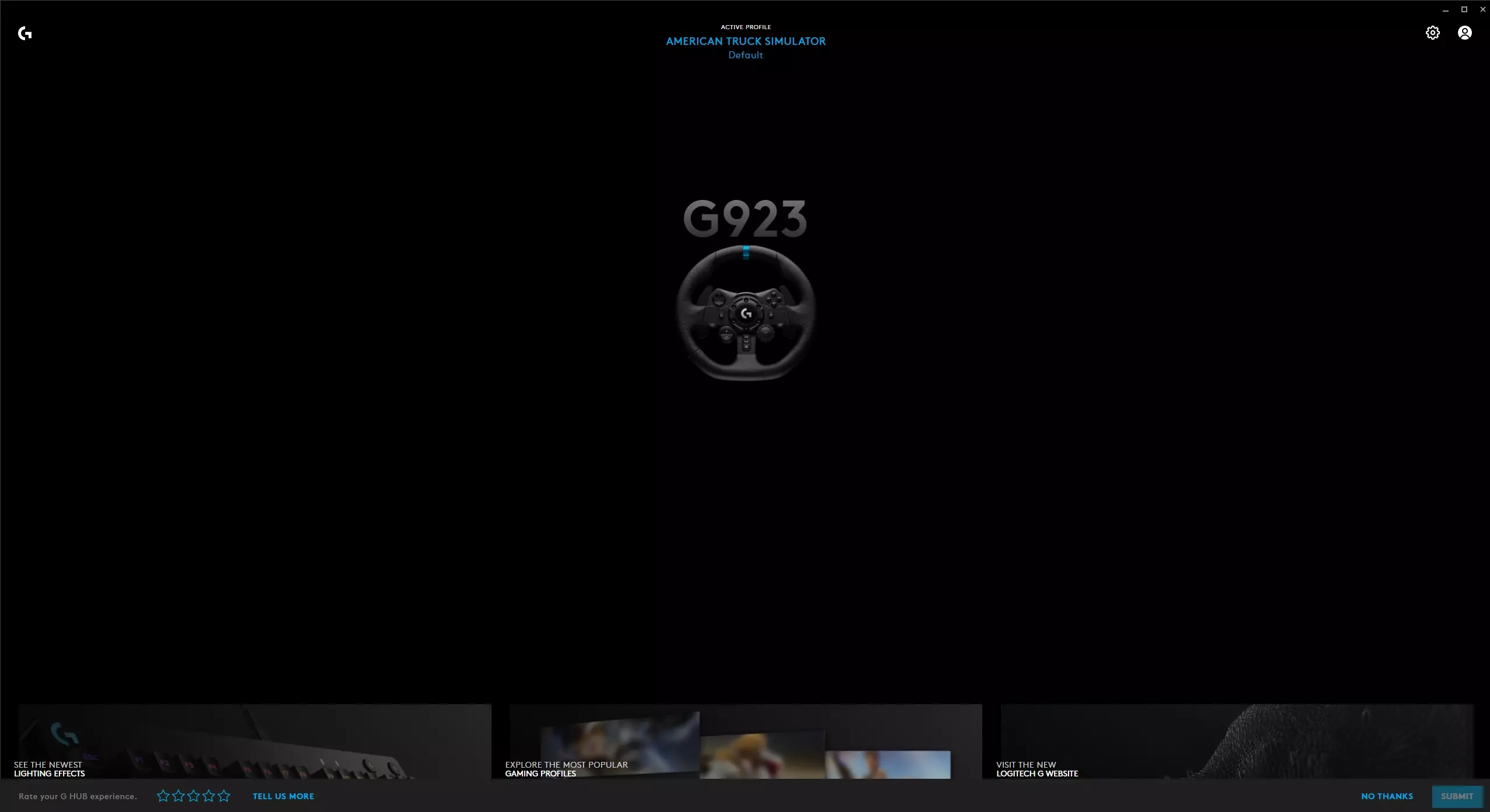 Logitech G HUB 你需要先下载Logitech G HUB,以确保你的方向盘在电脑上正常工作。(请注意,只有Win10支持G HUB。) 对于G27及更早型号的用户,由于G27已停产,G HUB不支持该型号,因此你需要下载Logitech Gaming Software。 我不确定本指南中使用的方法在使用Logitech Gaming Software而非G HUB时是否对你有效,因此建议你先尝试单独使用Logitech Gaming Software的默认设置,看看是否可行,如果不行,再尝试按照指南中的方法操作。 安装并设置好G HUB后,你应该能在其中看到你的方向盘。点击你的方向盘并转动它,确保其能被正确检测。