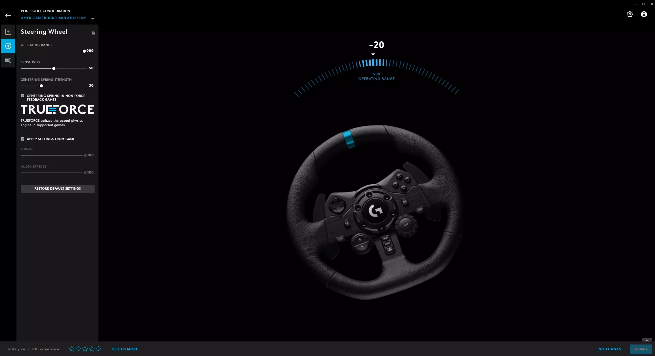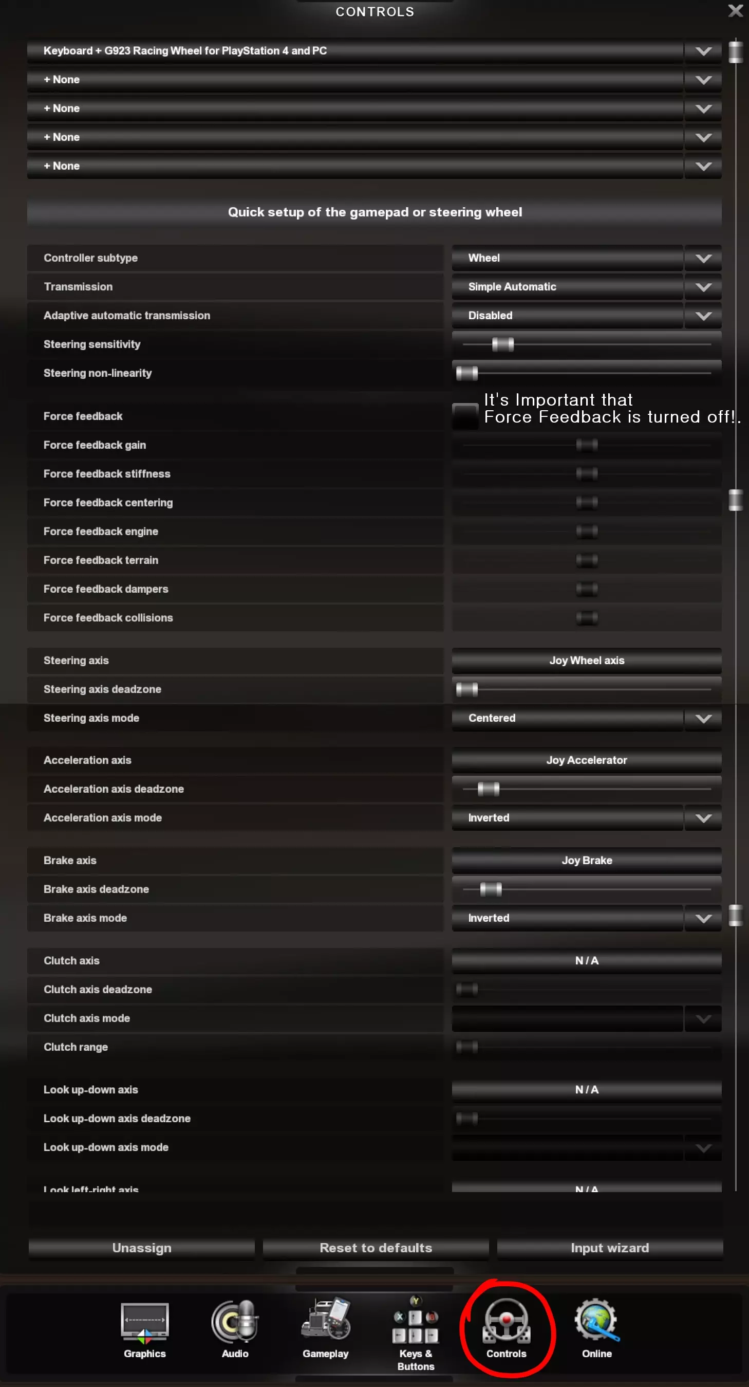 如果你遇到力反馈或自动回中问题,我或许能帮上忙。 我最近重新开始玩《欧洲卡车模拟》和《美国卡车模拟》,并新买了一个G923方向盘,但很快发现自动回中功能无法正常工作,我花了5个多小时才找出问题所在。 所以如果你有类似的力反馈或自动回中问题,我或许能帮你解决。你只需按照我的说明操作并复制我的所有设置,等方向盘正常工作后,你可以随时根据自己的喜好调整设置。