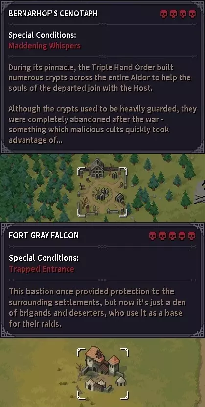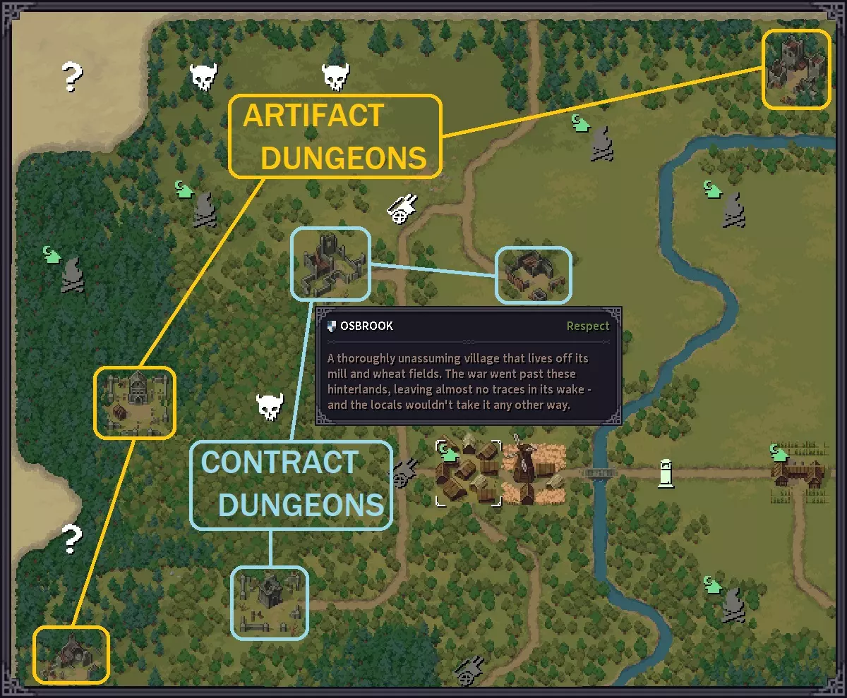 随着最近的RtR更新,所有地下城都新增了1-5个骷髅头的固定难度分级系统。神器本身仍然只能在遥远地下城找到,这些地下城现在的难度等级为4-5个骷髅头。此外,高难度地下城现在带有特殊条件,例如进入后入口会被锁定,或者存在会让英雄咳嗽并惊动敌人的瘴气。 神器的生成位置保持不变(位于小 boss 房间内的宝箱中),但与之前不同的是,打开神器宝箱时不再生成神器。现在,当你走下楼梯进入遥远地下城的下层时,神器会与地下城一同生成。如果你对获得的圣遗物掉落不满意,或者根本没有获得圣遗物,你需要重新攻略该地下城的较低层级,确保在进入前进行存档。当你加载该存档并重新进入最低层级时,游戏会生成一个新的地下城和新的潜在圣遗物。 附:此列表目前并不完整,由于游戏仍处于抢先体验阶段,后续会进行更新。