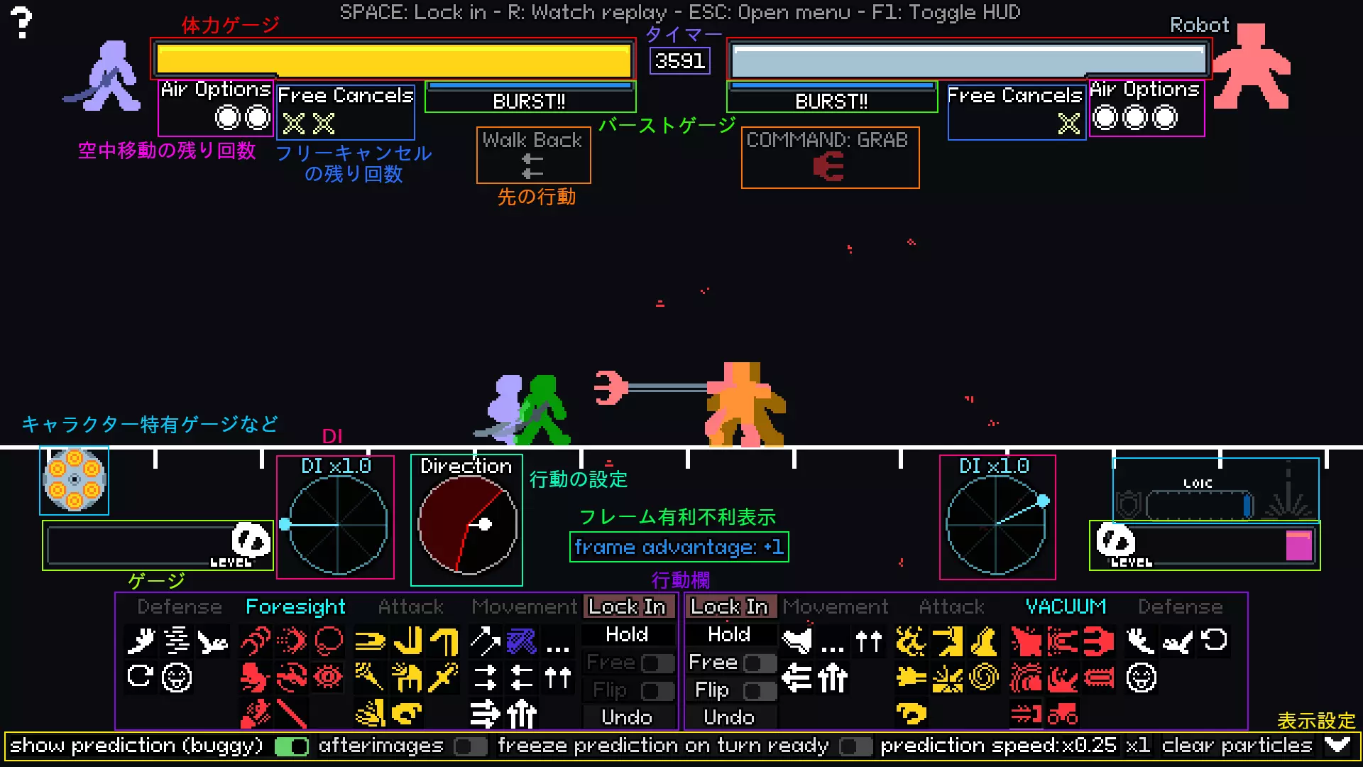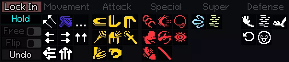 【Lock In】是确认按钮。点击后角色会实际执行当前选择的行动。注意一旦点击便无法取消。 【Hold】是“继续执行当前行动”的指令。有时在行动过程中会出现行动选择机会,若想继续当前行动,可选择此指令。 【Free】可选择是否进行自由取消(自由取消的说明在“攻击”的描述中)。 【Flip】可反转行动的执行方向。 【Undo】是仅在单人模式和回放模式中存在的按钮,用于取消上一步行动,将对战回溯到之前的选择机会。在说明行动项目之前,有一个系统需要作为前提进行说明。行动大致分为两种类型:“在结束前几乎无法进行任何操作的行动”和“即使未结束,只要对手获得选择机会,自己也能获得选择机会的行动”。在本指南中,暂时将它们称为【束缚行动】和【自由行动】。需要注意的是,自由行动仅指“只要对手获得选择机会,自己也能获得选择机会的行动”,完全有可能在对手的下一个选择机会之前受到攻击。 【移动】:不同角色之间存在差异,但所有角色都拥有“前移”“后移”“跳跃”“超级跳跃”和“等待”动作。除跳跃和超级跳跃外,基本可以自由行动。在空中可以进行「空中跳跃」和「空中冲刺」等动作,执行这些动作会使画面上方的空中移动剩余次数减少1次。次数变为0后,在落地前无法进行空中移动。 「Attack」(攻击)和「Special」(必杀技):这两种攻击没有特定区别,但「必杀技」包含较多特殊技能(如飞行道具、投技、姿态技能、设置技能等)。所有技能都是束缚技,但在确认选择前开启「Free」选项,可以消耗1次自由取消次数来进行自由行动。不过无法对不直接攻击对手的技能(如飞行道具等)进行自由取消。当任意一方角色受到攻击时,双方的自由取消次数都会重置为2次,因此若使出的攻击没有命中,或者在命中前对手有哪怕一丝反击的机会,都建议积极使用自由取消。 「Super」(超必杀技):消耗能量槽释放的技能。每个角色的超必杀技都各不相同、种类丰富,这里就不一一解说了,但有一点需要特别指出,那就是初学者容易误用的情况——在自身攻击挥空时使出的「Whiff Cancel」(挥空取消,或称空取消)。这是一个消耗约70%爆发计量槽就能立即采取其他行动的强力技能,但可采取的行动仅限于各种攻击和什么都不做,因此在使用这个技能之前,十有八九还是先使用自由取消更好。 【防御】:所有角色统一拥有【上防】【下防】【回避】【快速起身】(只有牛仔还有【原地回避】)。此外,受到攻击时还能发动【爆发】。 大部分攻击都可以用上防防御,但所有角色都有1到2种只能用下防防御的攻击。在空中时使用的防御无论上下都有效。所有防御都是较长时间的束缚行动,因此当自己选择“防御”而对手选择“等待”等行动时,会在一段时间内处于无防备状态。在特定情况下(主要是对手选择攻击的同一选择时机选择防御,以及在飞行道具等即将命中的前几帧选择防御时)防御攻击,会触发“完美防御”,并产生华丽的蓝白色特效。完美防御有两个效果:“成功完美防御的玩家可以立即行动”和“被完美防御的攻击将无法进行自由取消”。也就是说,大多数完美防御都会直接转化为单方面攻击对手的大好机会。 hustle就是所谓的挑衅。由于可以自由行动,所以中途可以切换到其他行动,但如果能不间断地完成当前行动,就能积攒1格计量条。 爆发技是在受到攻击时消耗100%爆发计量条释放的反击技能。它能将对手击飞并强制中断其连击。不过,如果对手预判到爆发技并进行防御或回避,就会再次陷入新的连击,导致局面变得非常不利。不同的行动有详细的设置(如释放方向等),这些设置会显示在行动栏上方,记得在按下确认按钮前进行设置。 预览及其显示设置 预览是顺利游玩YOMIH时非常重要的功能,下面说明其设置方法。