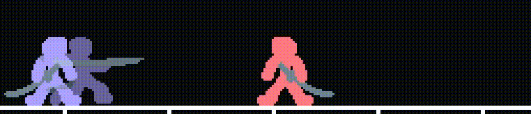 这个GIF是左侧角色发起攻击、右侧角色处于等待状态的预览画面。从开始到中途,右侧角色都显示为红色,在攻击命中后不久才变为橙色。这意味着在变为橙色之前,玩家没有选择机会(严格来说,如果爆发计量条已满,则可以发动爆发)。而左侧角色在攻击命中时从紫色变为绿色,此时玩家获得选择机会。虽然会显示“Ready”字样,但在游戏内消失得很快,有点难以辨认。 相比之下: