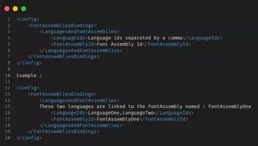 【可选】用于链接自定义字体的“config.xml”文件 此文件并非本地化模块的必需文件。目前,其唯一作用是将语言与字体程序集(参见“制作字体模组”)相关联,以便将自定义字体链接到你的本地化内容。 因此,只有当你需要或希望为本地化内容使用特定字体时,才需要此文件,且需事先创建字体模组。 该文件必须遵循以下格式: